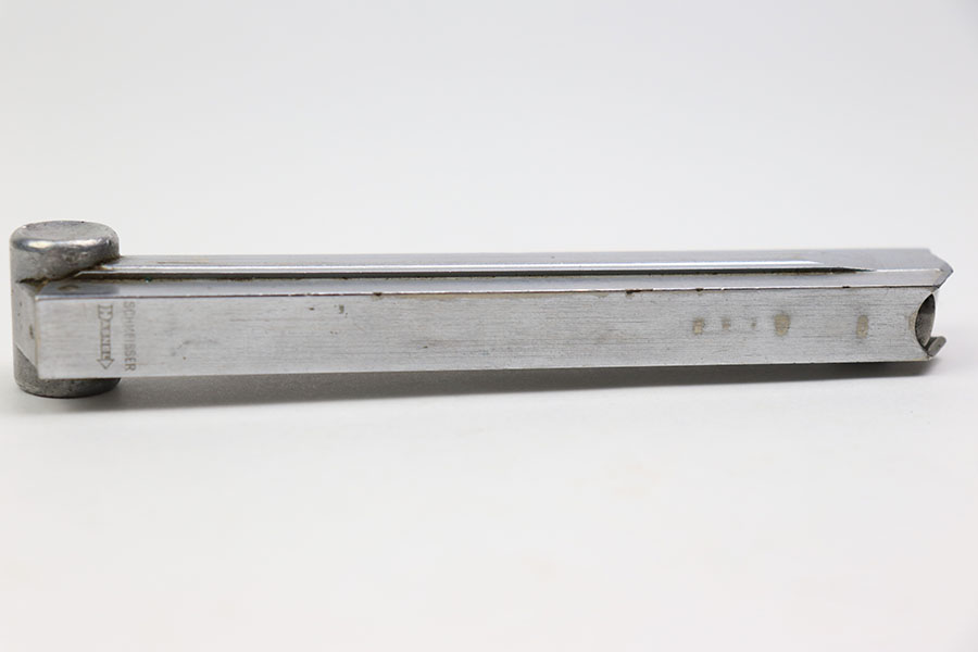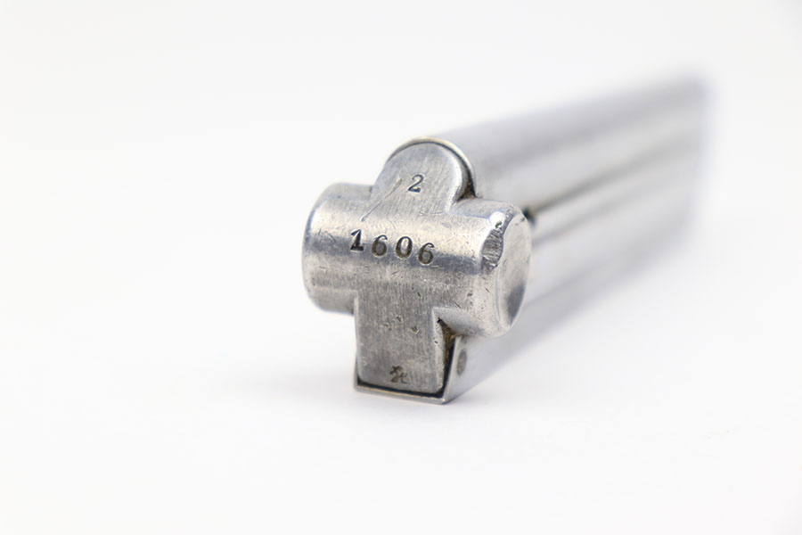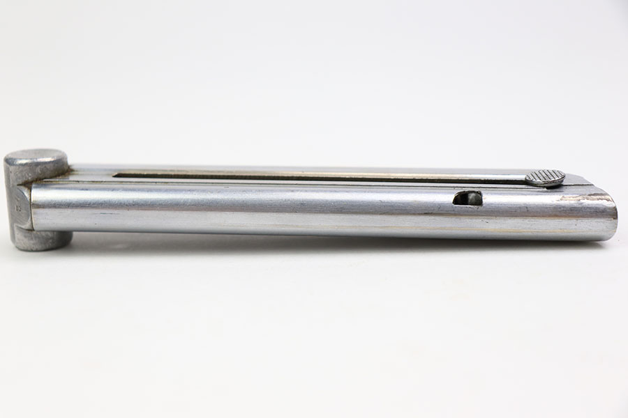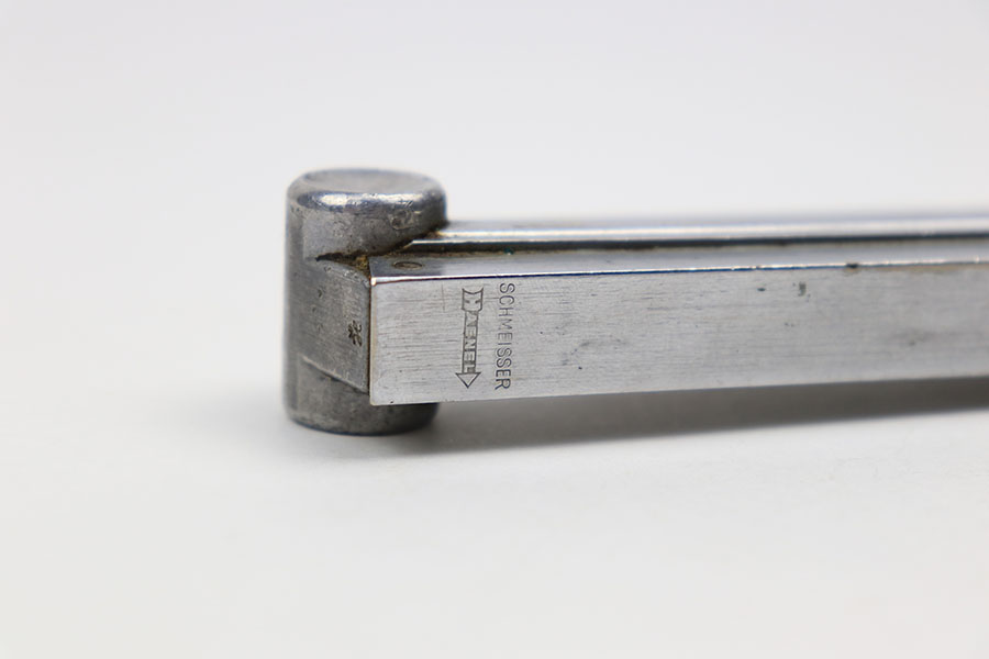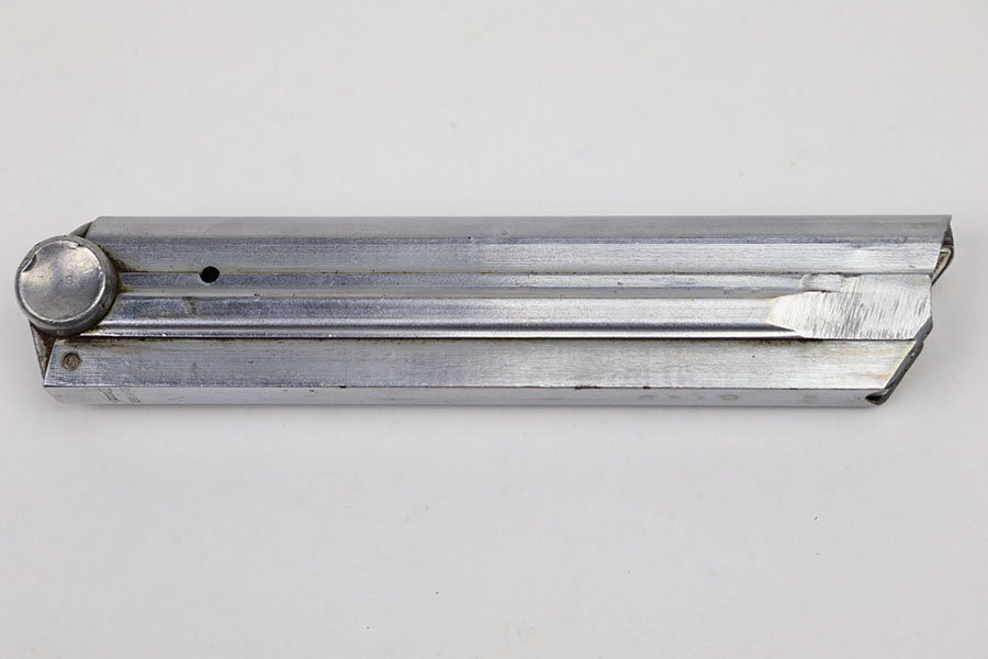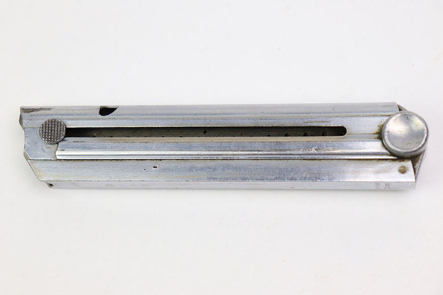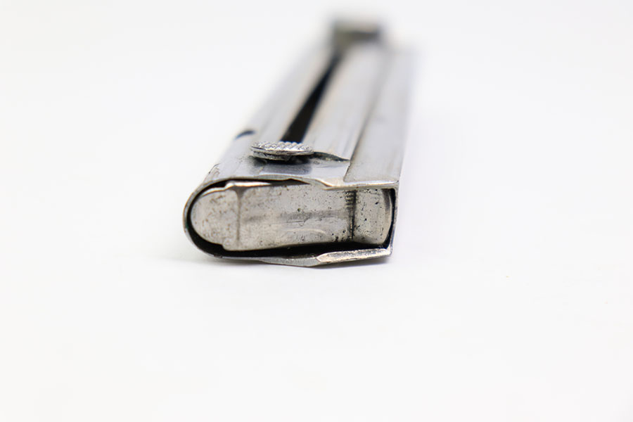 1/22/21 – This is an excellent Haenel made Luger magazine for a Police P.08. The magazine has minimal wear and no rust or pitting. The base is stamped “2” with serial number “1606” underneath and a Haenel maker stamp. There’s also a Haenel stamp on the spine as shown. The spring is strong and fully functional.