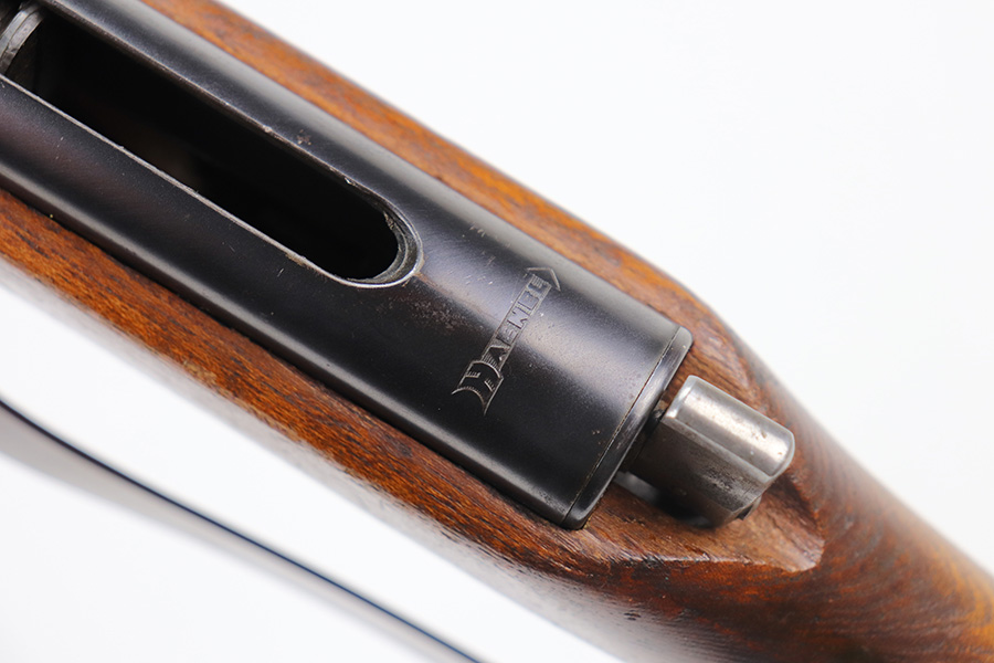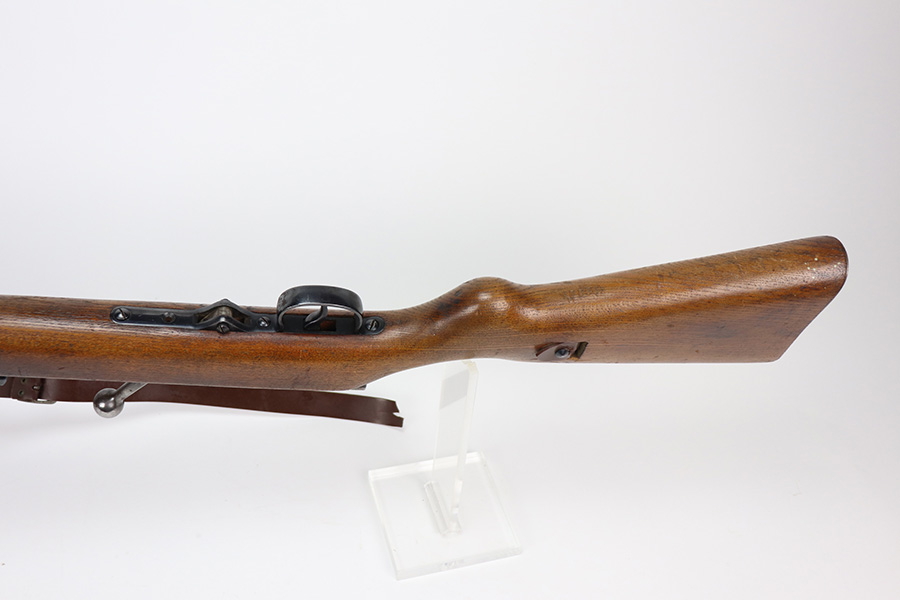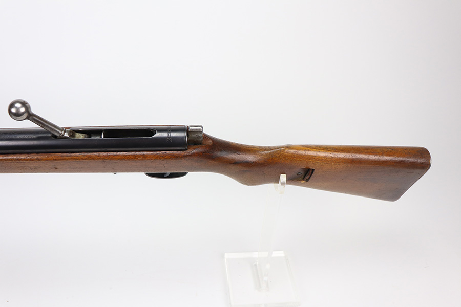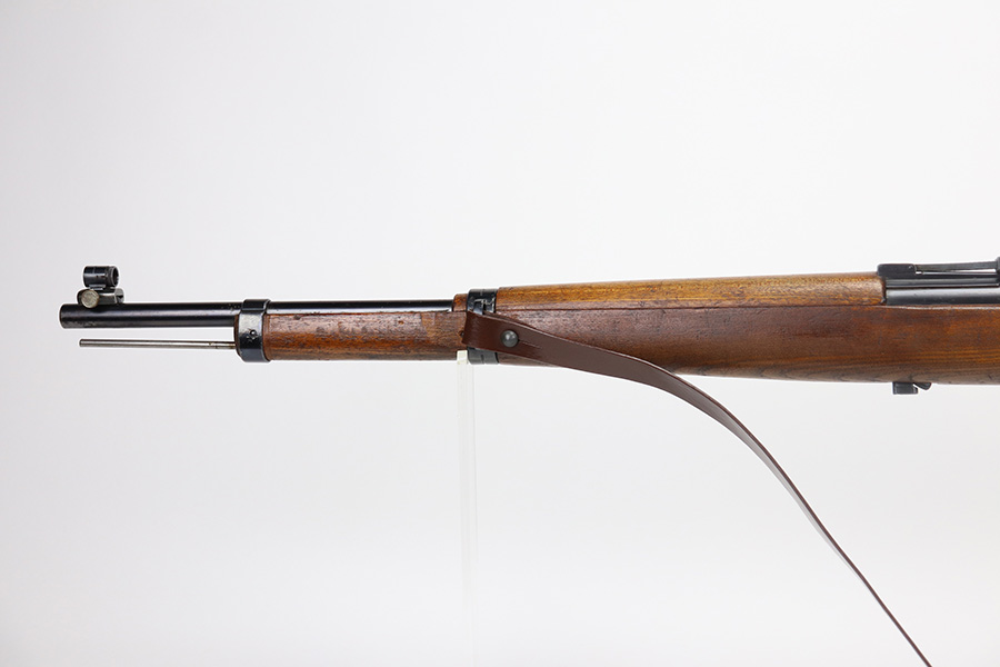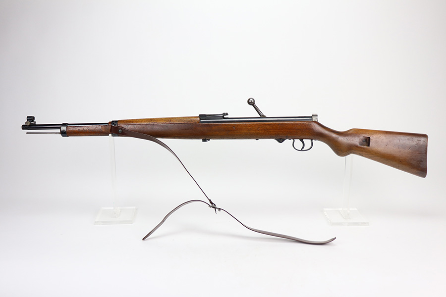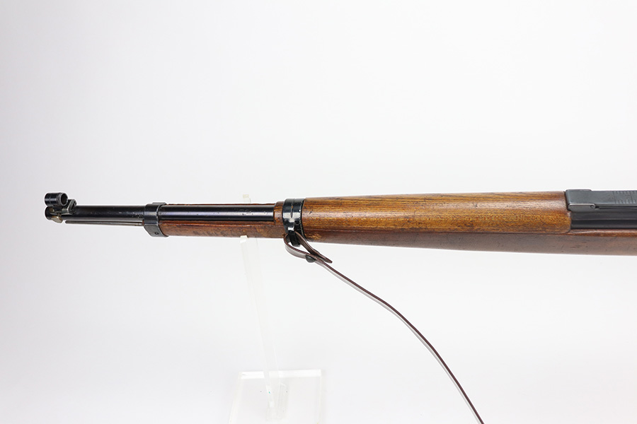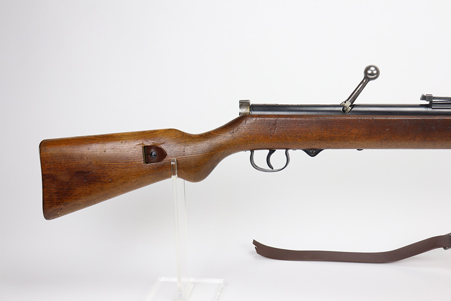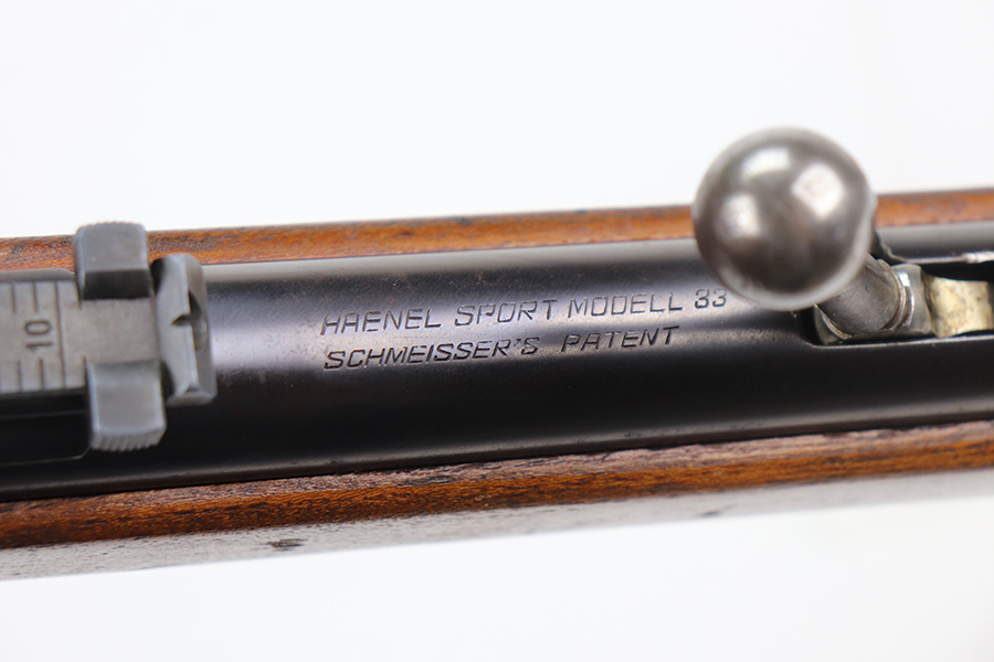 5/11/21 – This is an excellent example of a pre-WW2 Sport Model 33 BB Gun made by Haenel. It comes with a rare Vinyl sling. The gun is fully operational. It comes with an adjustable front sight hood. It has retained most of its bluing. There are just some light dings and handling marks down the length of the barrel and spotty freckling around the receiver. The stock is excellent except for some minor dings on the right side. The vinyl sling is cracked on one of the sides.