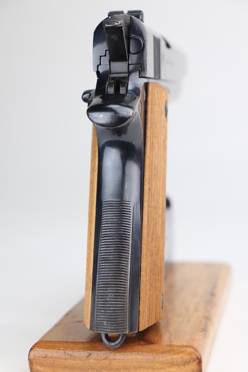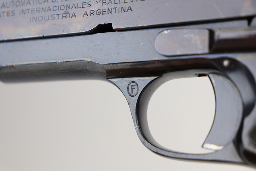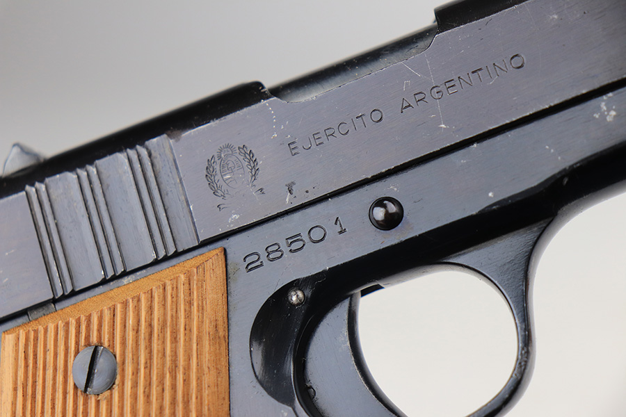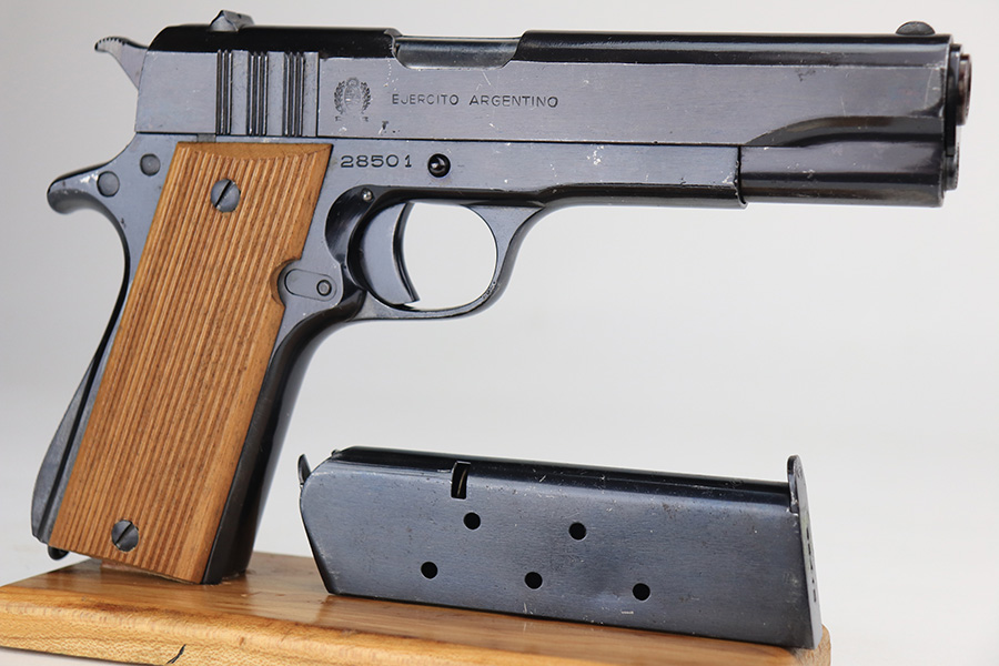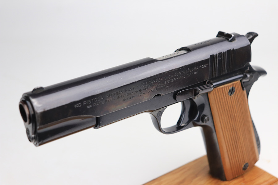 1/17/22 – This is an excellent example of a HAFDASA Ballester-Molina pistol manufactured in Argentine in 1945. The Ballester-Molina Pistol, originally known as Ballester-Rigaud (and marked as such during the first years of manufacture, circa 1938 to 1940), were made in Argentina by the Hispano Argentina de Automotives SA (HAFDASA) company. Manufacture started in 1938 in an attempt to provide Argentinean police and military with a less expensive alternative to the Colt Modelo 1927 Pistol, a domestically made licensed copy of the American Colt M1911A1 pistol. Production of the Ballester-Molina ceased in the early 1950s. This one is matching and has retained about 95-96% of its finish. There is wear around the muzzle, and a little bit of freckling on the left side of the slide. The gun is fitted with after-market grips currently but also comes with the originals. Period-correct magazine. Terrific bore. Matching numbers on frame, barrel and slide, and nearly-matching magazine. No import mark.