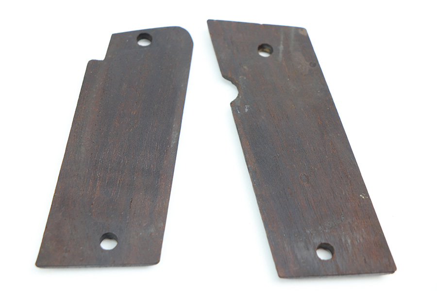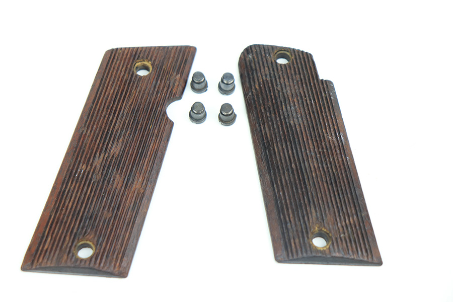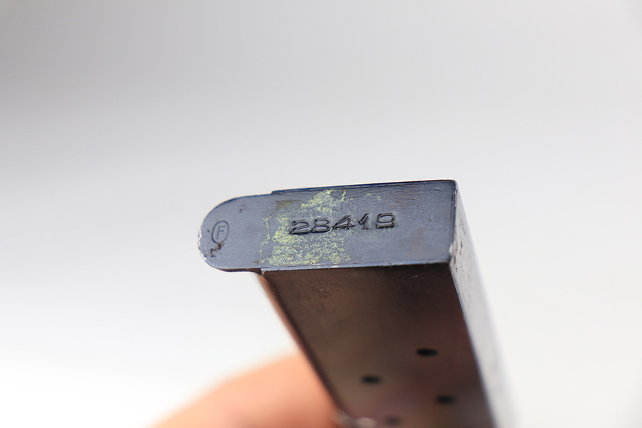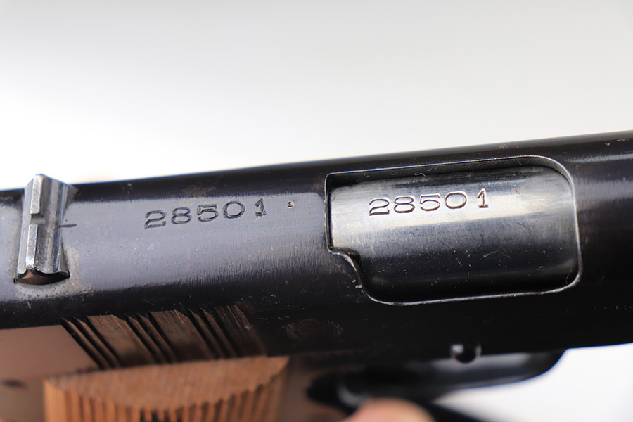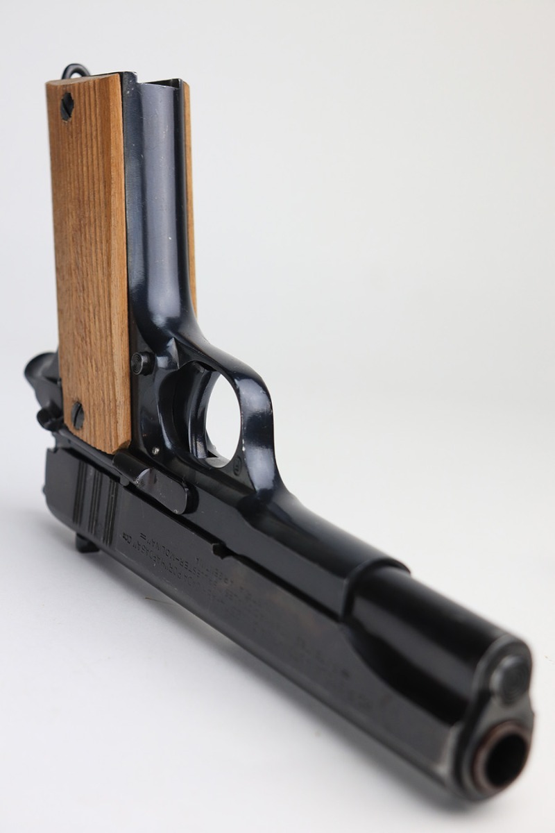 1/17/22 – This is an excellent example of a HAFDASA Ballester-Molina pistol manufactured in Argentine in 1945. The Ballester-Molina Pistol, originally known as Ballester-Rigaud (and marked as such during the first years of manufacture, circa 1938 to 1940), were made in Argentina by the Hispano Argentina de Automotives SA (HAFDASA) company. Manufacture started in 1938 in an attempt to provide Argentinean police and military with a less expensive alternative to the Colt Modelo 1927 Pistol, a domestically made licensed copy of the American Colt M1911A1 pistol. Production of the Ballester-Molina ceased in the early 1950s. This one is matching and has retained about 95-96% of its finish. There is wear around the muzzle, and a little bit of freckling on the left side of the slide. The gun is fitted with after-market grips currently but also comes with the originals. Period-correct magazine. Terrific bore. Matching numbers on frame, barrel and slide, and nearly-matching magazine. No import mark.