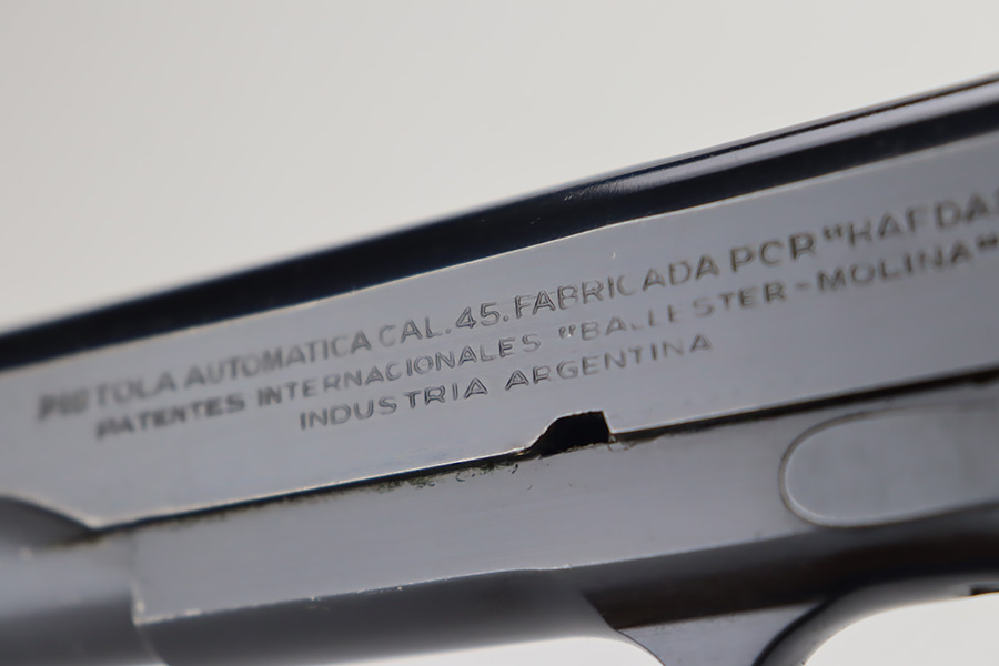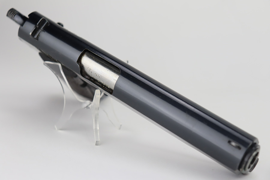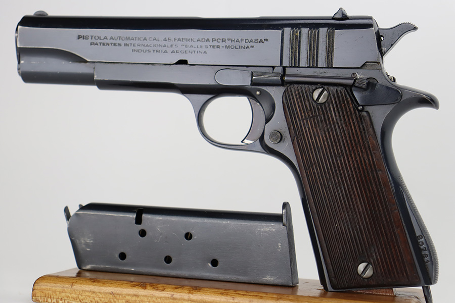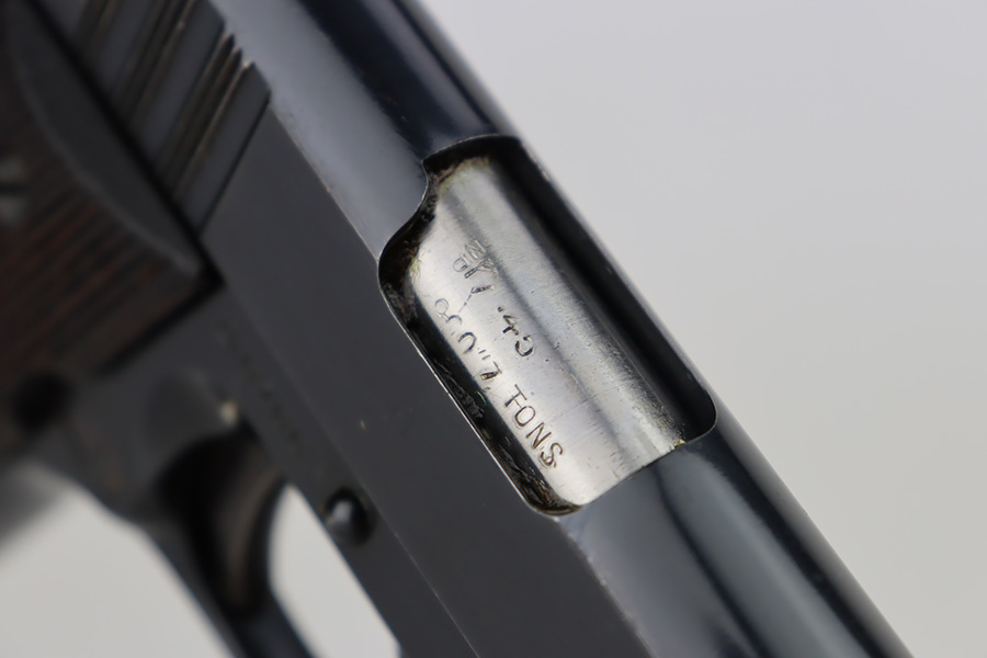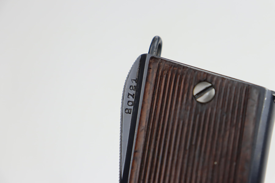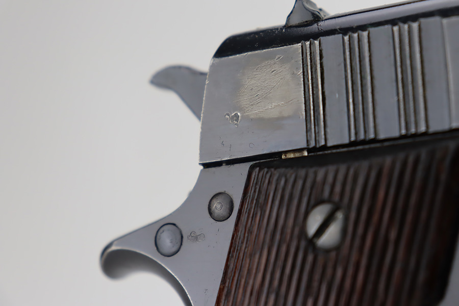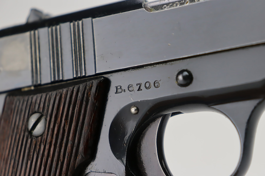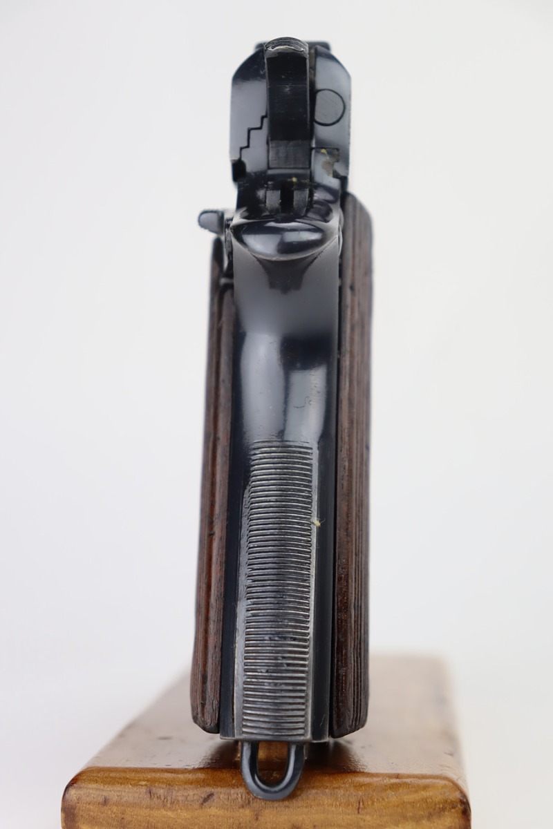 9/21/23 – This is an excellent example of a rare HAFDASA Ballester-Molina that was produced as part of an 8,000 pistol order by the British government. Per Forgotten Weapons, they were produced between 1942 and 1944, and are easily identified by the application of a second serial number on the left side with a “B” prefix. The exact details of the contract are lost, but the British appear to have paid at least in part in steel (in very short supply in Argentina at the time) and also supplied the steel needed to make the pistols, probably via US Lend-Lease. Some of these Ballester Molina pistols were supplied to SOE agents or resistance organizations, while others remained unissued at the end of the war. This one is matching and has retained about 95% of its bluing with minor muzzle wear, a few tiny dots of discoloration on the right side of the slide, and an area of wear at the back right of the slide. Fitted with nice period-correct wood grips and comes with one proper magazine. Most of the bore is shiny with strong rifling, but there is some light frosting in the grooves.