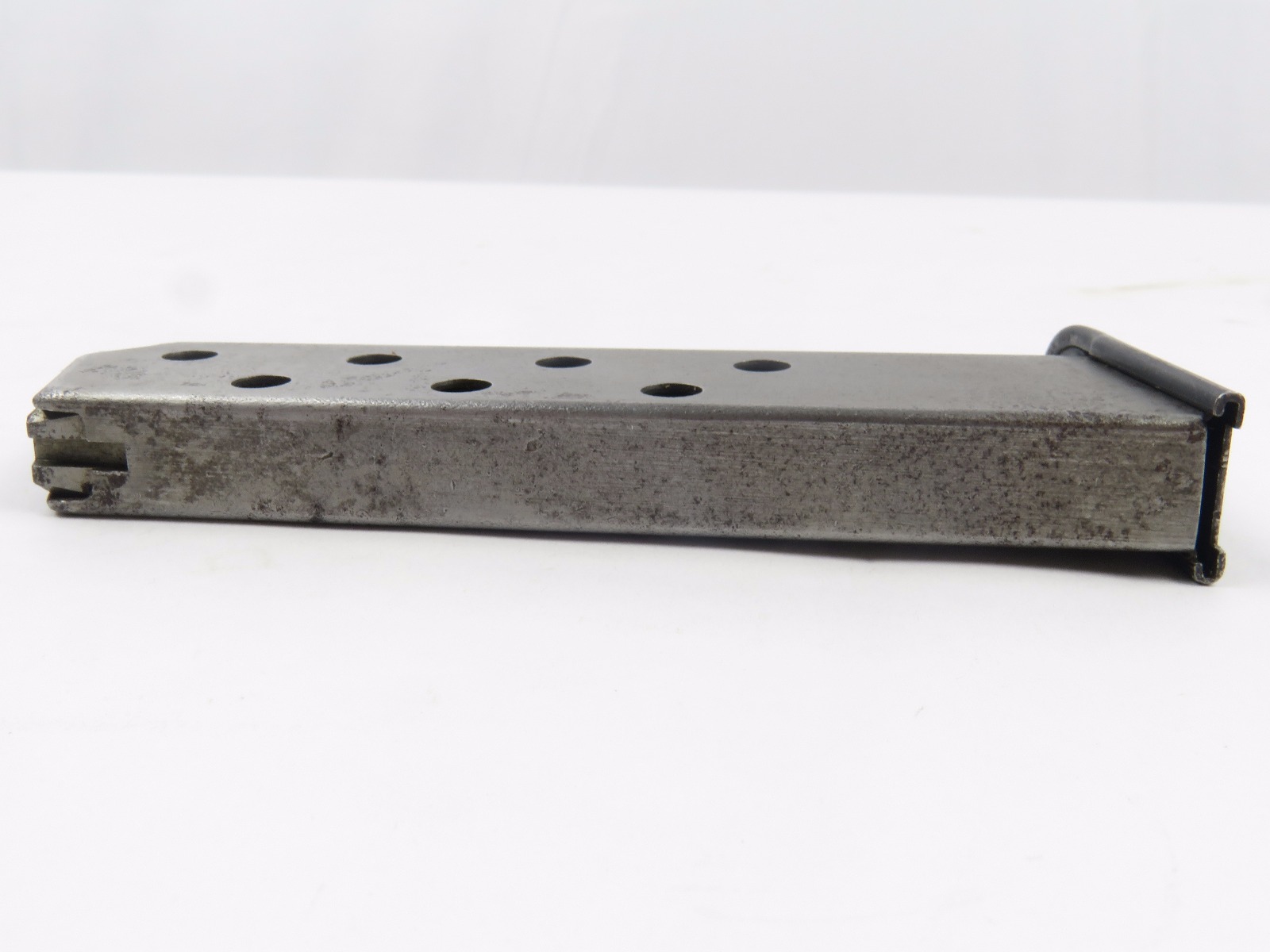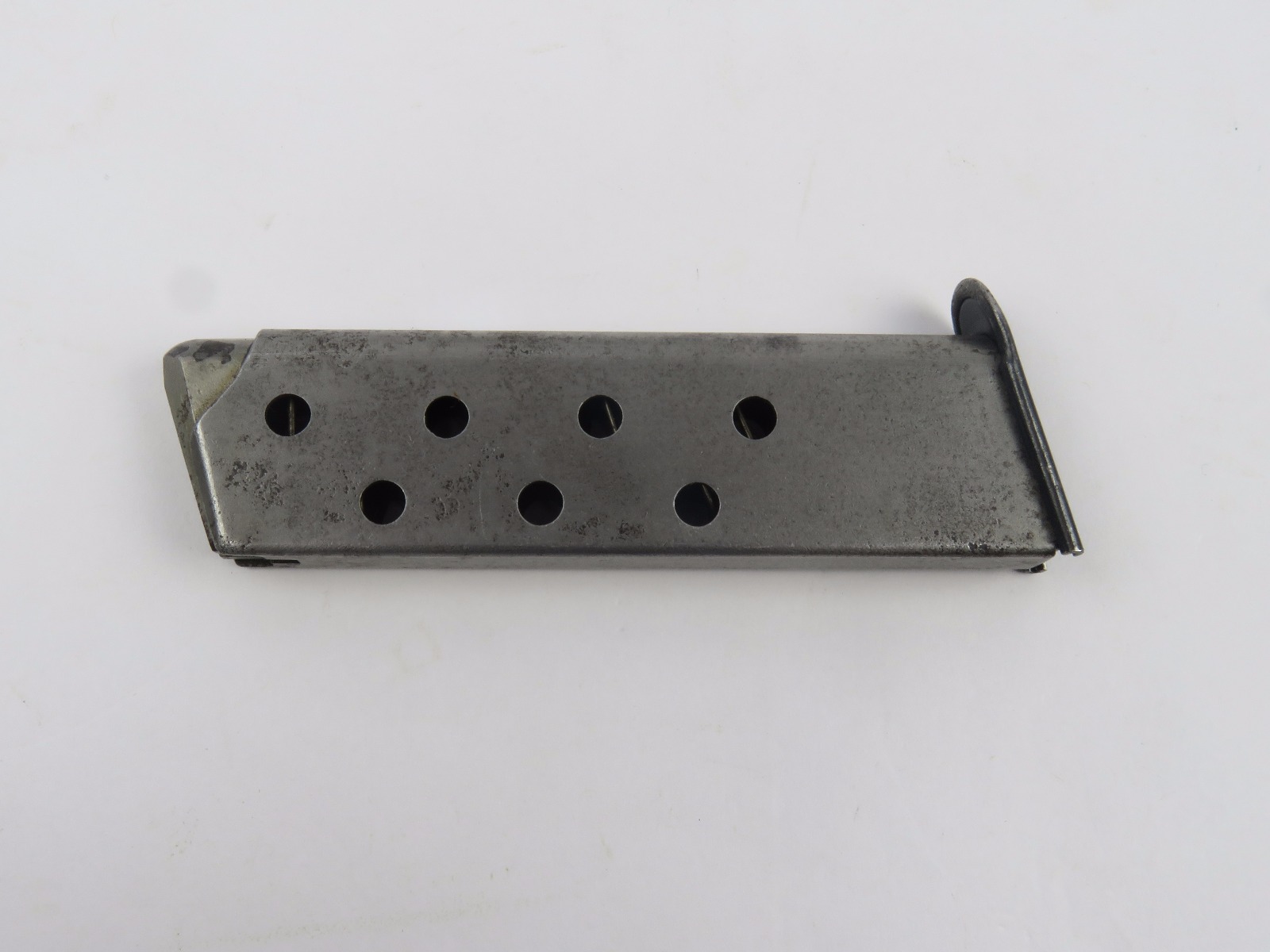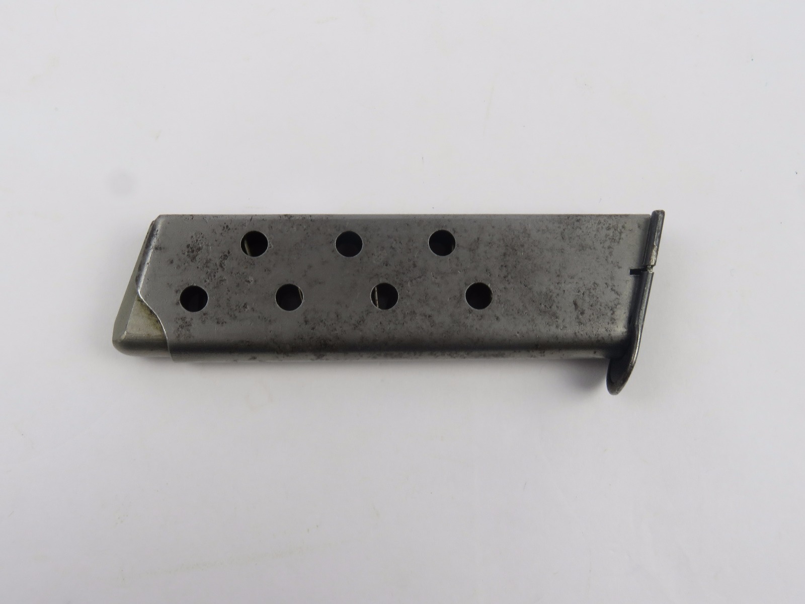 10/26/17 – This is a WW2 production Mauser HSc magazine. The magazine is 2nd variation wartime production with a half-moon indent on the base. There are no other markings. The phosphate body of the magazine has spotty patina and browning, but this is normal wear and not excessive rust or pitting. The spring is strong and fully functional. Guaranteed original.