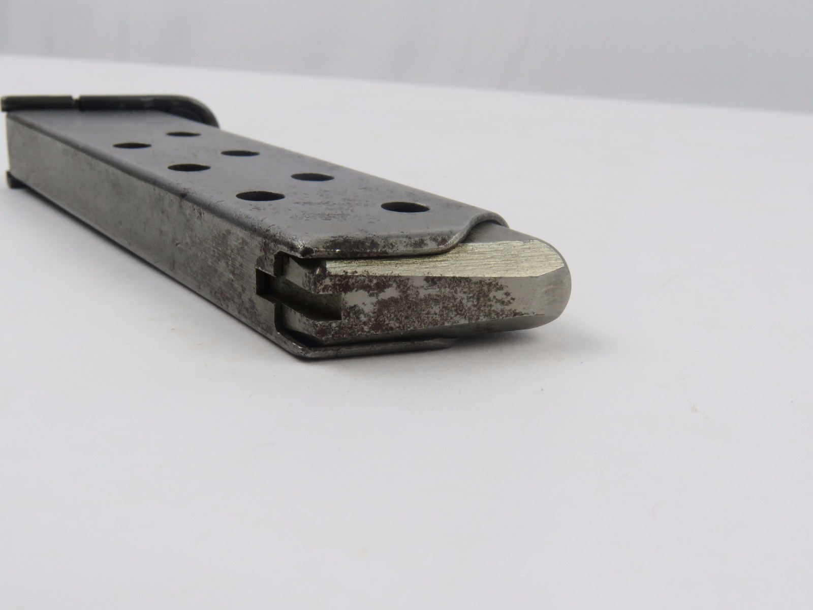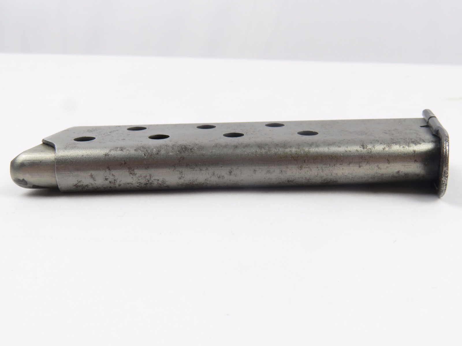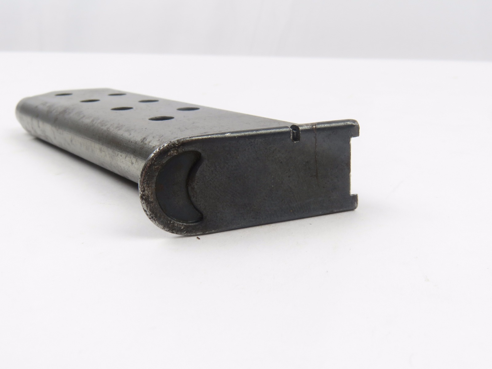 10/26/17 – This is a WW2 production Mauser HSc magazine. The magazine is 2nd variation wartime production with a half-moon indent on the base. There are no other markings. The phosphate body of the magazine has spotty patina and browning, but this is normal wear and not excessive rust or pitting. The spring is strong and fully functional. Guaranteed original.