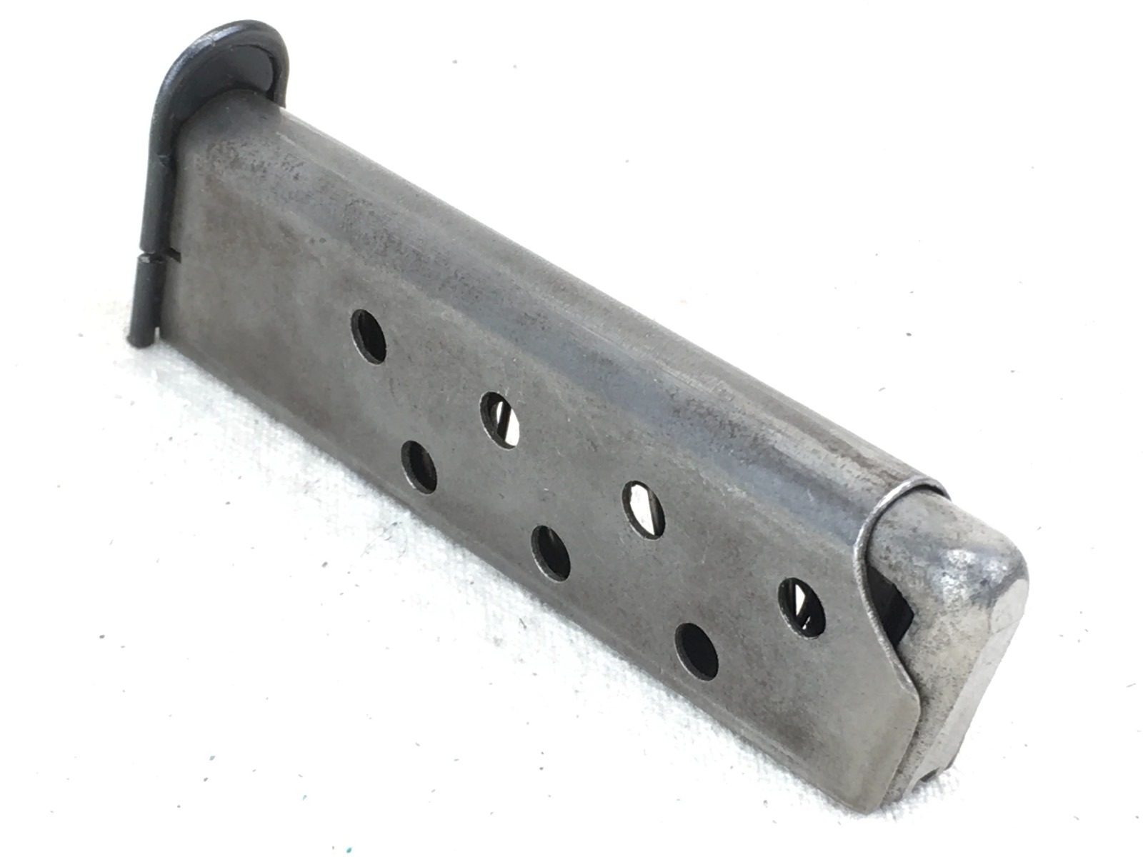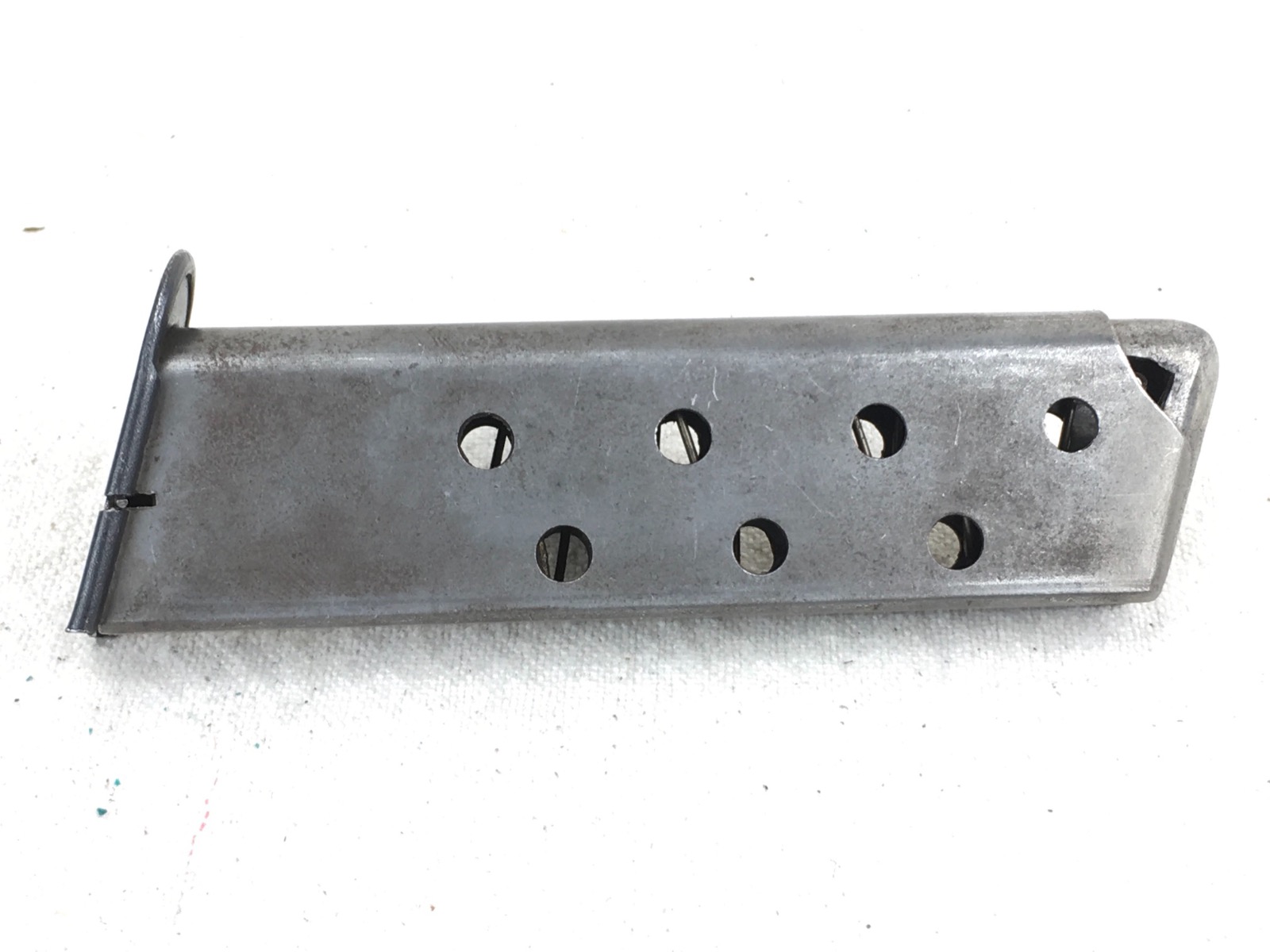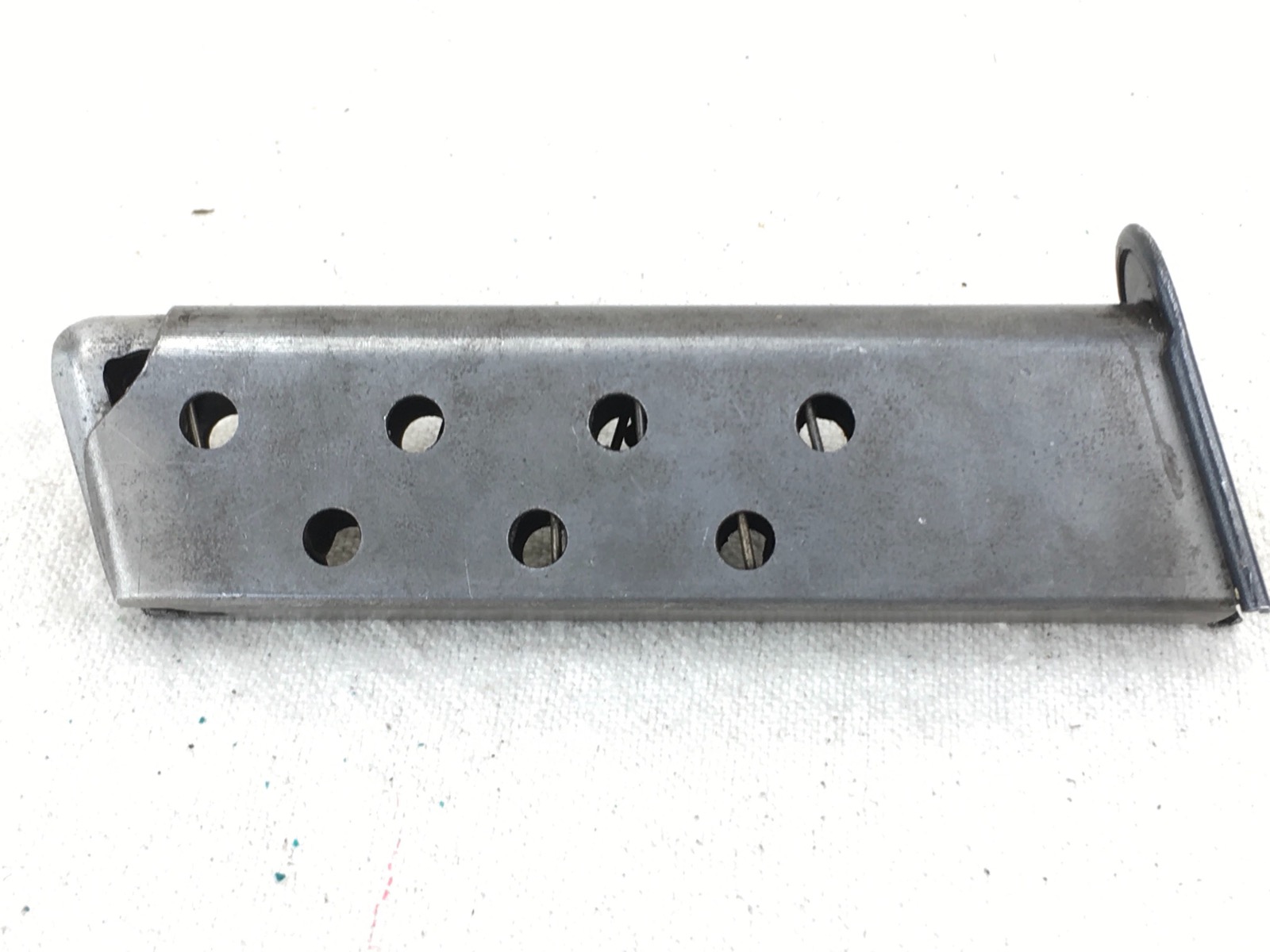 11/14/18 – This is an original WW2 era Mauser HSc magazine. The magazine frame has a nice patina throughout the frame. This is normal aging and it is not rust or pitting. The bottom of the magazine is excellent with a half moon indent. Spring is excellent and fully functional. Holds 7 rounds of 7,65mm ammo.