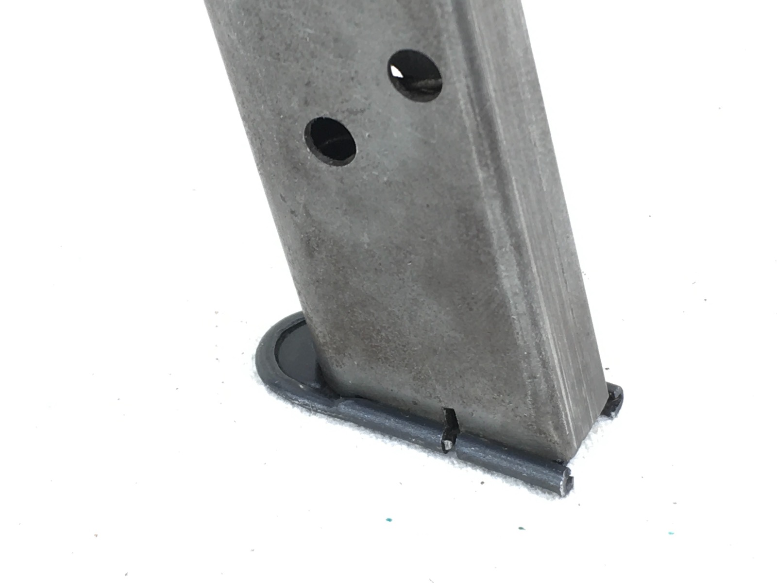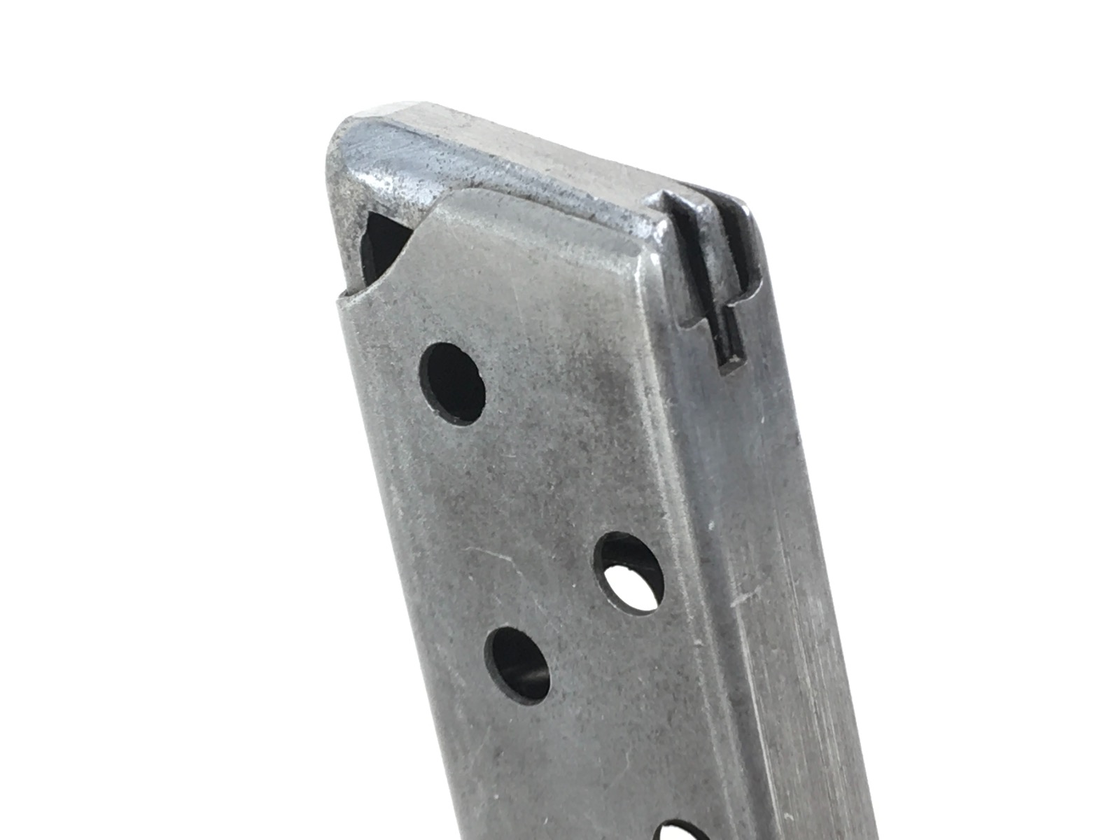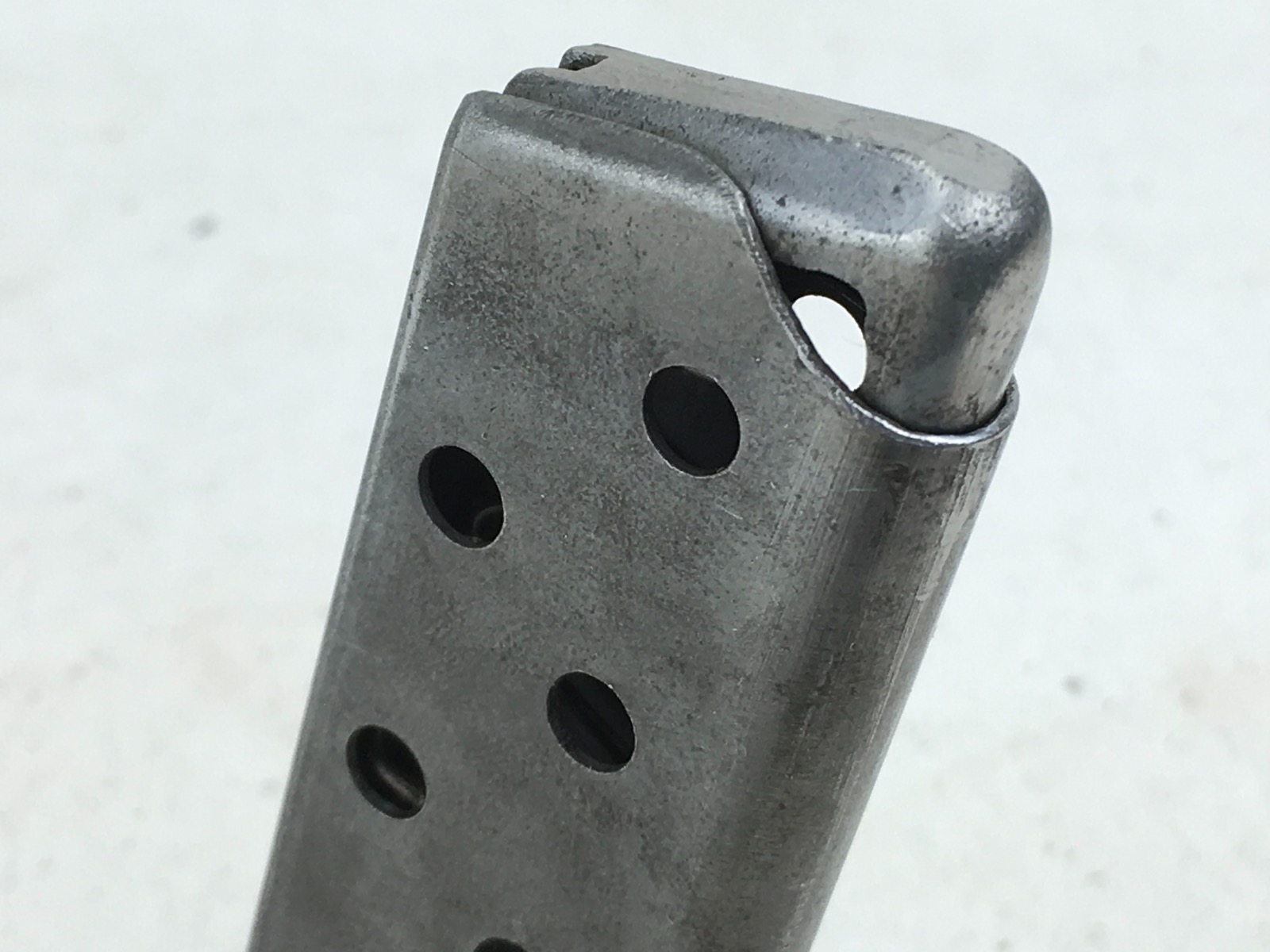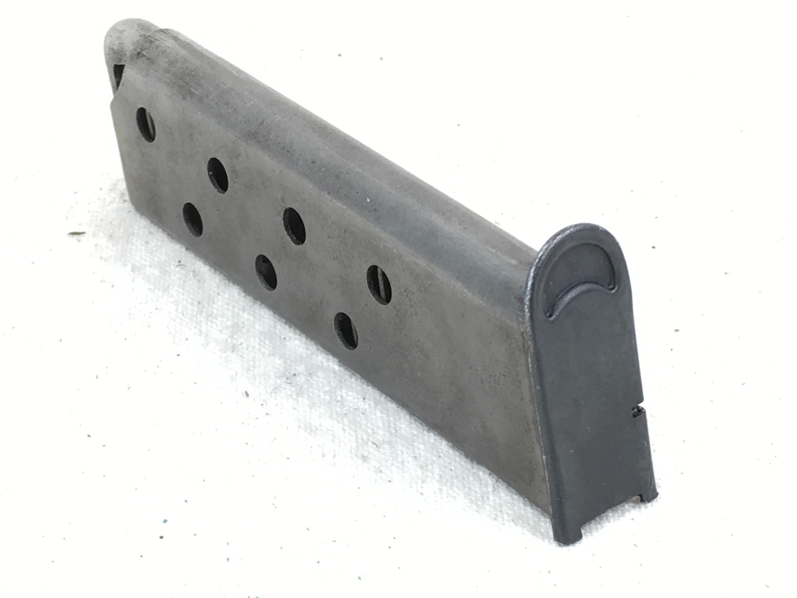 11/14/18 – This is an original WW2 era Mauser HSc magazine. The magazine frame has a nice patina throughout the frame. This is normal aging and it is not rust or pitting. The bottom of the magazine is excellent with a half moon indent. Spring is excellent and fully functional. Holds 7 rounds of 7,65mm ammo.