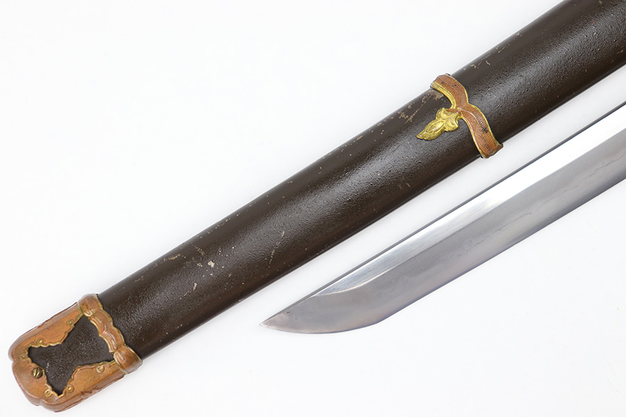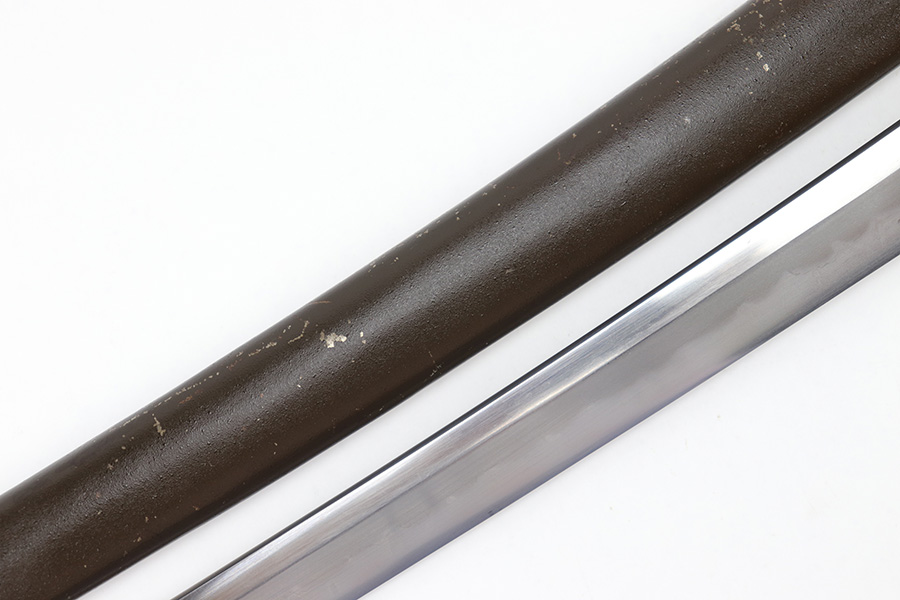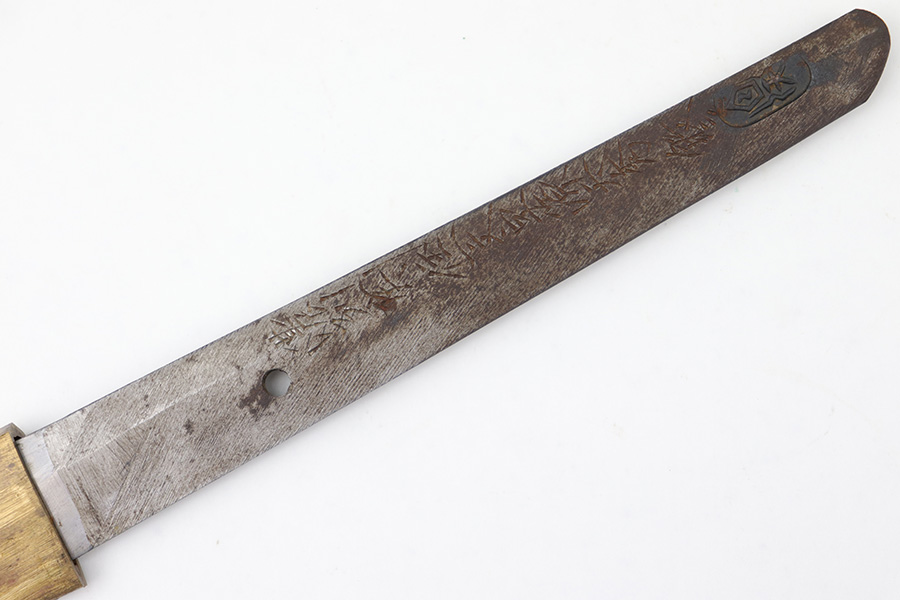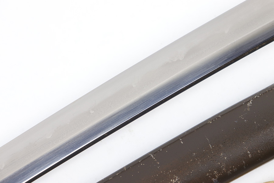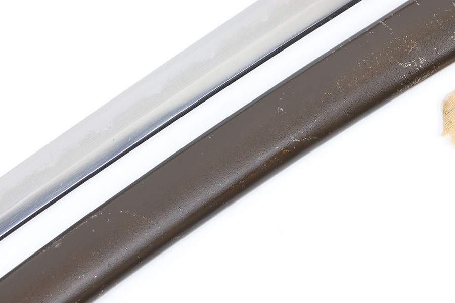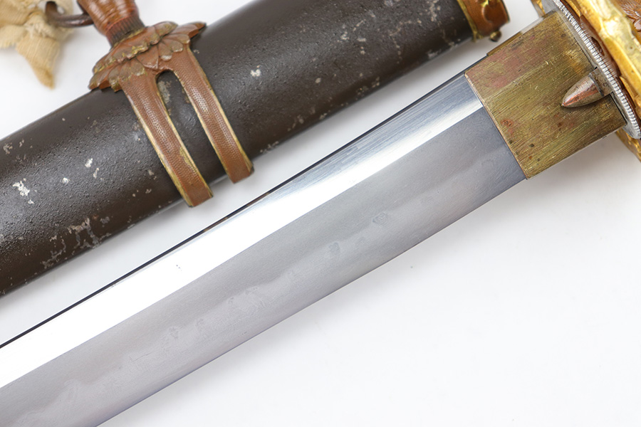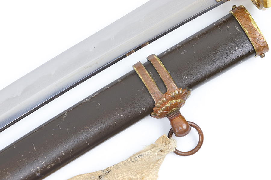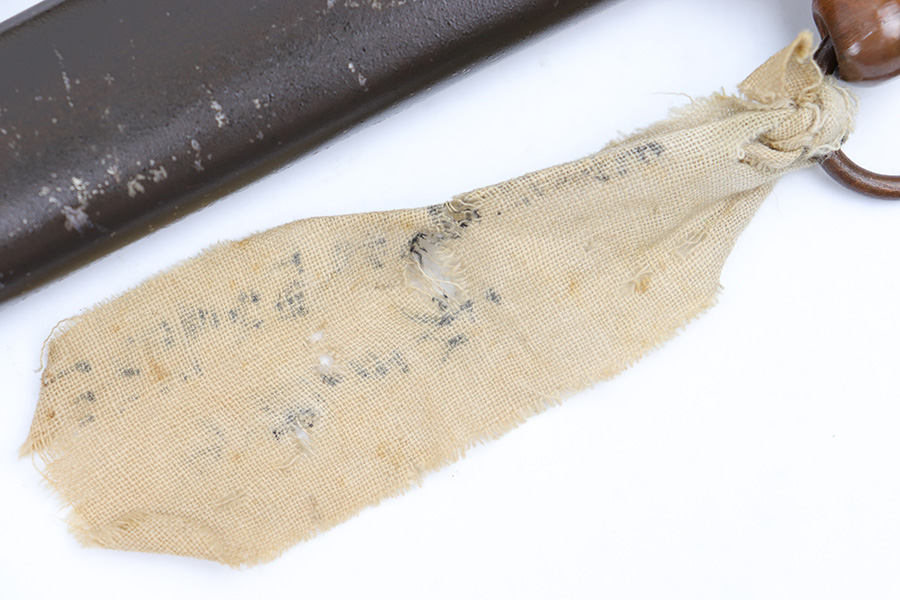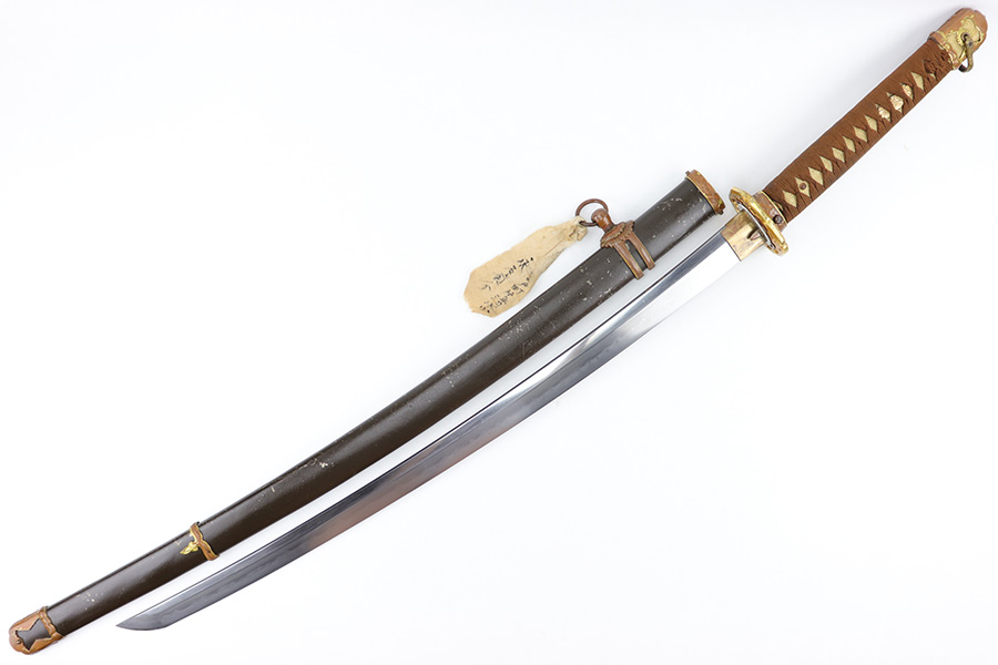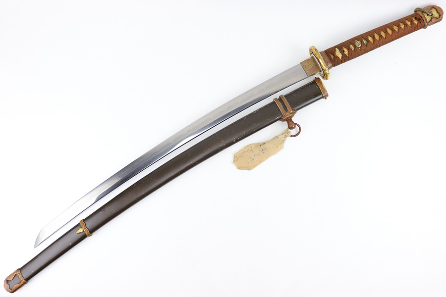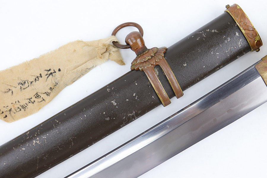 7/10/23 – This is an original WW2 production Type 98 Japanese Army Officer Sword. This sword is stamped with an Amahide factory stamp at the base of the tang. The sword blade is considered showa period made with “modern steel” and oil quenched. The sword blade features beautiful graining throughout that is telltale of handmade production. Amahide is known for quality, and this example is no exception. The graining is very distinct on this example. The blade is very clean throughout with no signs of tampering and a nice tempered edge. The typical Army fittings are all matching numbered and in great overall condition with some light surface wear and typical aging patina. Comes with a standard T98 scabbard as well, although there’s an attached cloth tag with Japanese writing. We’ve been told this is either a capture tag of some kind or a prayer / memorial tag of some kind. The signature on the blade hilt is “No Shu Seki Ju Ichi Monji”.
