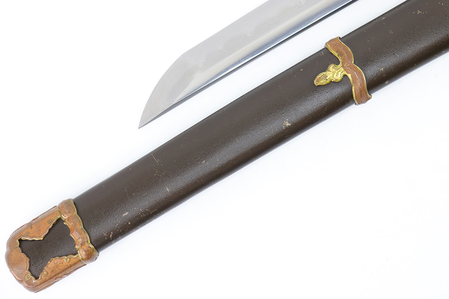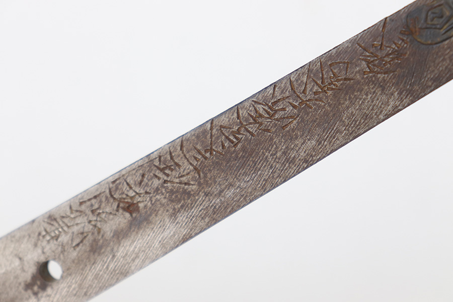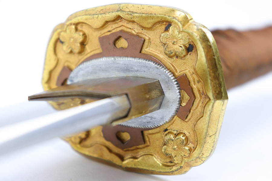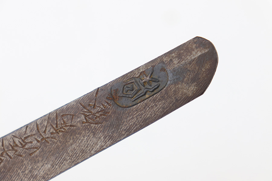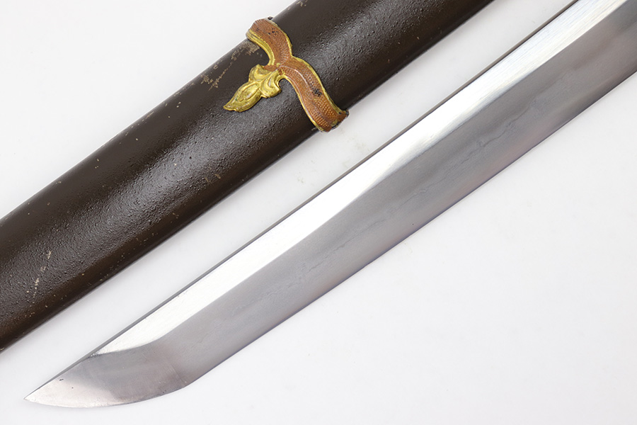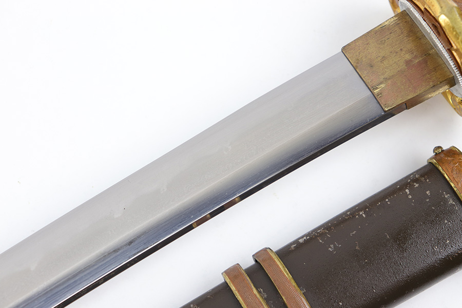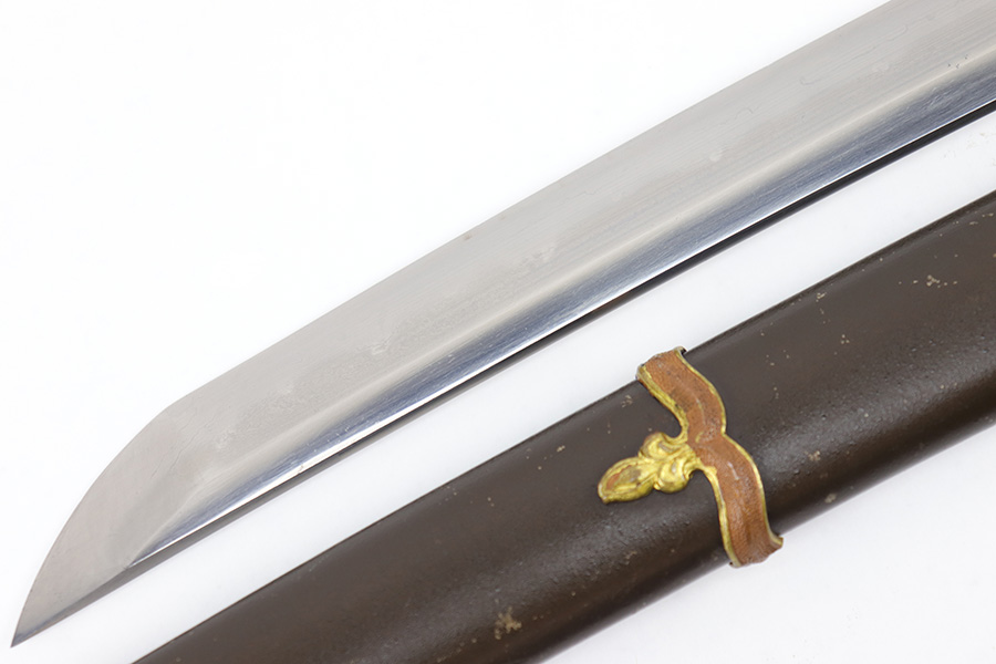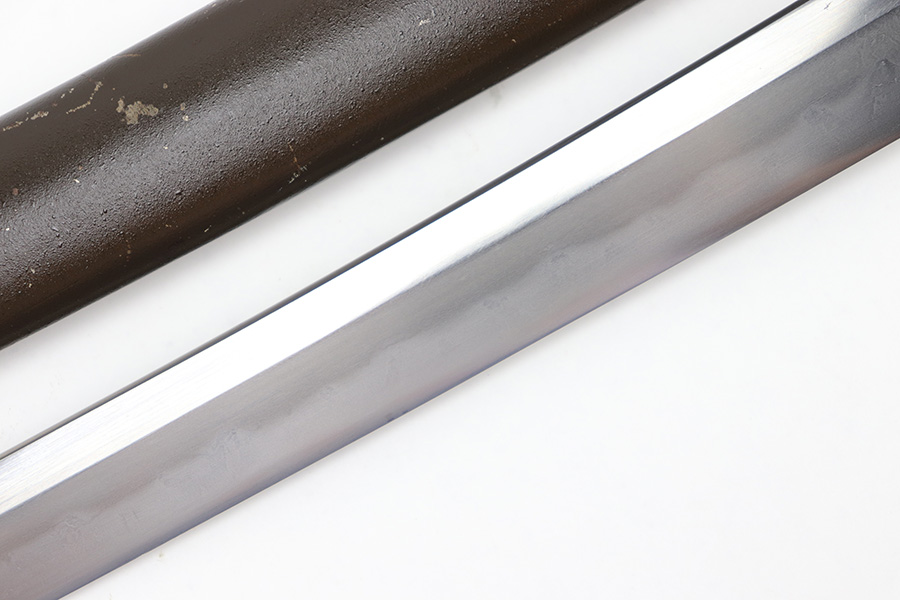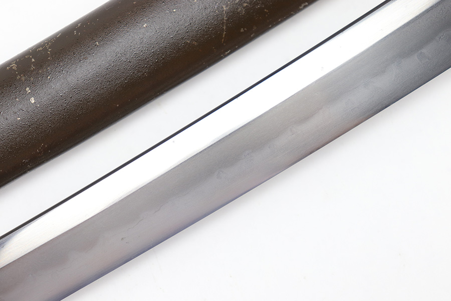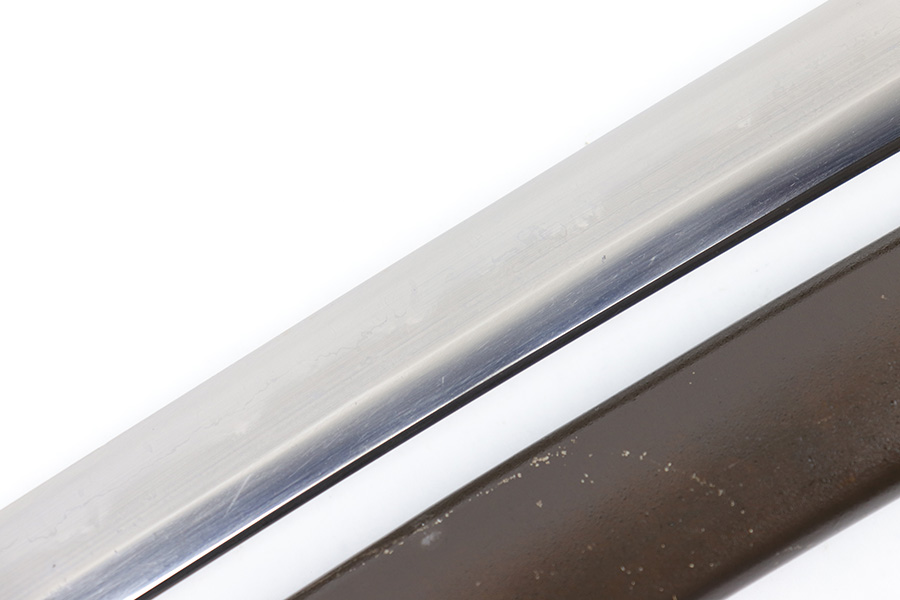 7/10/23 – This is an original WW2 production Type 98 Japanese Army Officer Sword. This sword is stamped with an Amahide factory stamp at the base of the tang. The sword blade is considered showa period made with “modern steel” and oil quenched. The sword blade features beautiful graining throughout that is telltale of handmade production. Amahide is known for quality, and this example is no exception. The graining is very distinct on this example. The blade is very clean throughout with no signs of tampering and a nice tempered edge. The typical Army fittings are all matching numbered and in great overall condition with some light surface wear and typical aging patina. Comes with a standard T98 scabbard as well, although there’s an attached cloth tag with Japanese writing. We’ve been told this is either a capture tag of some kind or a prayer / memorial tag of some kind. The signature on the blade hilt is “No Shu Seki Ju Ichi Monji”.