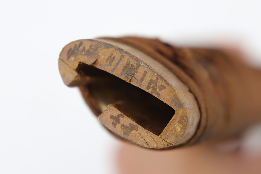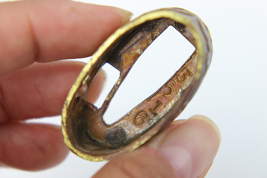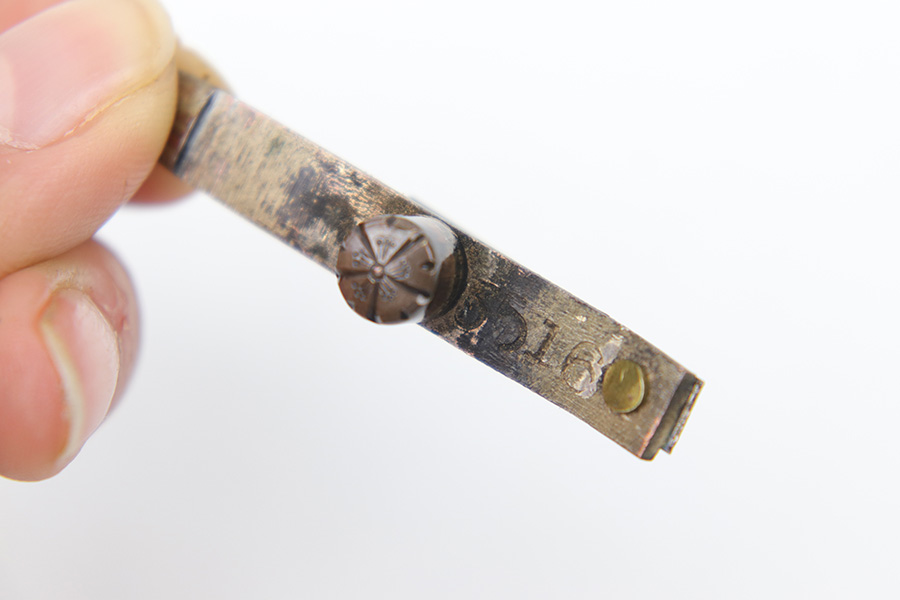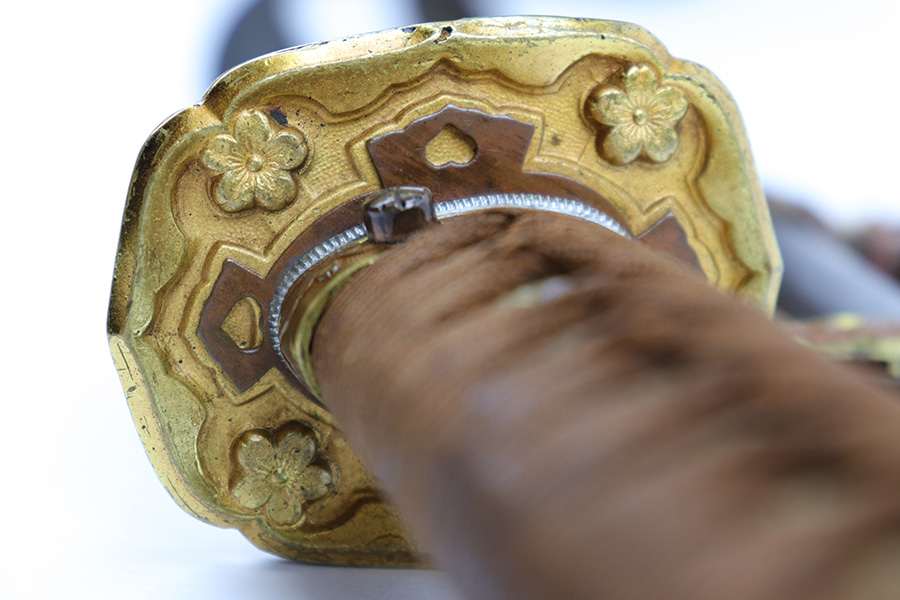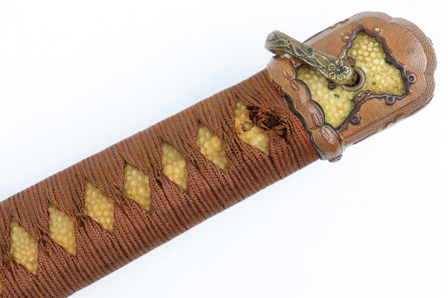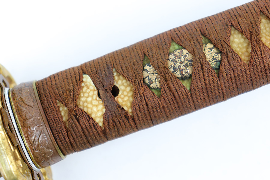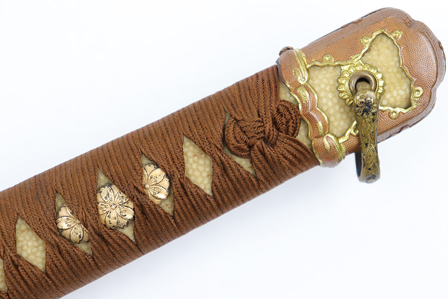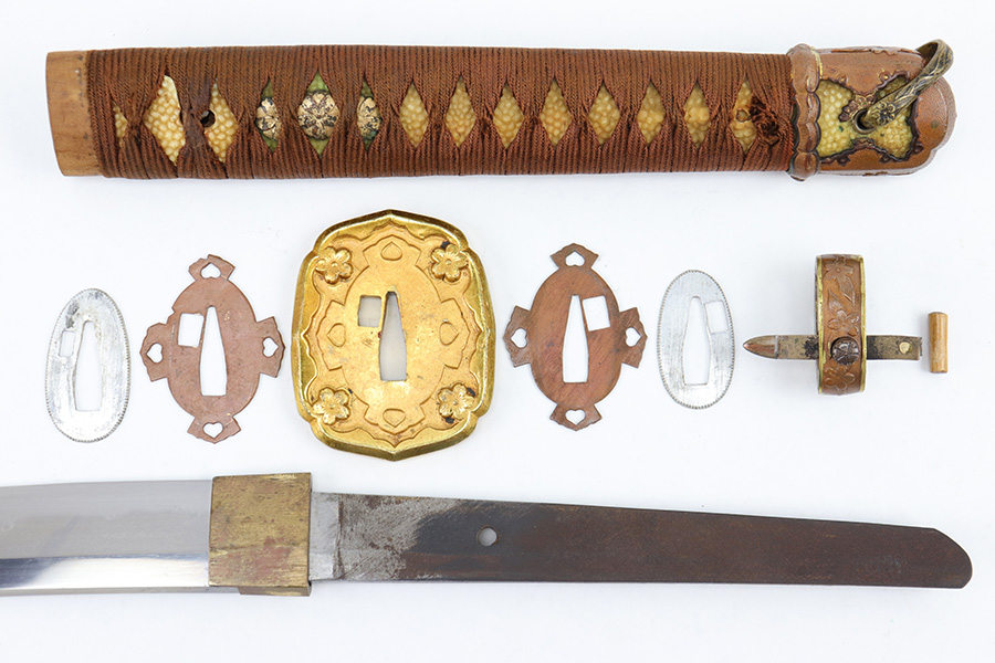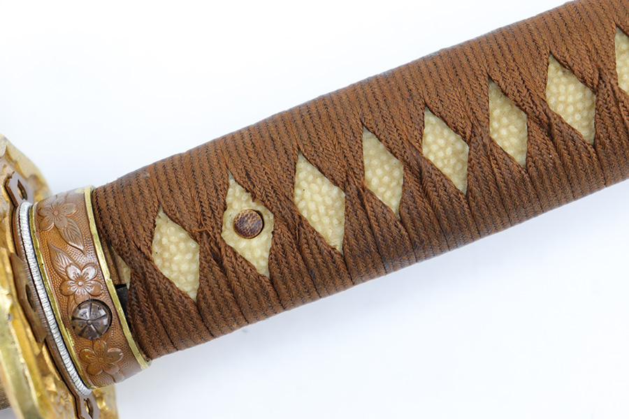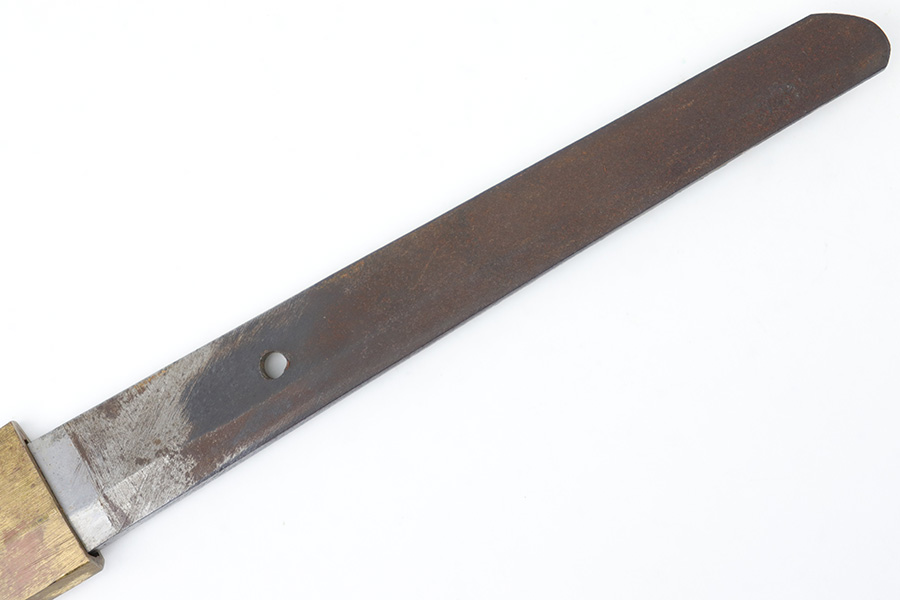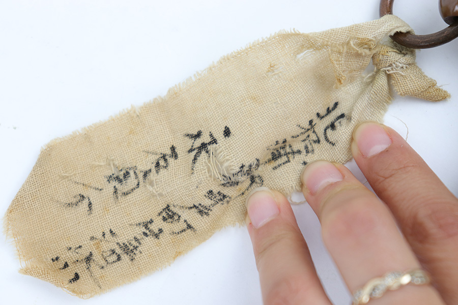7/10/23 – This is an original WW2 production Type 98 Japanese Army Officer Sword. This sword is stamped with an Amahide factory stamp at the base of the tang. The sword blade is considered showa period made with “modern steel” and oil quenched. The sword blade features beautiful graining throughout that is telltale of handmade production. Amahide is known for quality, and this example is no exception. The graining is very distinct on this example. The blade is very clean throughout with no signs of tampering and a nice tempered edge. The typical Army fittings are all matching numbered and in great overall condition with some light surface wear and typical aging patina. Comes with a standard T98 scabbard as well, although there’s an attached cloth tag with Japanese writing. We’ve been told this is either a capture tag of some kind or a prayer / memorial tag of some kind. The signature on the blade hilt is “No Shu Seki Ju Ichi Monji”.