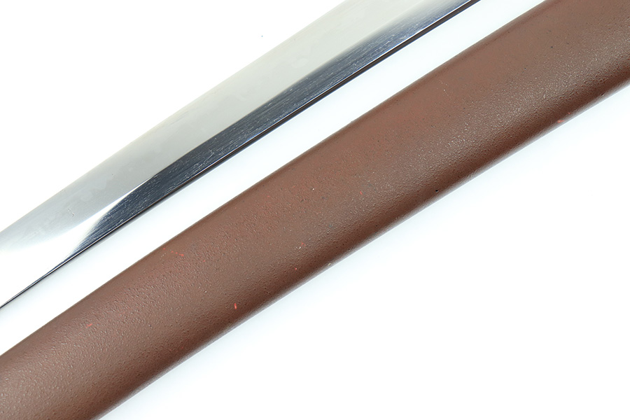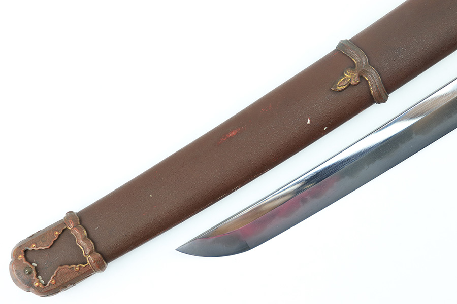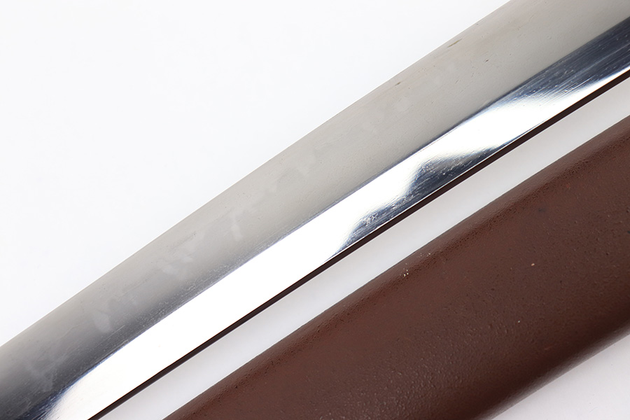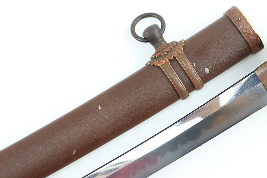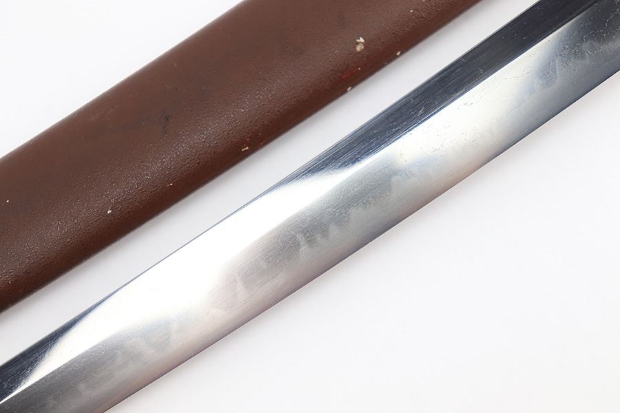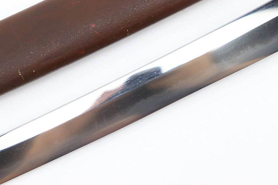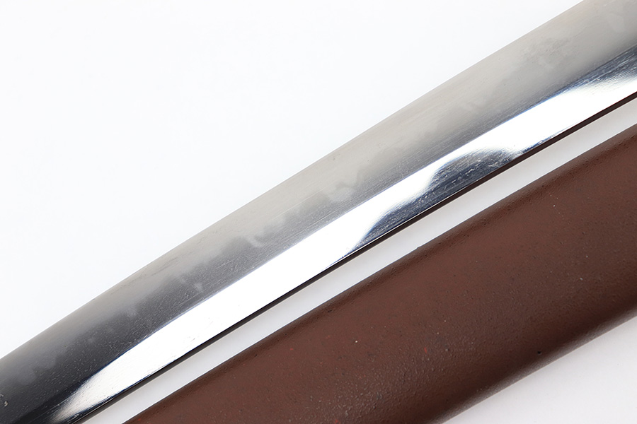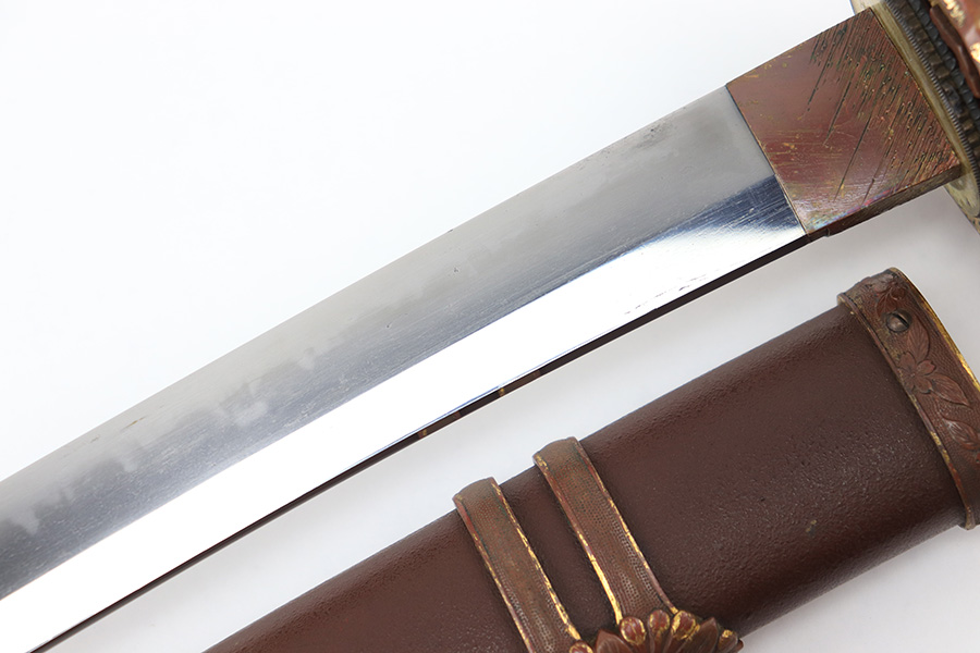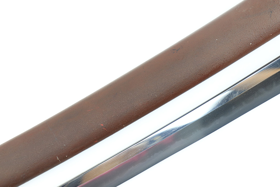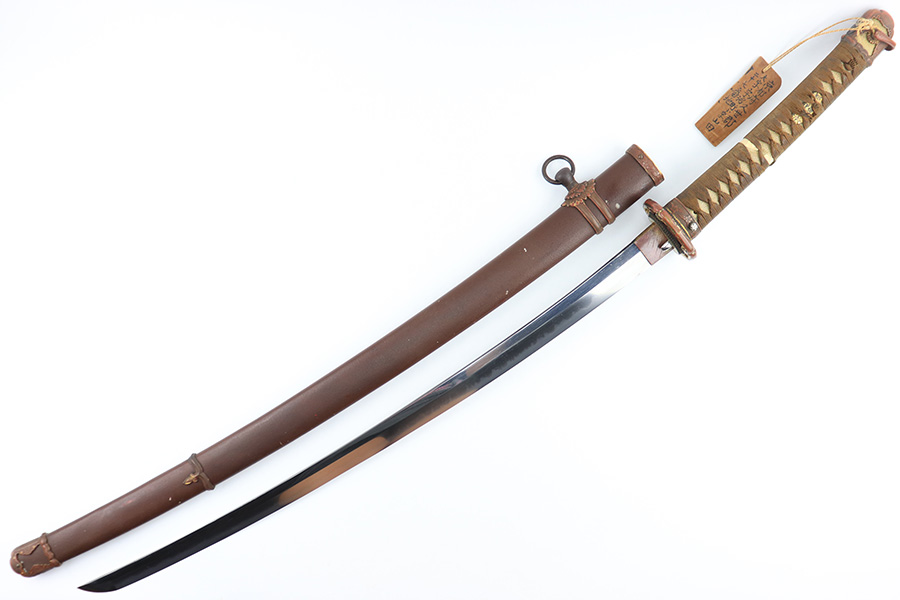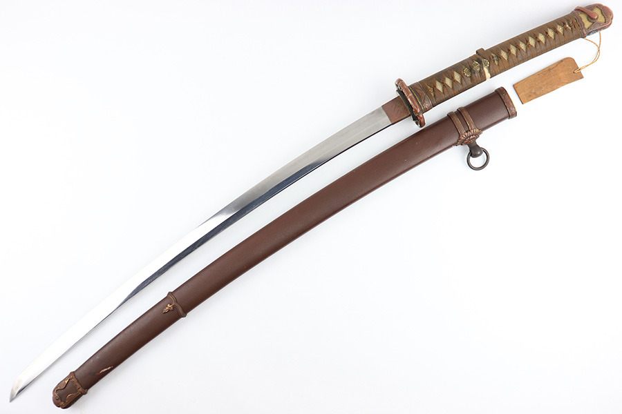 8/4/23 – This is a WW2 assembled Type 98 Army Officer Samurai sword. The sword blade is a late Edo period production (mid 1800’s) that was hand made and water quenched. The blade has a visible graining on both sides, and a nice visible tempered edge. There are some mild surface scratches around the blade ridge, but these are small and minor. There’s also dark lines from cleaning with oil and polish, which creates minor separations in the layers of forged metal over time. This is very minor but worth noting. The tang is short, and has a fake signature (fairly common) despite being handmade, as certain swordsmiths could sell their blades for a premium, even back in the 1800s. The blade is still handmade and quality, however. The fittings are standard WW2 military officer, and are in good condition but show aging and surface wear throughout. The brown cloth wrapping is broken and loose around the middle of the handle. Comes with an attached wood “prayer tag” that we’re not sure the significance of. The scabbard is correct and original from WW2, and in great overall condition with normal surface patina and mild aging.