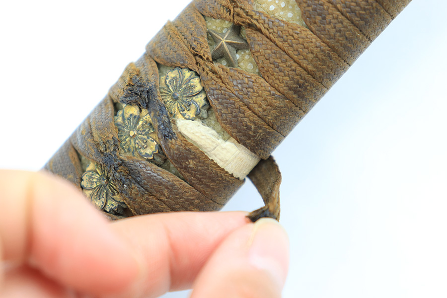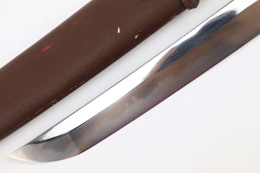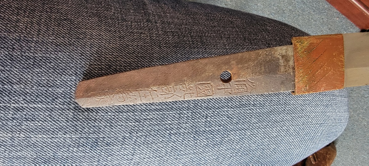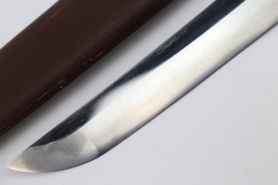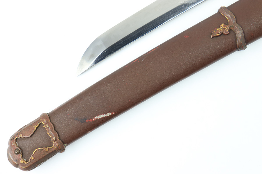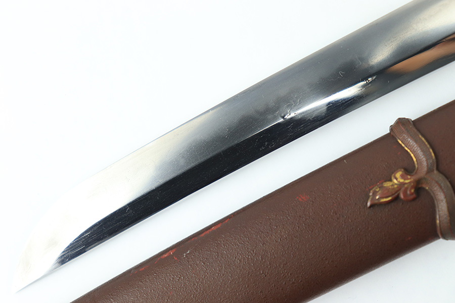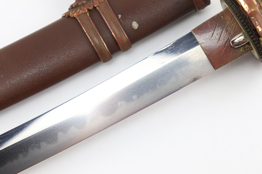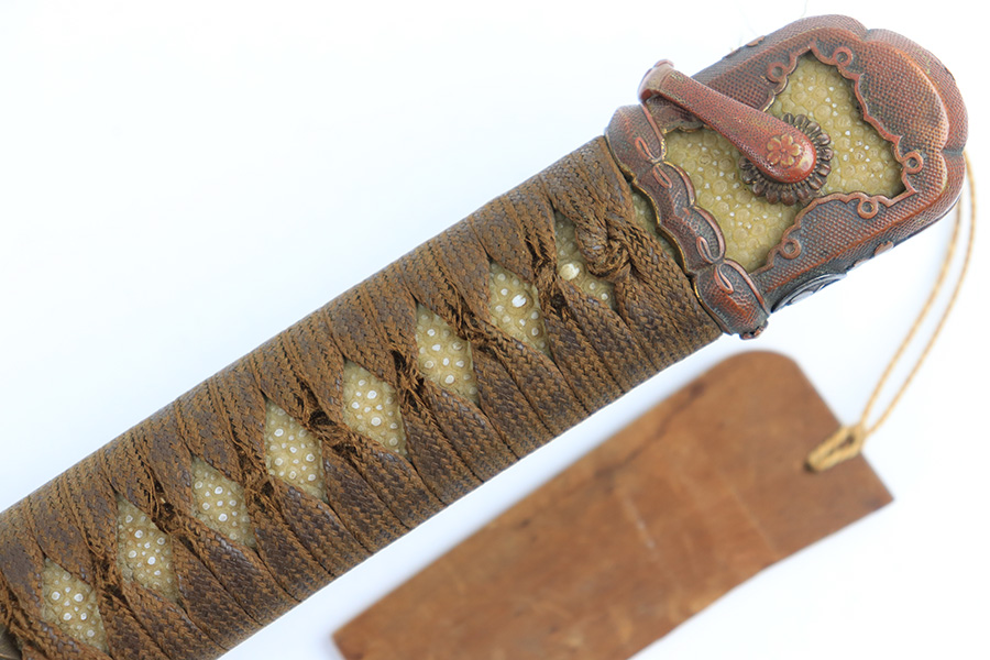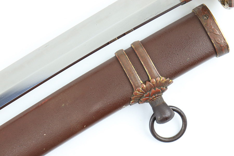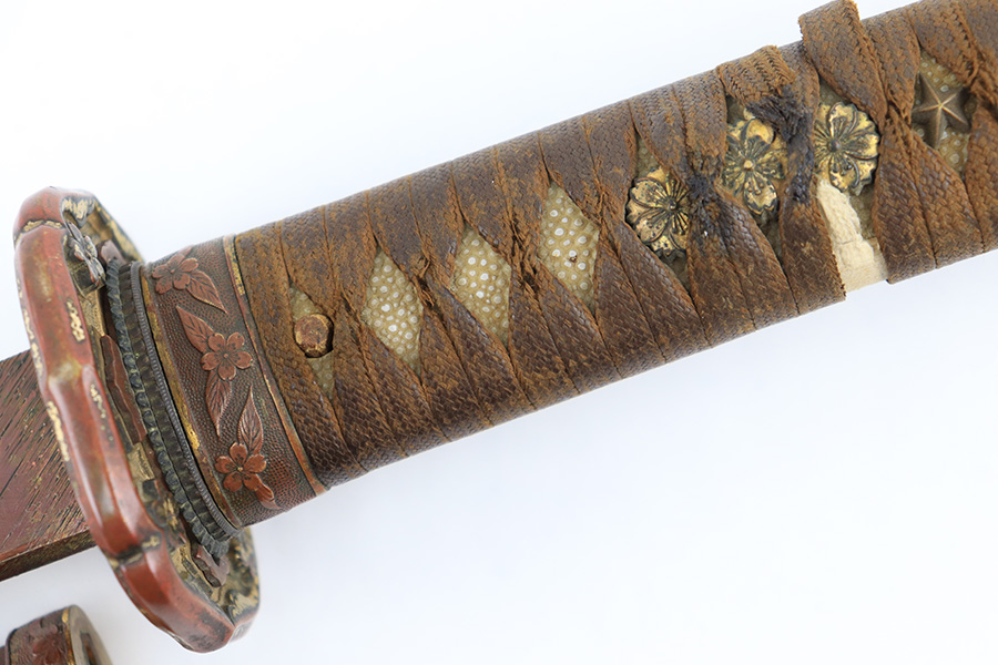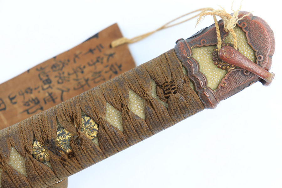 8/4/23 – This is a WW2 assembled Type 98 Army Officer Samurai sword. The sword blade is a late Edo period production (mid 1800’s) that was hand made and water quenched. The blade has a visible graining on both sides, and a nice visible tempered edge. There are some mild surface scratches around the blade ridge, but these are small and minor. There’s also dark lines from cleaning with oil and polish, which creates minor separations in the layers of forged metal over time. This is very minor but worth noting. The tang is short, and has a fake signature (fairly common) despite being handmade, as certain swordsmiths could sell their blades for a premium, even back in the 1800s. The blade is still handmade and quality, however. The fittings are standard WW2 military officer, and are in good condition but show aging and surface wear throughout. The brown cloth wrapping is broken and loose around the middle of the handle. Comes with an attached wood “prayer tag” that we’re not sure the significance of. The scabbard is correct and original from WW2, and in great overall condition with normal surface patina and mild aging.