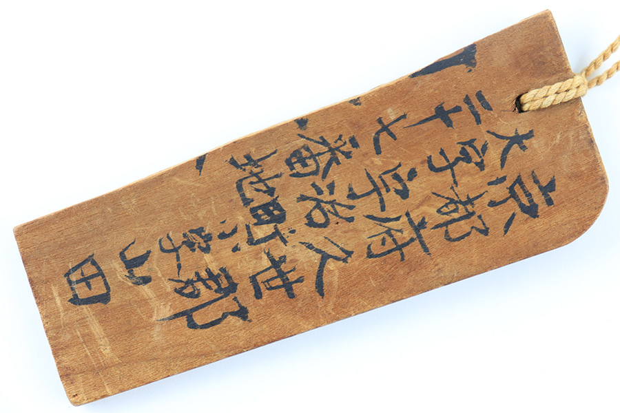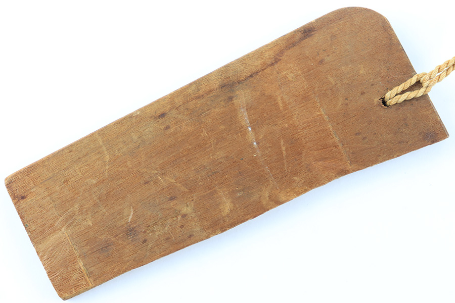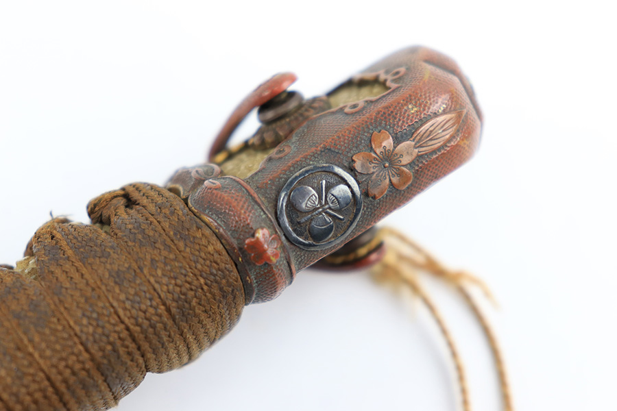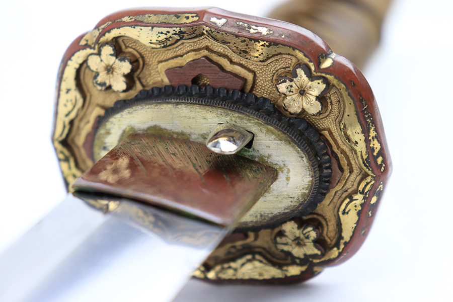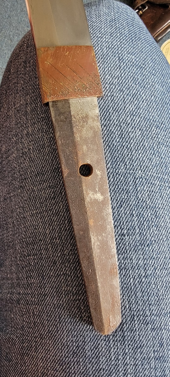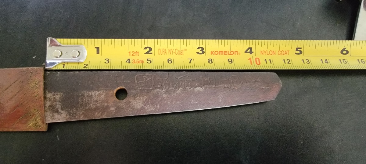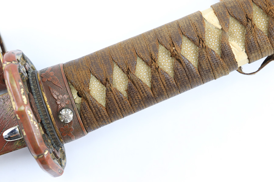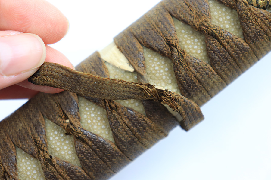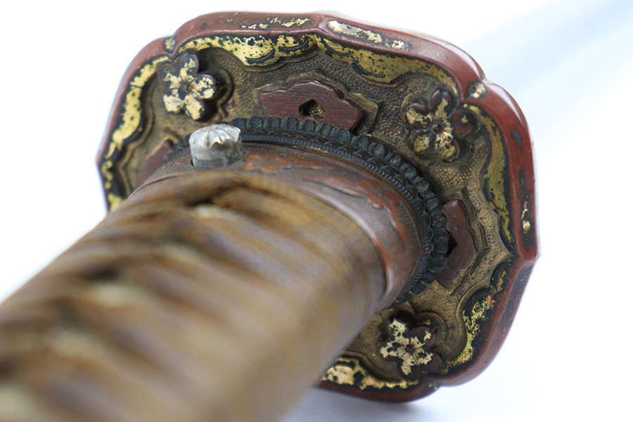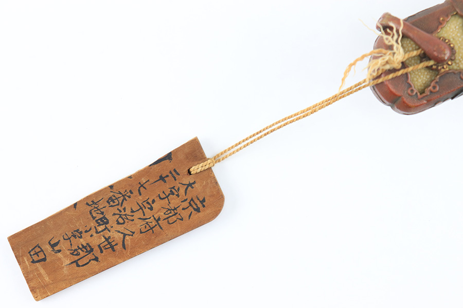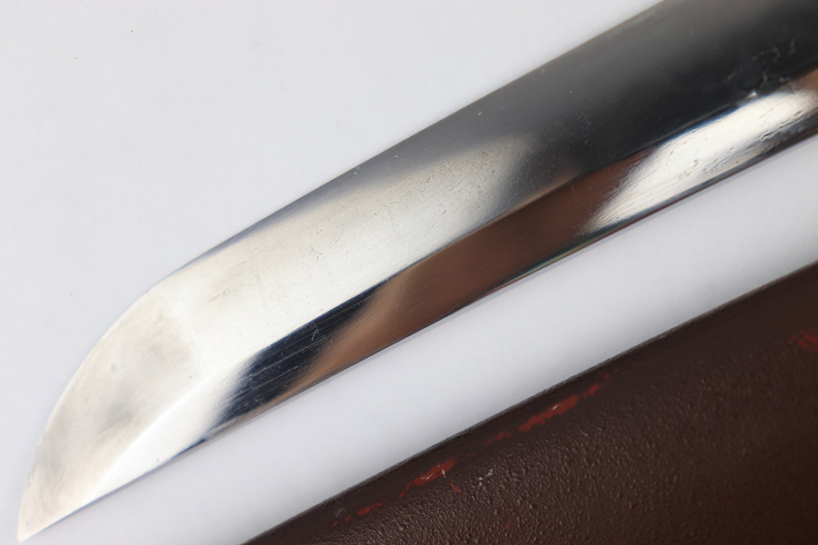 8/4/23 – This is a WW2 assembled Type 98 Army Officer Samurai sword. The sword blade is a late Edo period production (mid 1800’s) that was hand made and water quenched. The blade has a visible graining on both sides, and a nice visible tempered edge. There are some mild surface scratches around the blade ridge, but these are small and minor. There’s also dark lines from cleaning with oil and polish, which creates minor separations in the layers of forged metal over time. This is very minor but worth noting. The tang is short, and has a fake signature (fairly common) despite being handmade, as certain swordsmiths could sell their blades for a premium, even back in the 1800s. The blade is still handmade and quality, however. The fittings are standard WW2 military officer, and are in good condition but show aging and surface wear throughout. The brown cloth wrapping is broken and loose around the middle of the handle. Comes with an attached wood “prayer tag” that we’re not sure the significance of. The scabbard is correct and original from WW2, and in great overall condition with normal surface patina and mild aging.