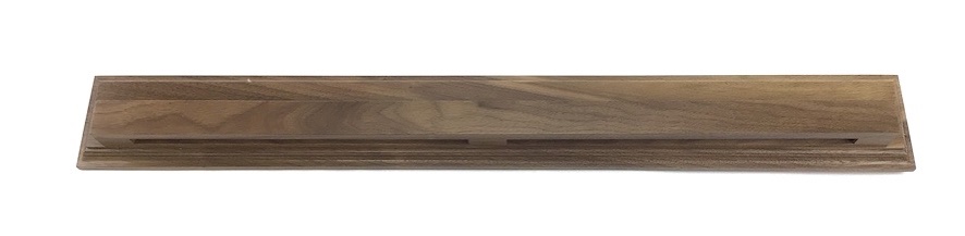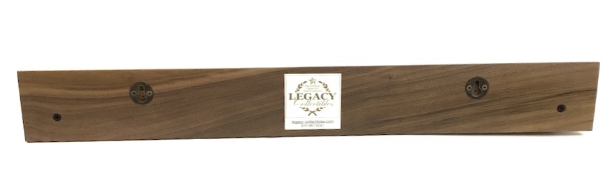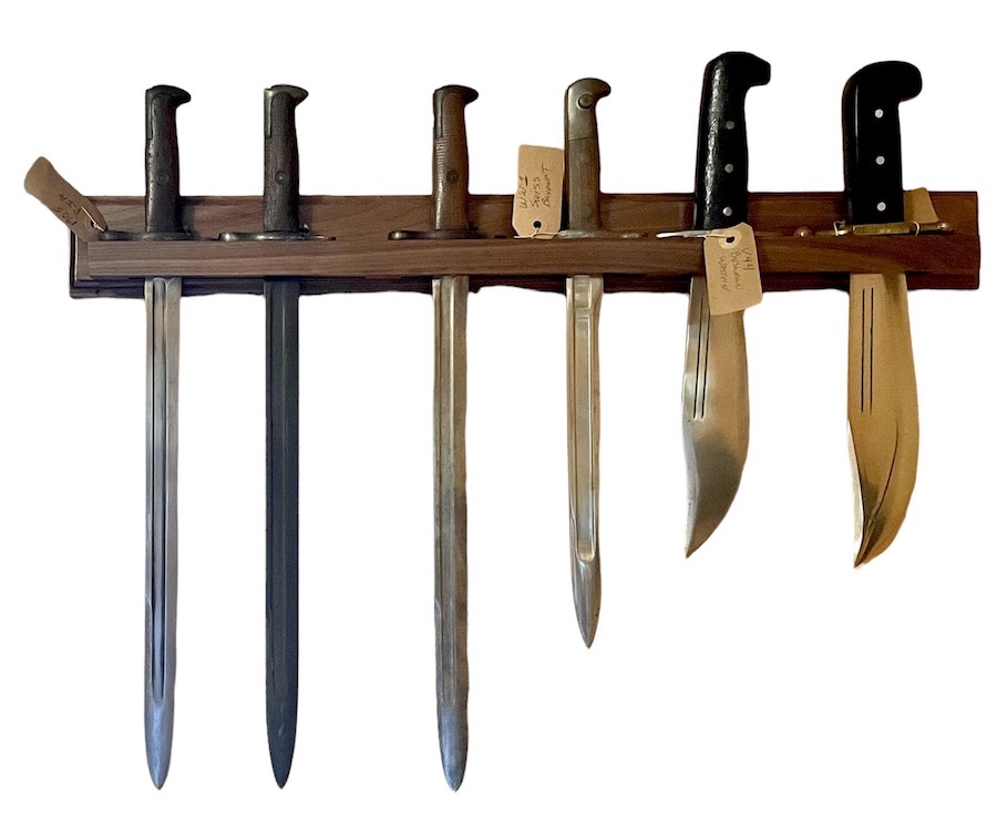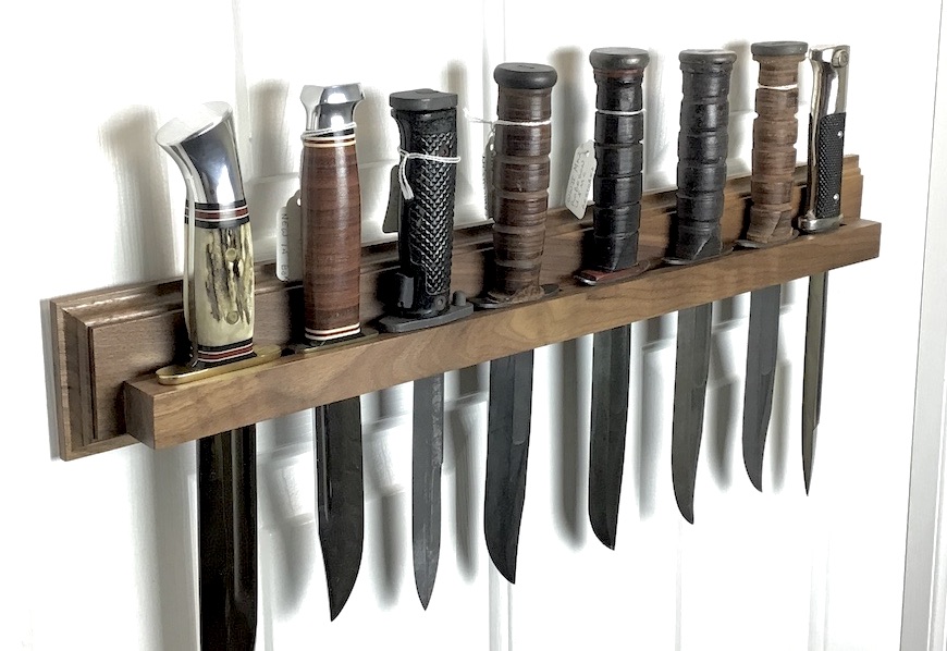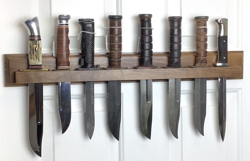 4/20/22 – Brand new. These knife display racks are hand made from solid walnut. They measure 24″ x 3″ and can display up to eight fighting knives or bayonets, depending on the cross guard length. Designed to be hung with the included “key-hole” brackets. Beautiful semi-gloss finish.