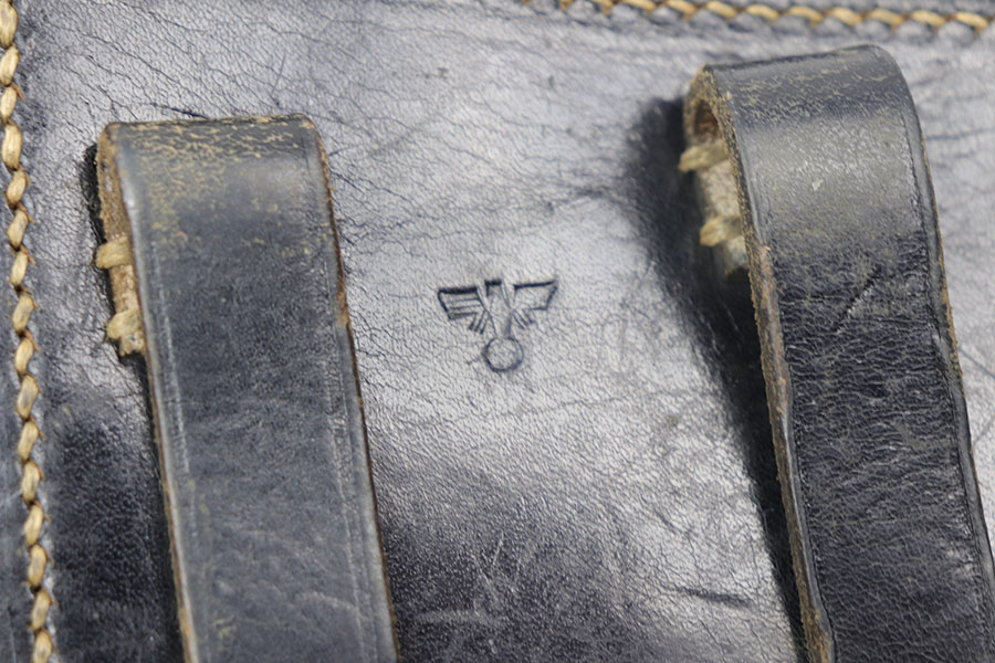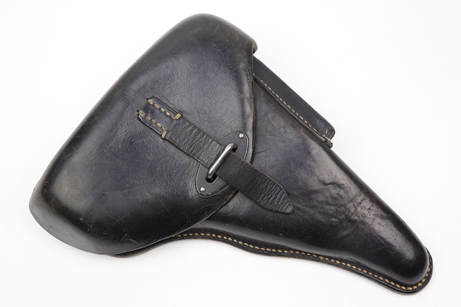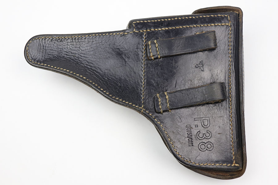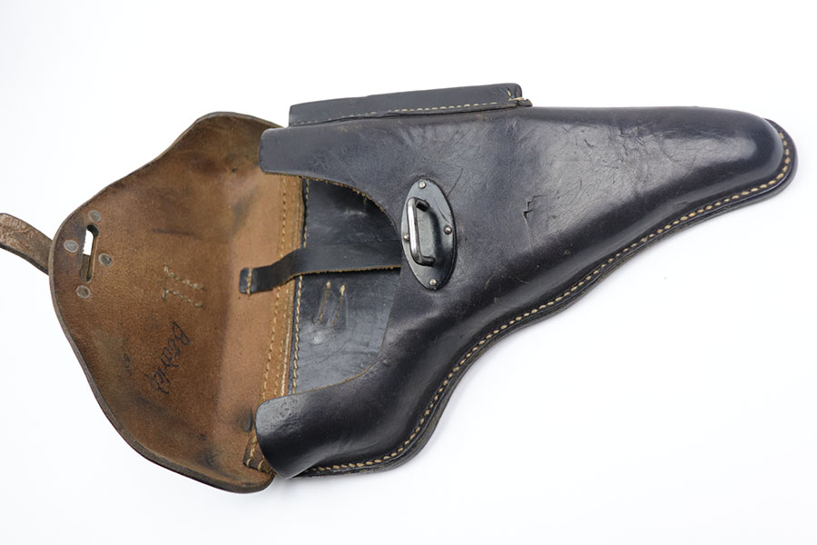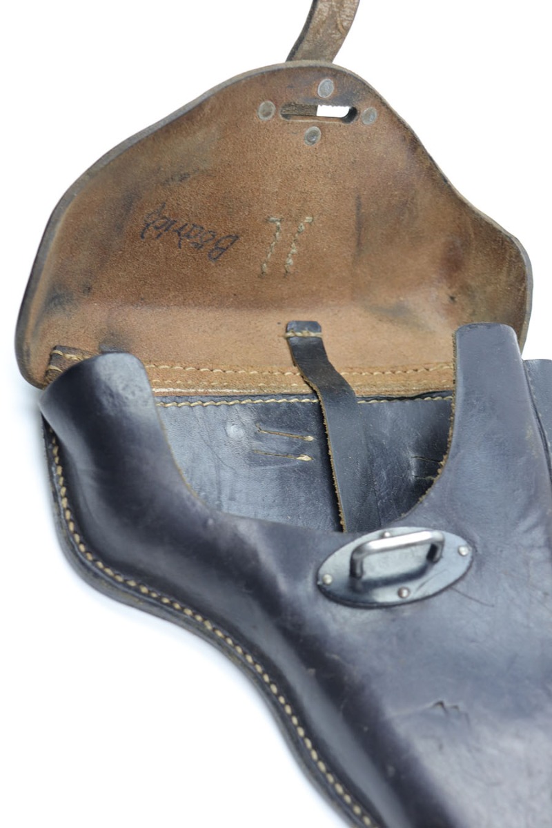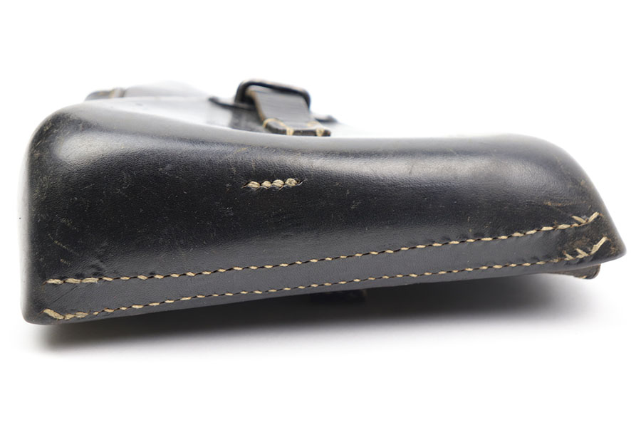 10/30/20 – This is a scarce police P.38 holster from WW2. Hardshell style, when most are softshell. There is also no date stamp on this holster, making it more desirable. The back leather has a police eagle proof stamp, a P.38 stamp, and a unit number stamp. No other markings. The leather has normal pliability but is generally clean and has minimal wear. All original stitching in tact.
