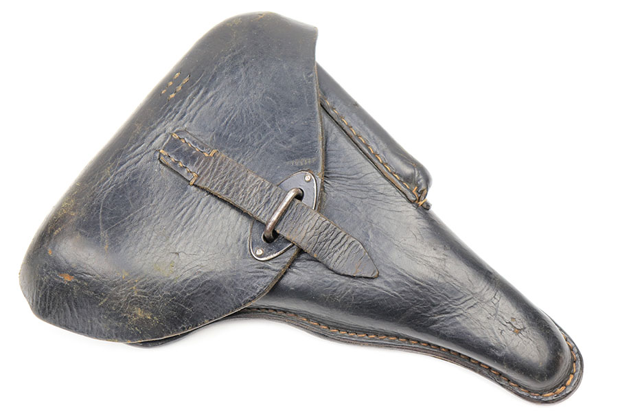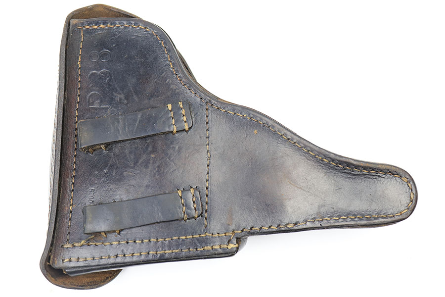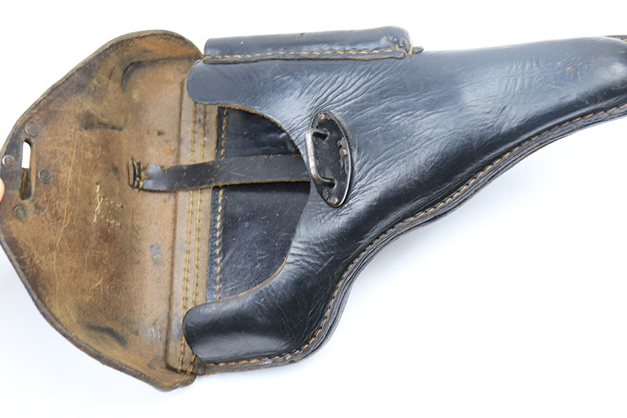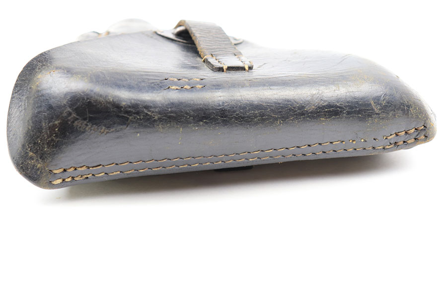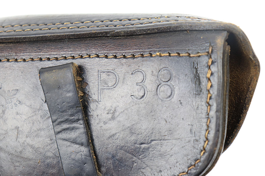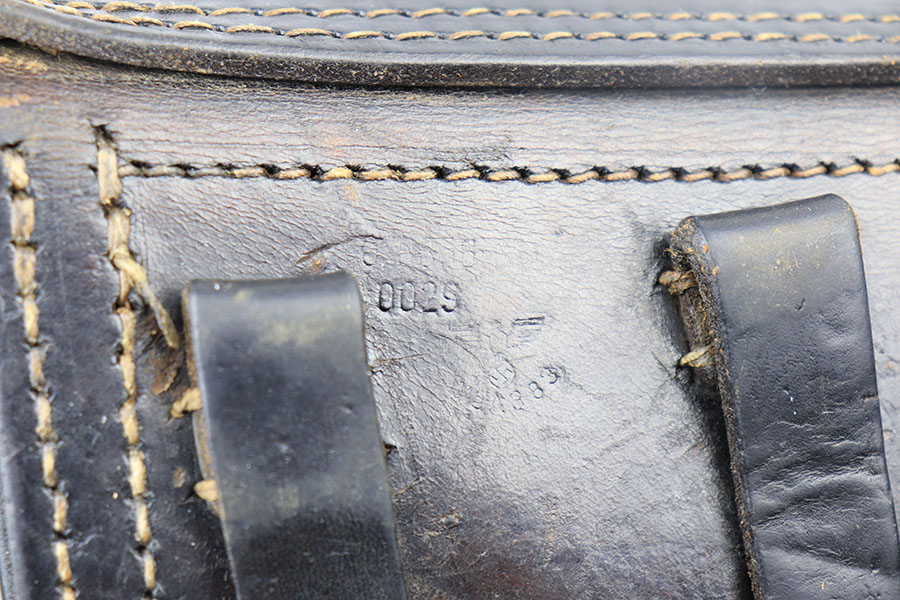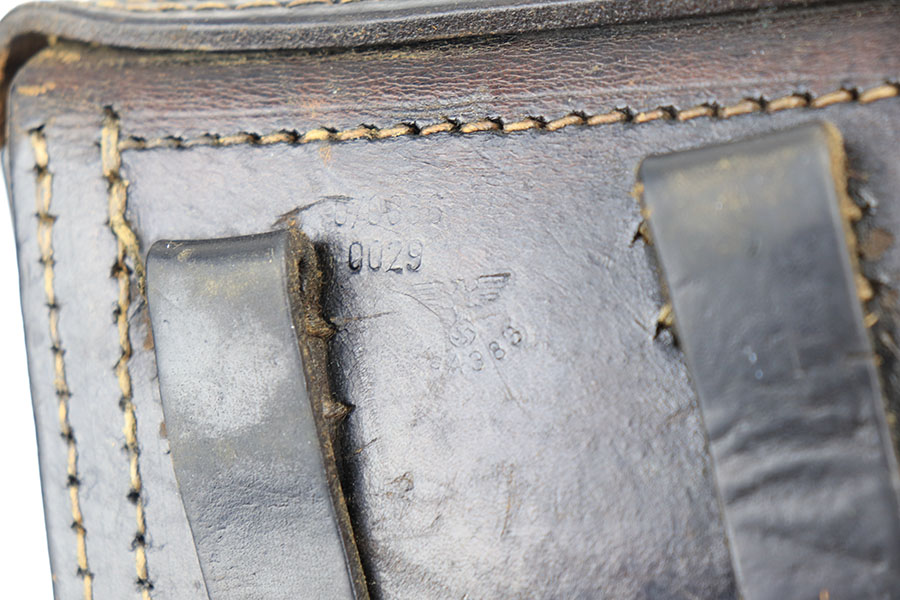 2/12/21 – This is a fairly scarce hardshell Police P.38 holster from WW2. The back of the holster is police unit stamped ending in 0029. There is a waffen military proof underneath that as well as a P.38 stamp. The black leather has some surface wrinkling throughout and normal surface wear / aging but no major issues. No stitching flaws either.