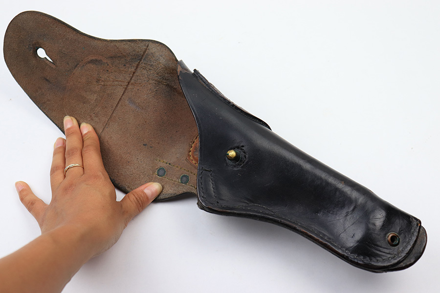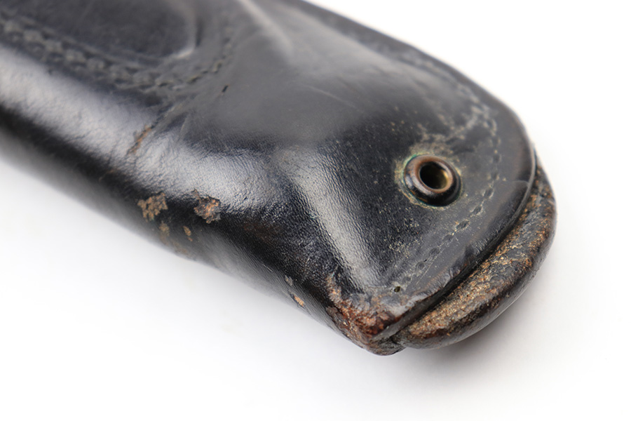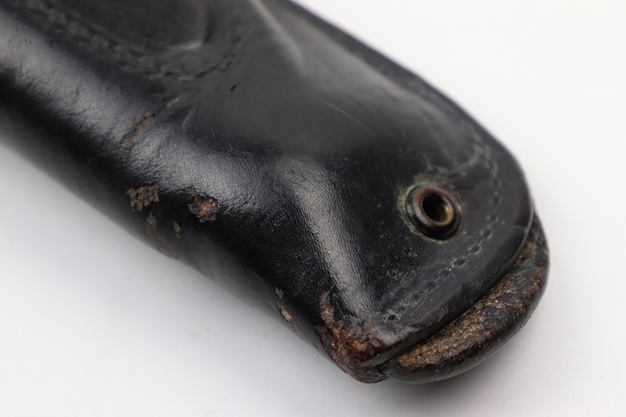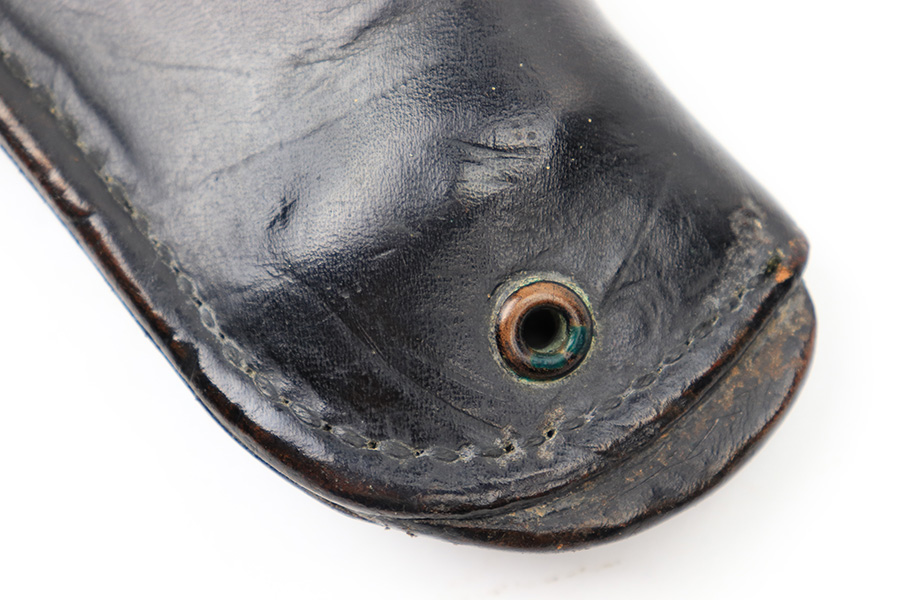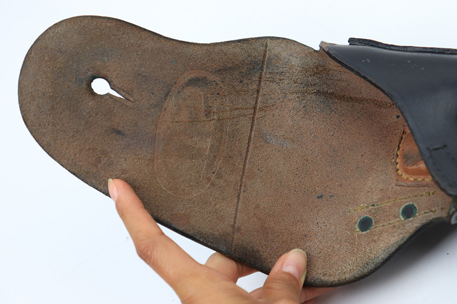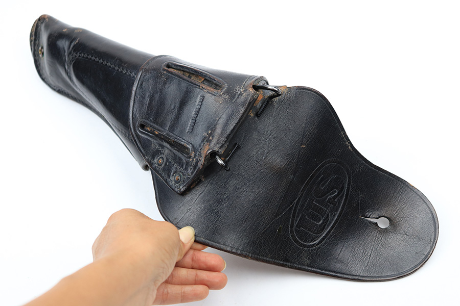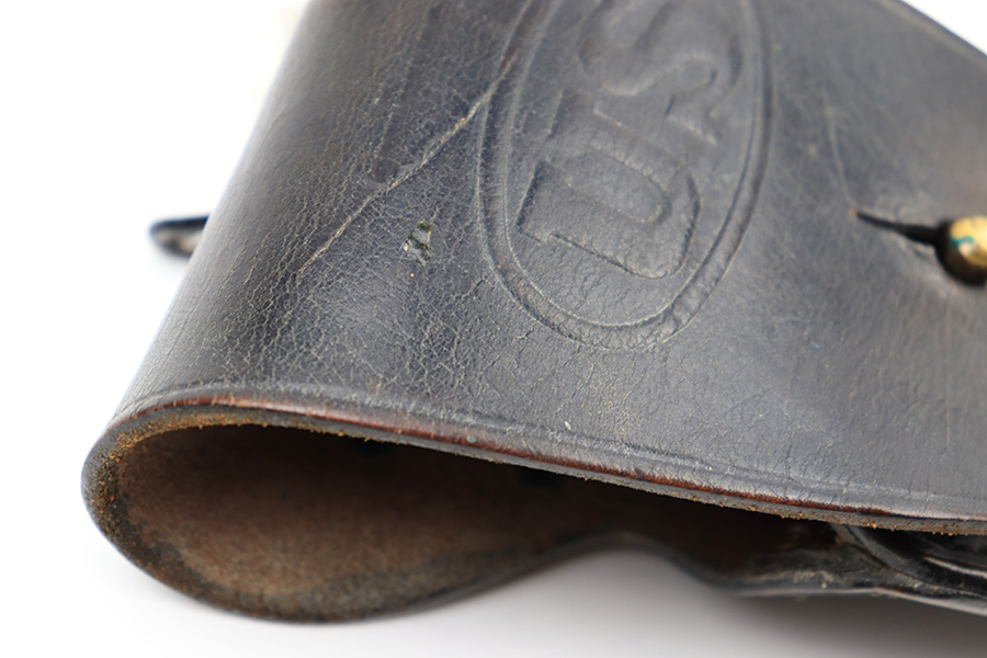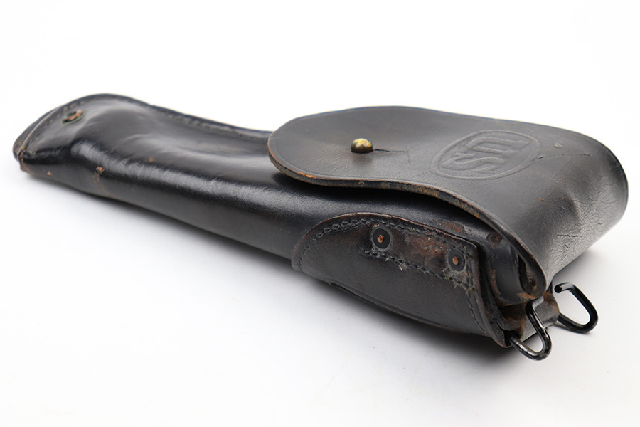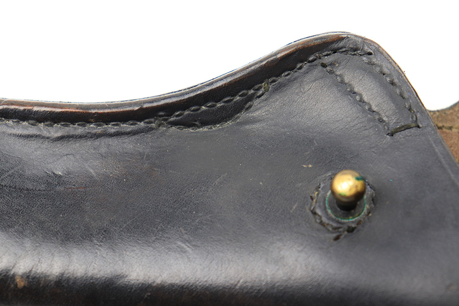 7/11/22 – This is an original M1916 holster made by Harpham Bros. This maker is a scarce WW1 producer of the M1916 holster for the M1911 pistol. The holster is in great condition with some mild surface wrinkling on the front and top leather. There’s some very mild scuffs and wrinkling on the back leather as well but overall the leather is in great shape with minimal pliability. Clean interior leather. No notable stitching flaws. Maker stamped on the back leather and US stamped on the front.