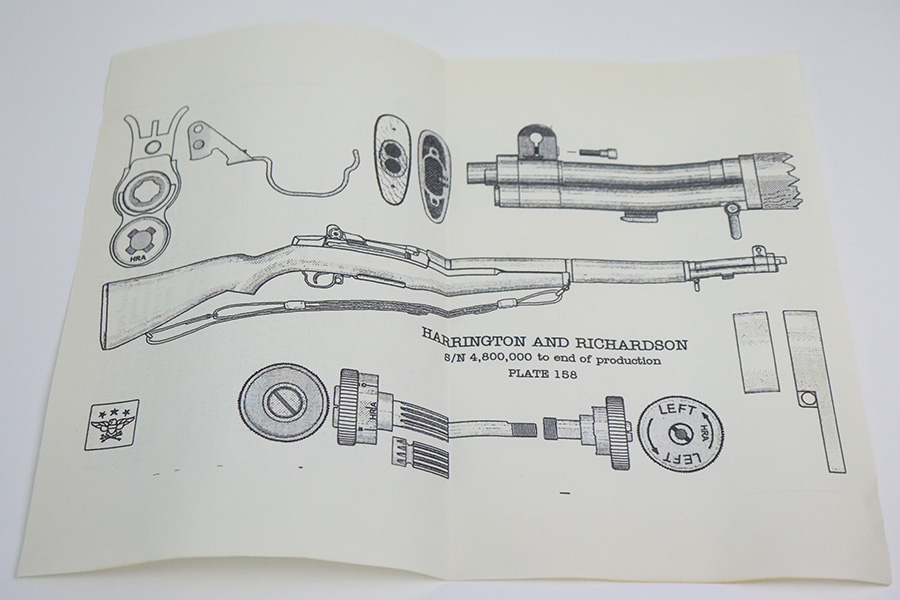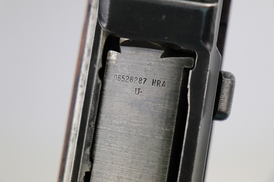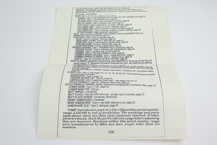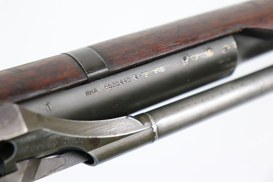 6/8/22 – This is a very nice example of a Harrington & Richardson M1 Garand manufactured in 1955. It has an HRA barrel that is dated April of 1955. DOD stamps on the barrel and stock. Overall, the gun is in very nice condition. On the receiver, minor wear on the high edges and thinning on both sides. Some pin-pricking on the right side of the receiver. Wear around the muzzle and noticeable thinning on the gas tube. The stock is nice with some dings and bruises here and there – a couple of more noticeable gouges on the left side. There is some leftover tape residue on the right side of the butt stock. Excellent bore with strong rifling. Muzzle reading : 2. Throat reading: 5. Comes with a couple of papers: a parts list and diagram.