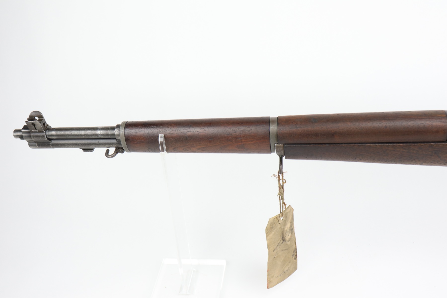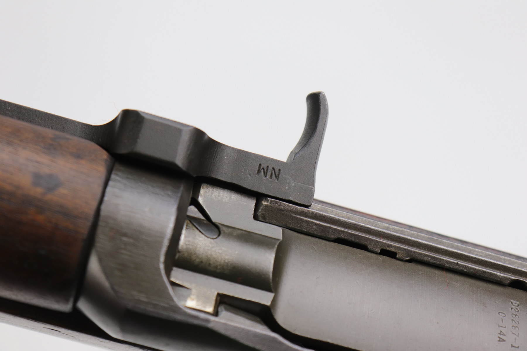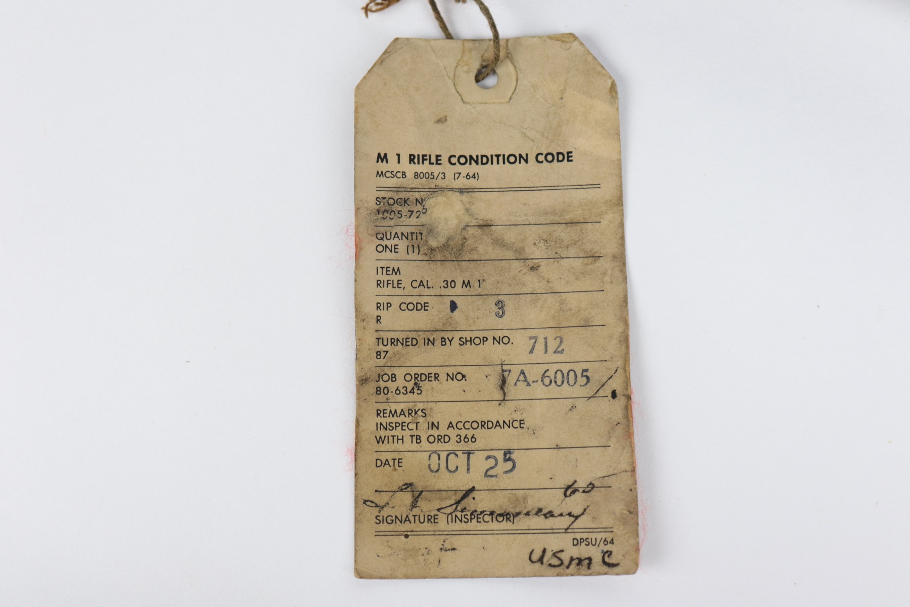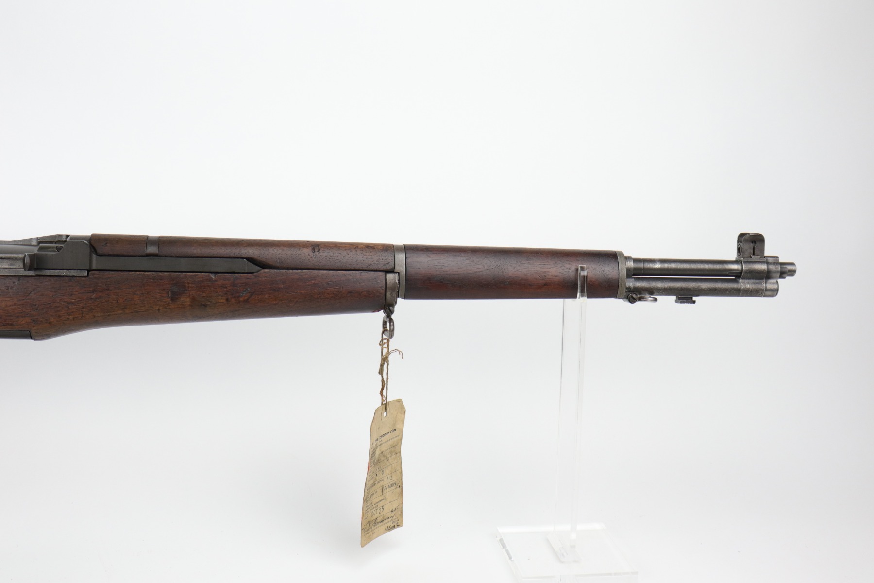 10/7/20 – This is an excellent M1 Garand made by Harrington and Richardson in 1953. The barrel was made by Springfield Armory in 1943. The op rod is marked “NM” for National Match. From the original inspection tag included on the gun, we believe this gun was refurbished by the USMC. The tag is hand-numbered to the gun on the back. Looks like it may have been written in modern pen. The gun has retained most of its finish, but there are areas of wear on the barrel and gas cylinder. There is spotty oxidation visible under the finish throughout. The stock is excellent, just some handling marks, small chips, and bruising here and there. There are three scratches and an “A” marking on the grip. The gun is fully functional. The bore is shiny and minty.