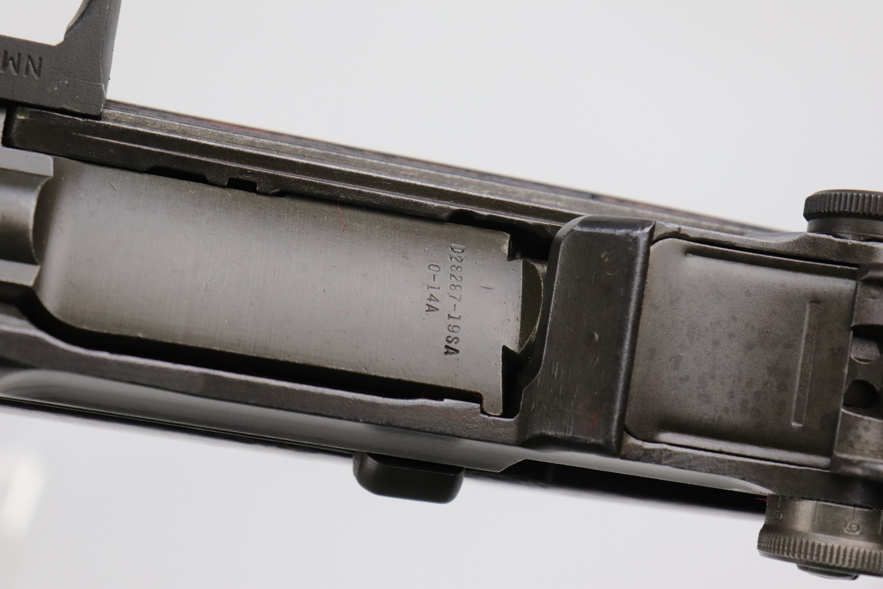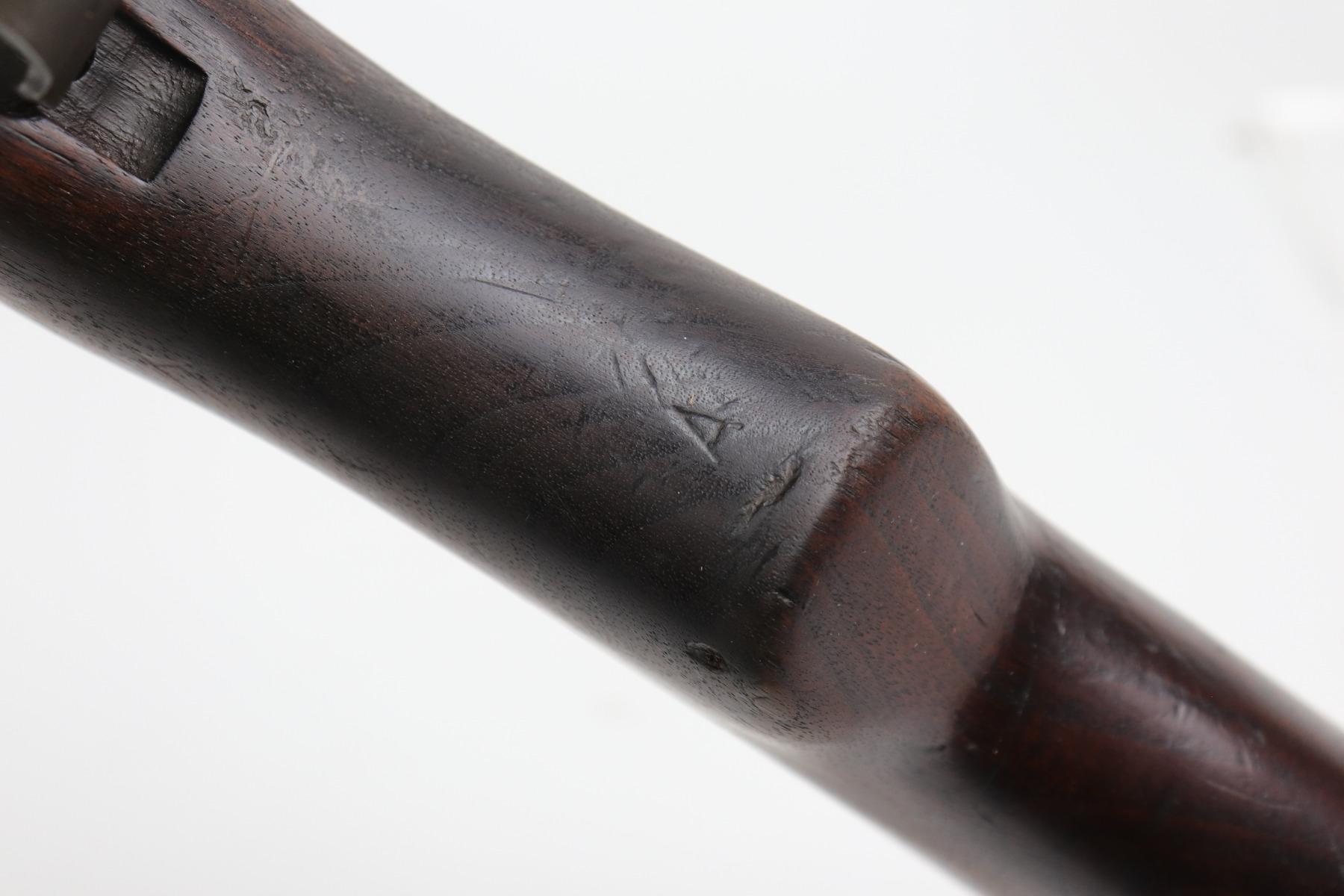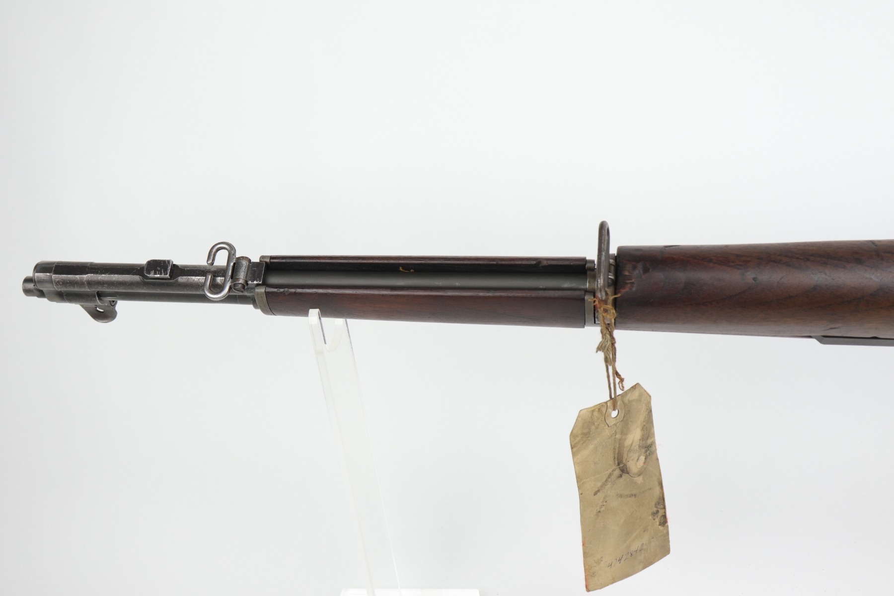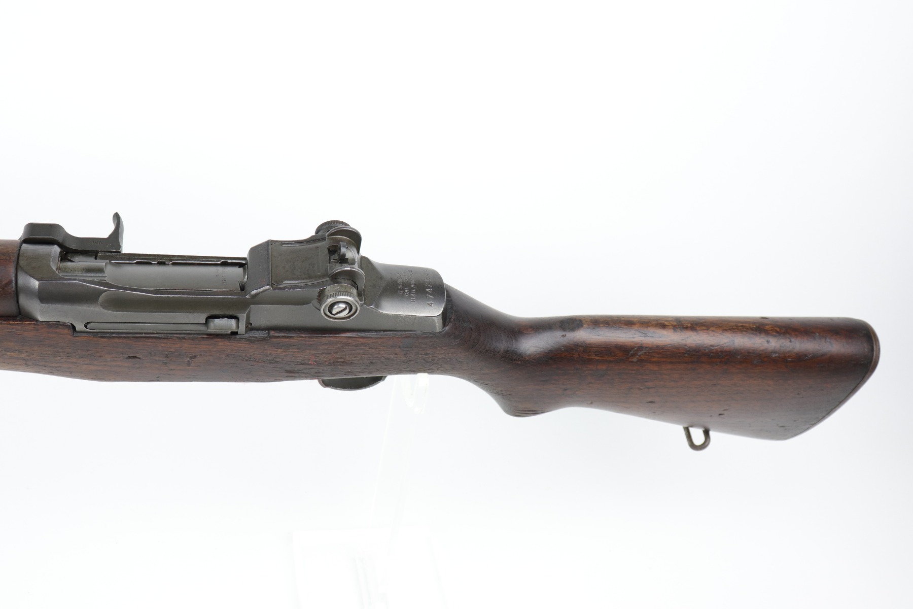 10/7/20 – This is an excellent M1 Garand made by Harrington and Richardson in 1953. The barrel was made by Springfield Armory in 1943. The op rod is marked “NM” for National Match. From the original inspection tag included on the gun, we believe this gun was refurbished by the USMC. The tag is hand-numbered to the gun on the back. Looks like it may have been written in modern pen. The gun has retained most of its finish, but there are areas of wear on the barrel and gas cylinder. There is spotty oxidation visible under the finish throughout. The stock is excellent, just some handling marks, small chips, and bruising here and there. There are three scratches and an “A” marking on the grip. The gun is fully functional. The bore is shiny and minty.