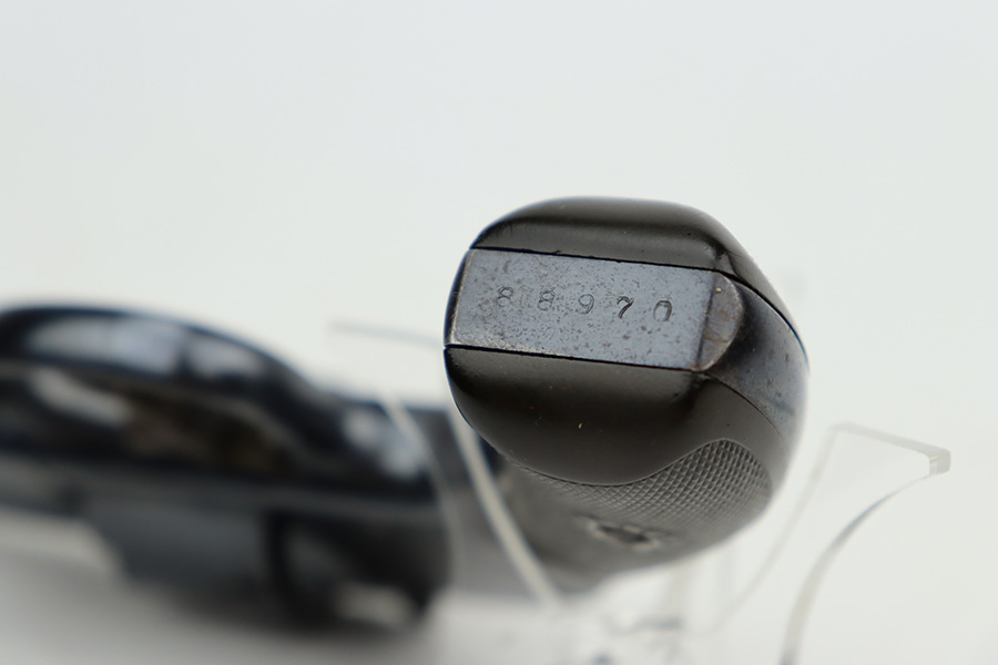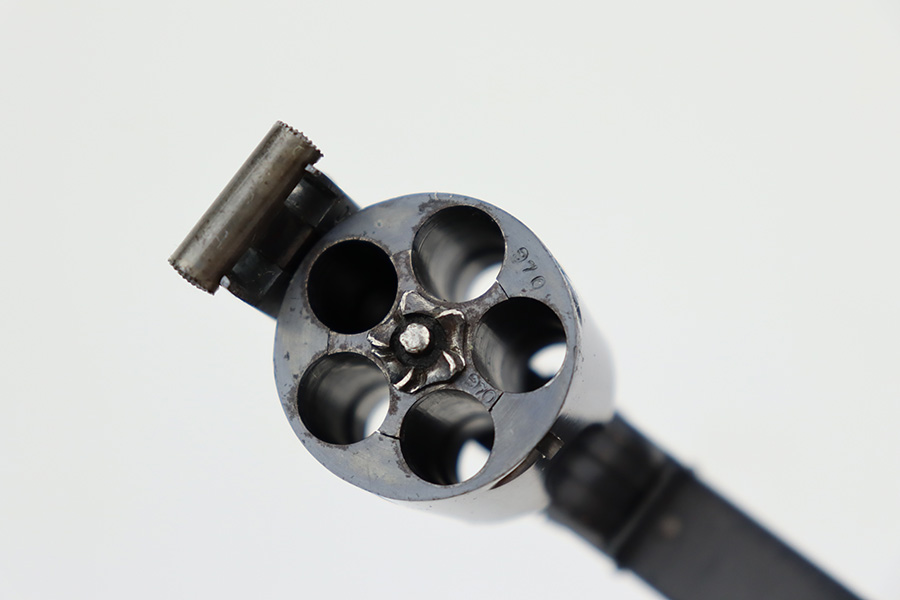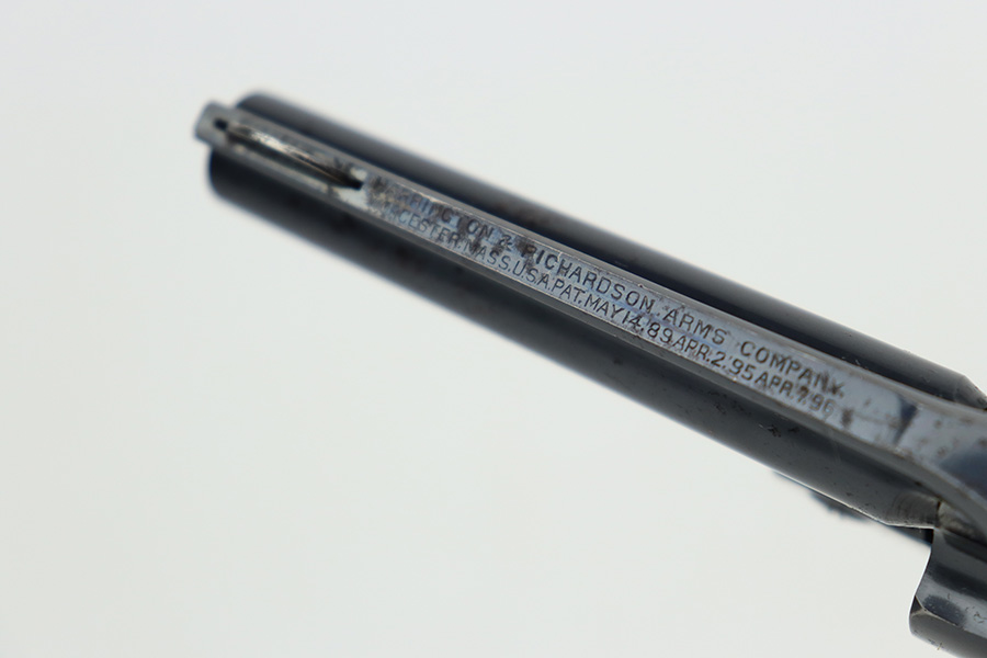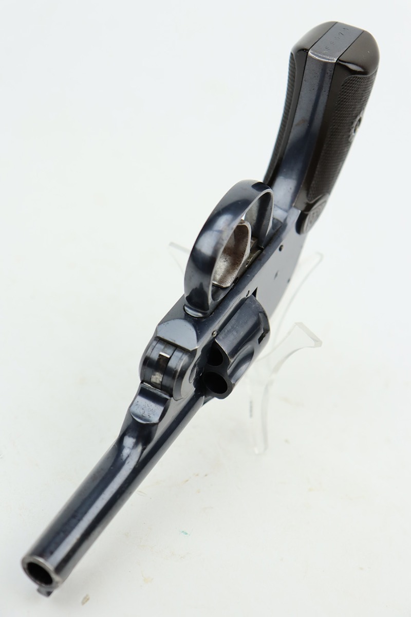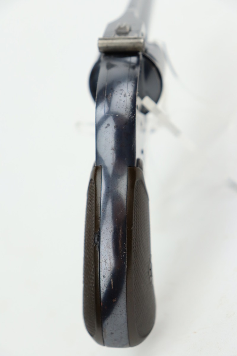 7/28/23 – This is a very nice example of an H&R Top-break Bicycle revolver, manufactured in the early 1900’s and chambered in .32 Caliber. All matching. The gun has retained most of its original finish. While there is very little actual finish loss, there is light spotty oxidation throughout. Fitted with nice period-correct blackish-brown bakelite grips – small chip along the edge of the left panel. The bore is shiny with strong rifling for the most part, but there are two small areas of pitting.