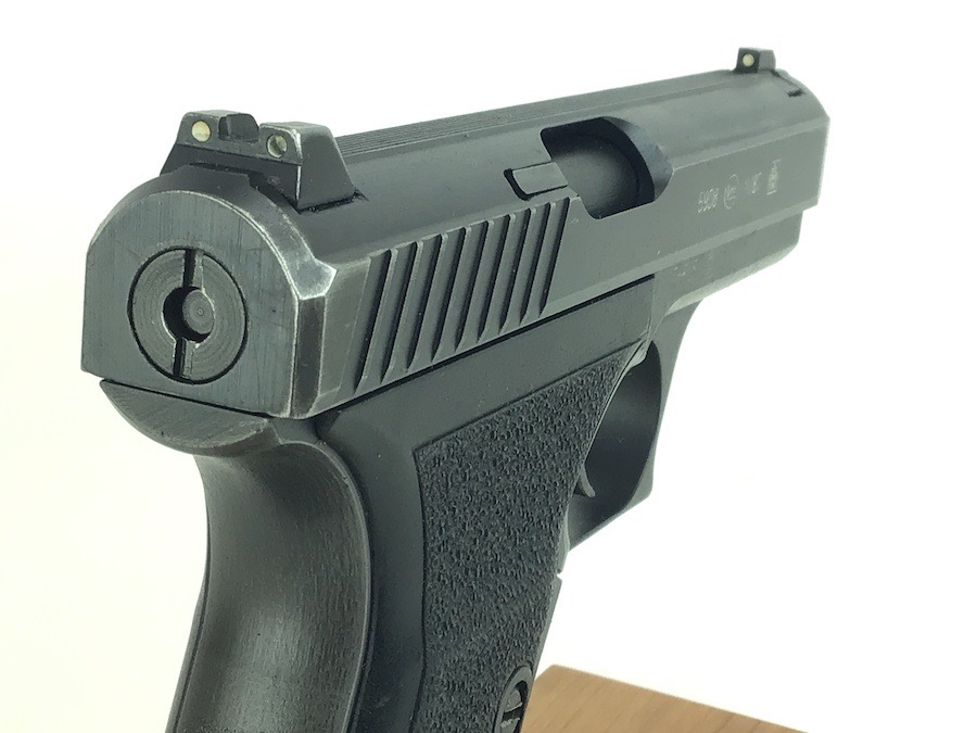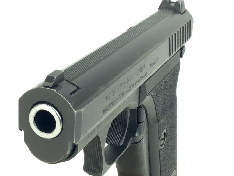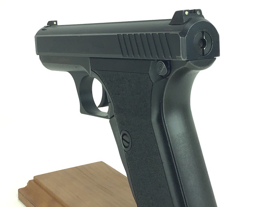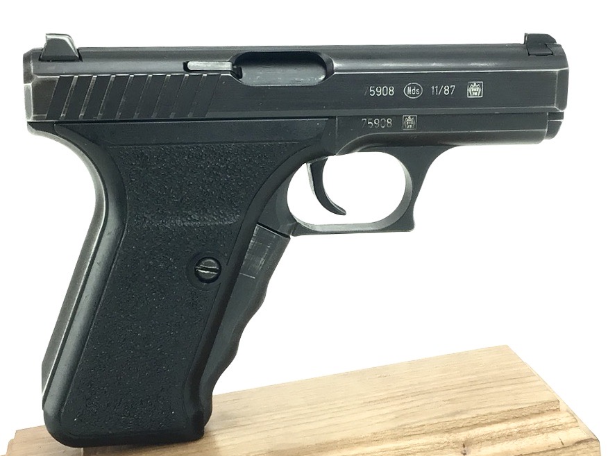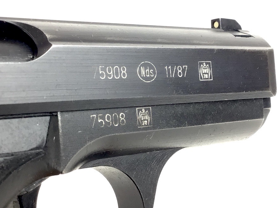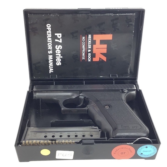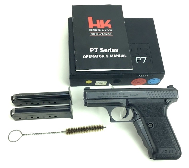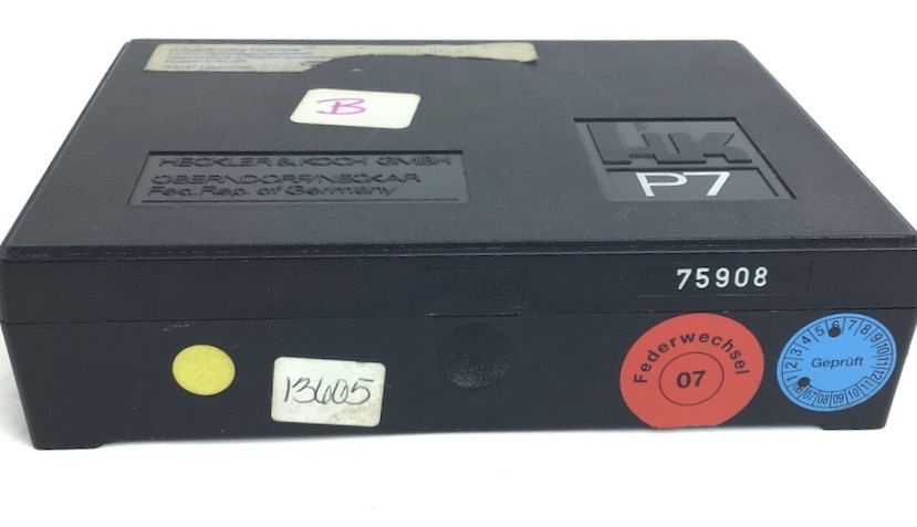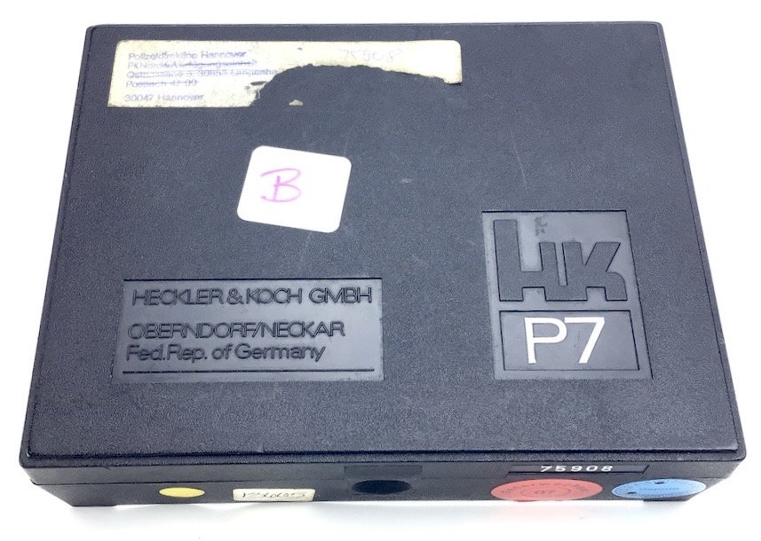 6/14/24 – This is a great looking Heckler & Koch P7 in its original, matching box. The pistol has minor high edge wear but is otherwise in great condition. It is NDS marked on the slide, which refers to a police trade-in P7 which was carried in the German state of “Niedersachsen” (Lower Saxony). The original box is numbered to the gun, and contains the manual, cleaning rod, and spare magazine. Excellent bore.