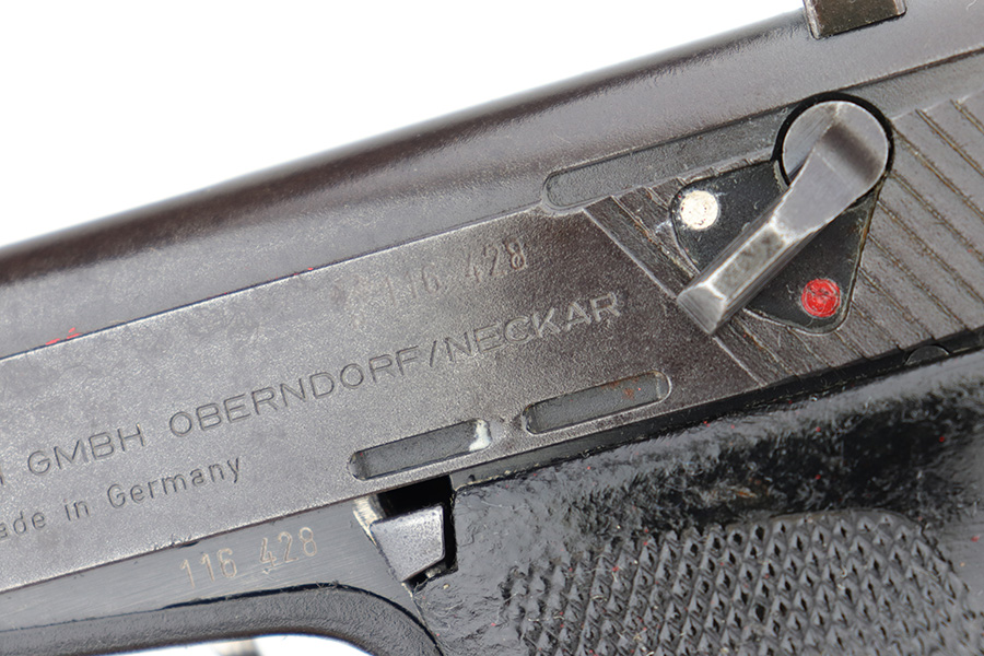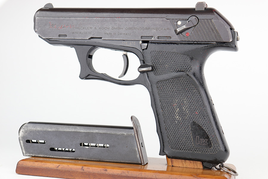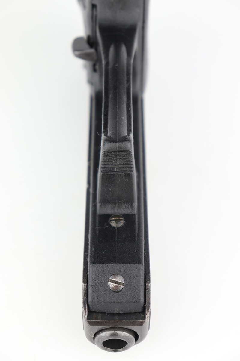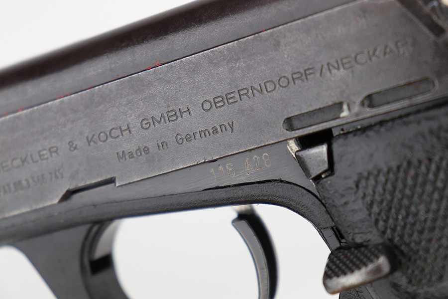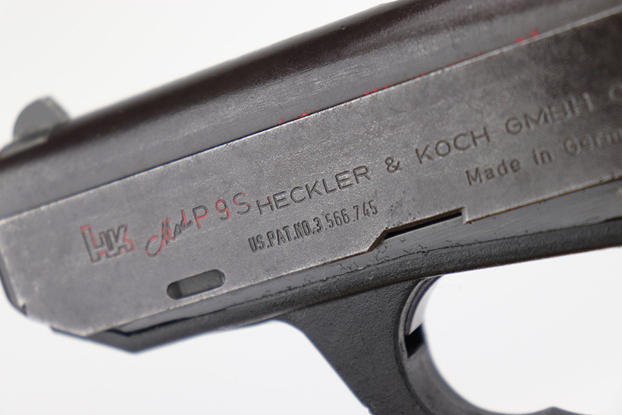 1/16/23 – This is a nice example of an H&K P9S manufactured in 1978 and chambered in 9mm. It is all matching, has the proper West German proofs, but there is an import mark on the top of the slide. There is very little actual finish loss, but there is spotty oxidation along both sides of the slide and on the barrel. Comes with a proper black bakelite grip – tiny chip in the bottom left corner. It also comes with two magazines – one is sealed in a bag. The bore is excellent and shiny.