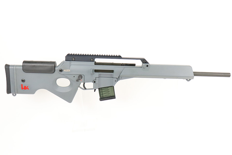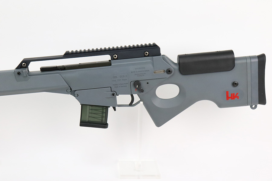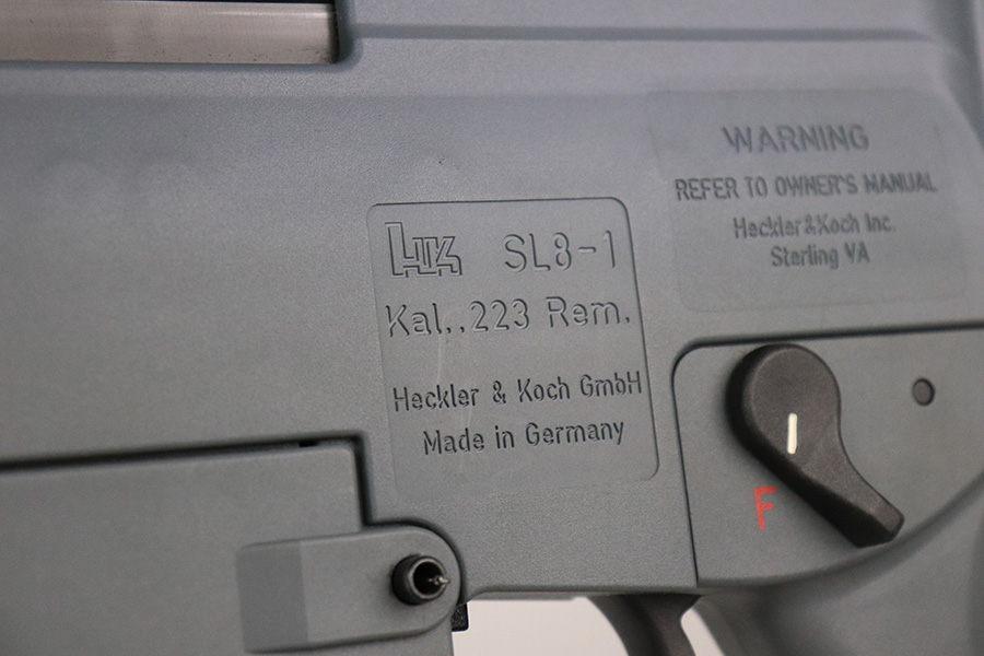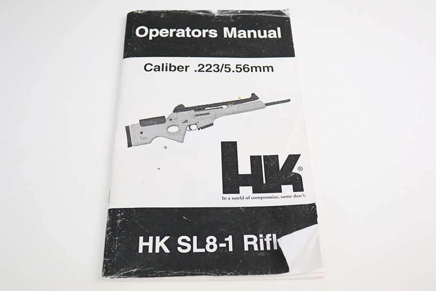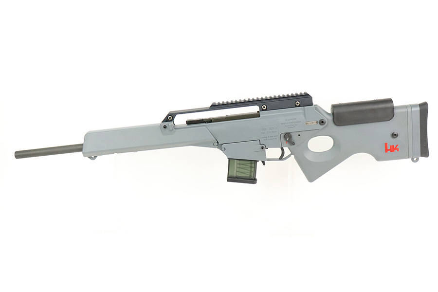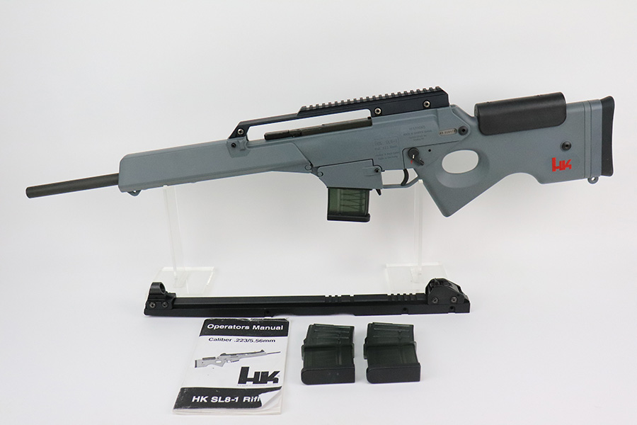 7/27/22 – This is an original Heckler & Koch SL8-1 from 1999 in excellent condition. It has just minor surface scuffs on the receiver and barrel, and an excellent bore with only minor signs of use. The SL8-1 is the grey US-import version of the rifle. It has a single-stack magazine and its sighting system consists of a long rail with iron sights. The bolt is slightly modified to accommodate the single-stack magazine. The forearm is not vented.[ It features a short stroke piston actuated gas operating system, and is an advanced gray carbon fiber polymer construction based on the German Army G36 rifle. It has a thumbhole stock with adjustable cheekpiece and buttstock. Comes with a total of three original 10rd magazines. It has a modular and removable Picatinny rail, as well as a spare rail with removable iron sights. It has a 20.8in cold hammer forged heavy barrel. Also comes with manual.