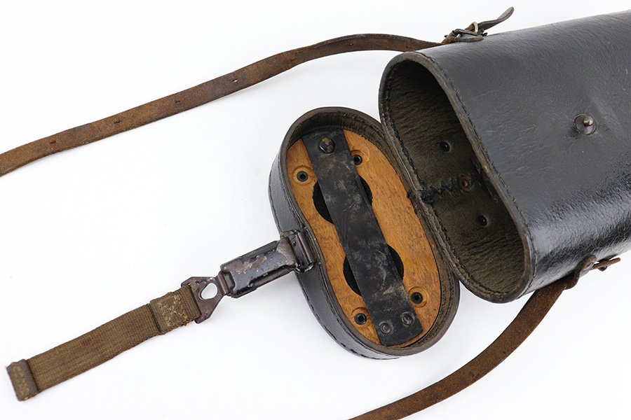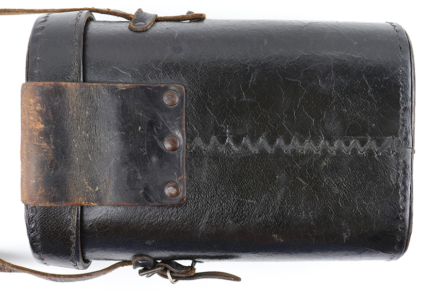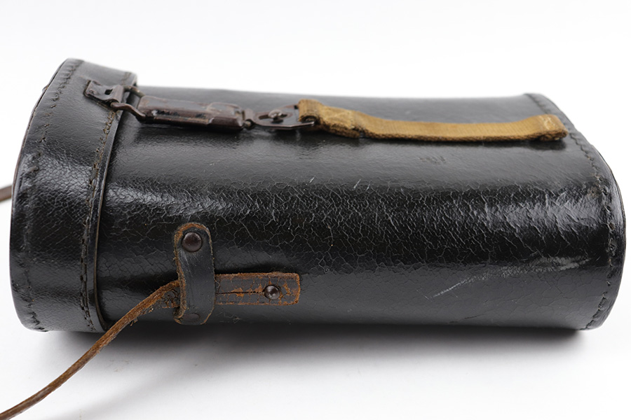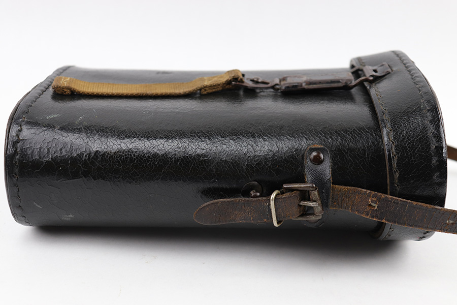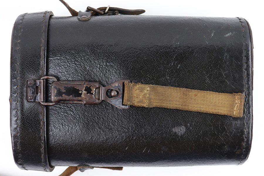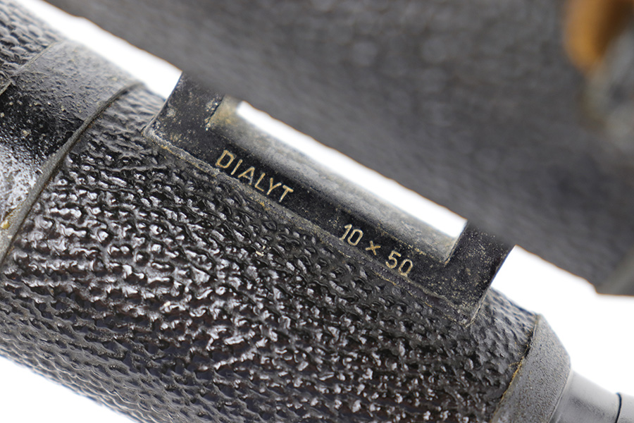 5/24/23 – This is an original pair of WW2 German “Panzer Glass” binoculars. These were designed for use in armored divisions. This example is in near-excellent condition, complete with original carry straps on both the binoculars and the case. The binoculars display some mild surface wear and aging around the edges and metal areas, but the adjustment knobs are fully functional, and the optics are crisp and clean. The underside of the bridge is maker-marked, serial-numbered, and marked “DIALYT 10×50”. The black leather case shows mild surface wrinkling and signs of aging but has no significant issues. There are a few loose and missing stitches around the top lid and base of the case, but this doesn’t affect functionality. The interior is fairly clean.