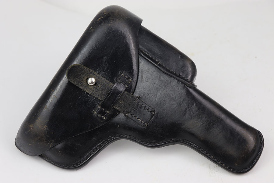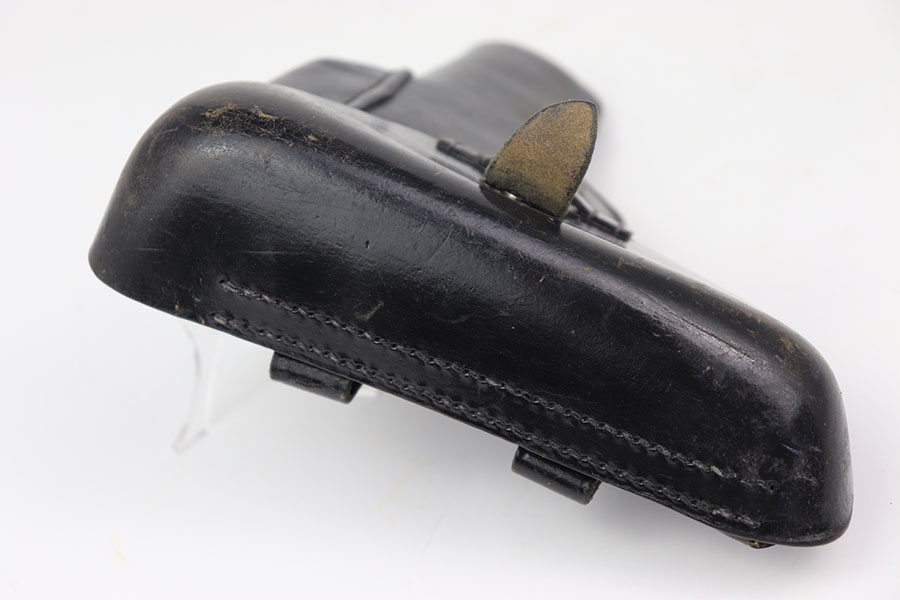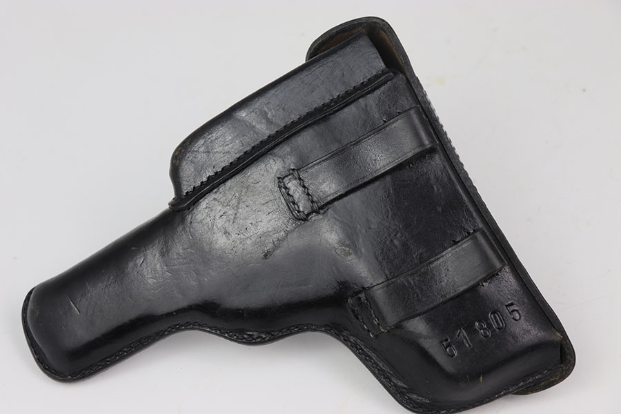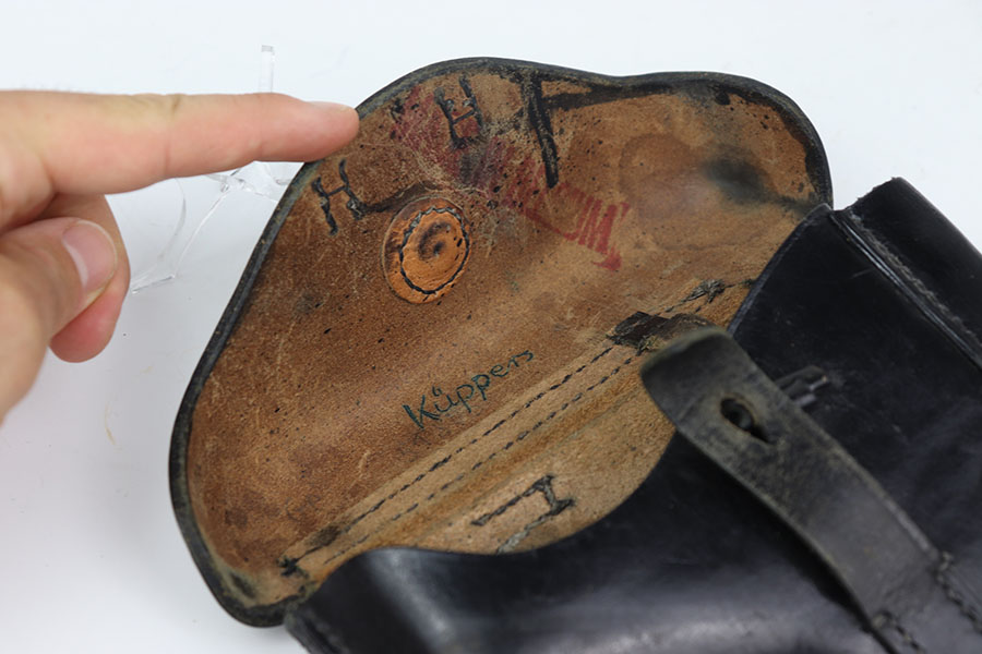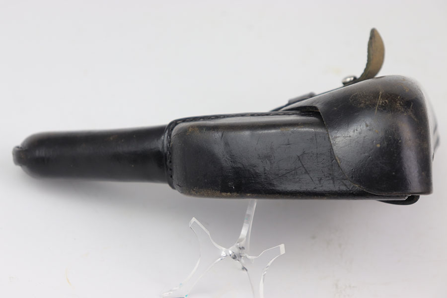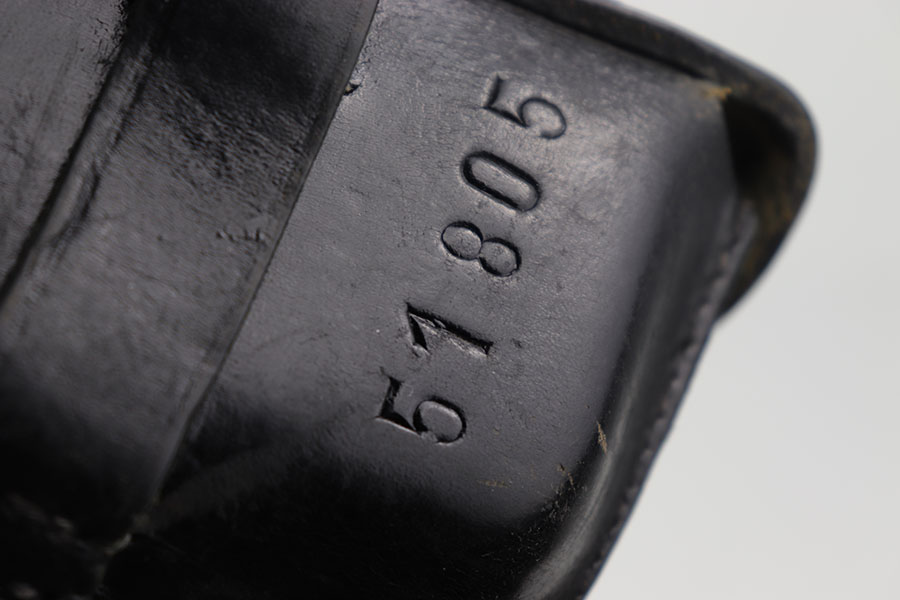 7/15/24 – This is an original German Police issued FN Browning Hi Power holster. This holster is in excellent condition with very little wear throughout. The holster has a clean interior with an ink stamp that reads, “Klippers”. The backside of the holster is marked with a serial number, “51805.”