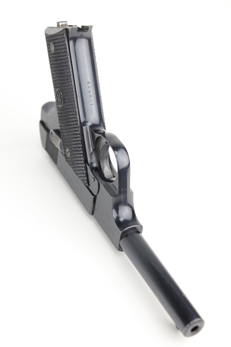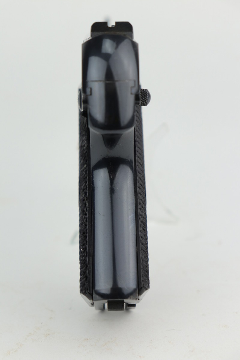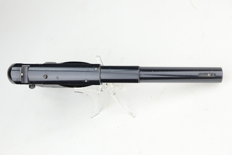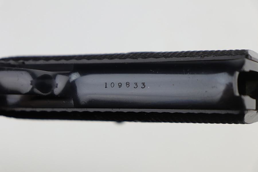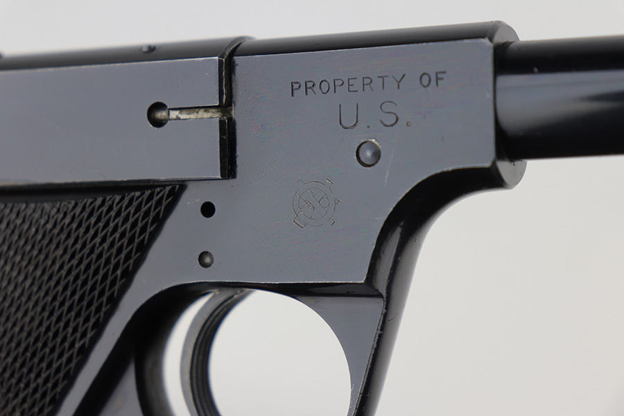 11/19/21 – This is an excellent example of a Hi Standard Model B issued to the US military in the early 1940’s. It is all matching, is “Property of US”-marked, and has the proper cross-canon military cartouche on the right side of the gun. There are just hints of wear on the high edges and around the muzzle. Some light scratchy wear on the barrel. There are some other very light scratches here and there. Comes with excellent “HS” bakelite grips and a proper magazine. Mint bore.