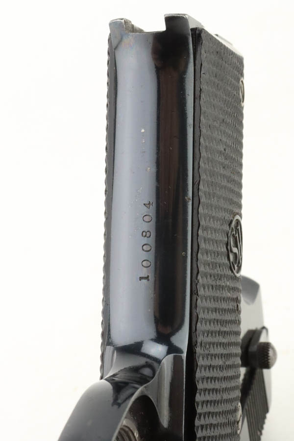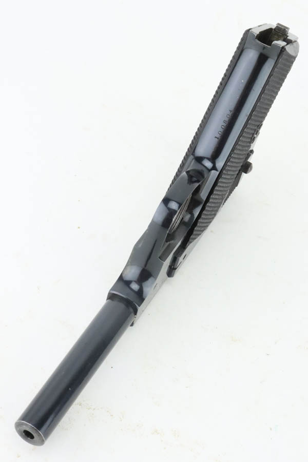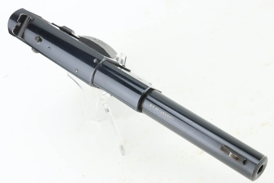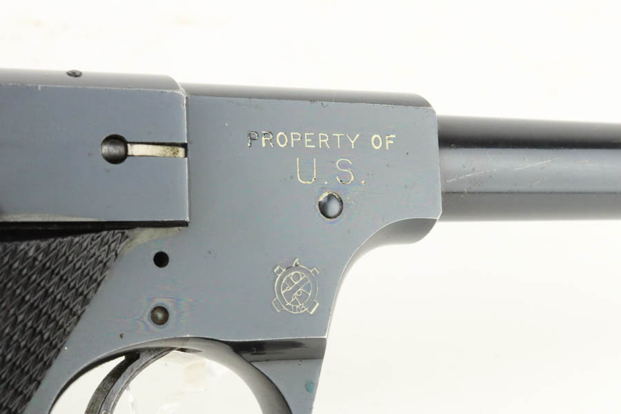 6/27/24 – This is an excellent example of a Hi Standard Model B Target pistol, manufactured in the 1940’s. These were issued to the US military for service weapons training. They were widely used by the US Navy. About 14,000 made. This one is all matching, has the proper military cross-canon cartouche, and is properly “Property of US”-marked. It has retained about 97% of its original high polish finish. Just hints of wear on some of the high edges and tiny scratches and handling marks here and there. Fitted with black bakelite grips and comes with one proper magazine. Mint bore.