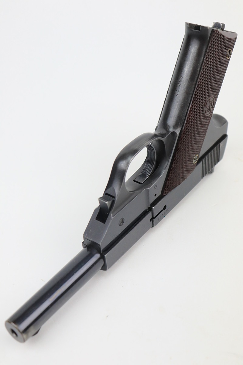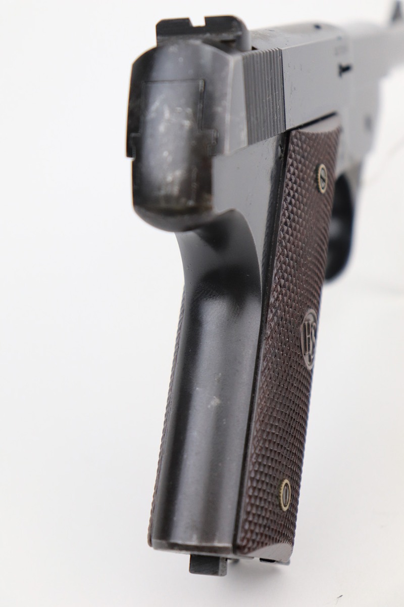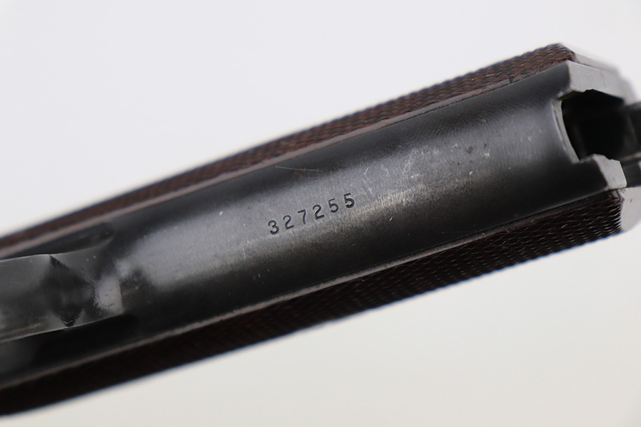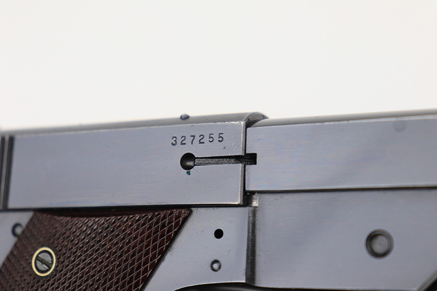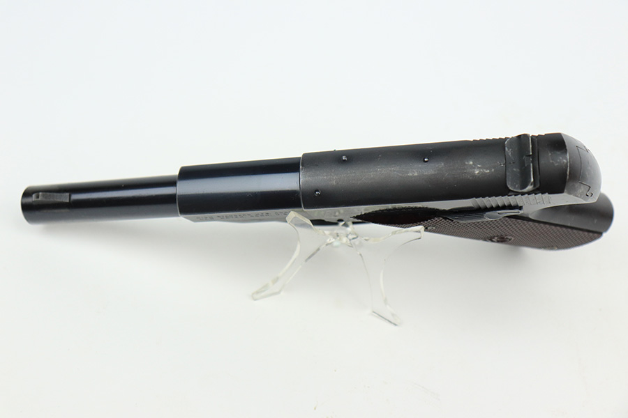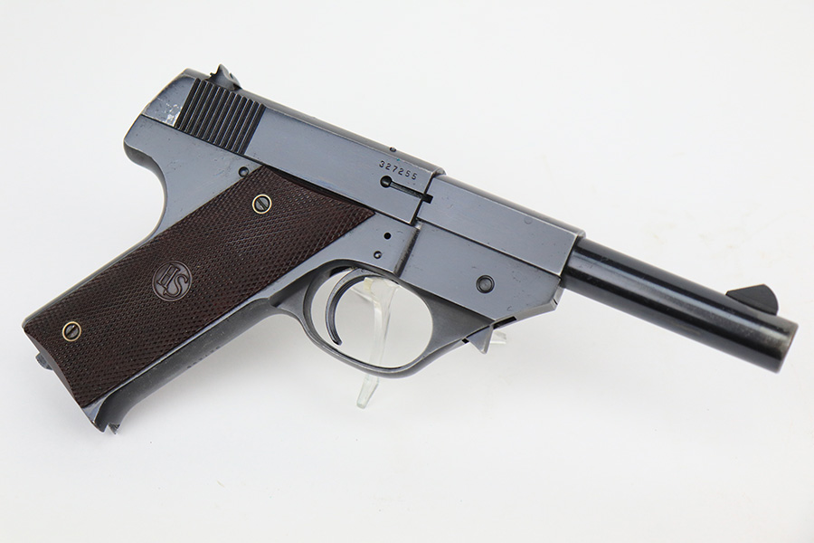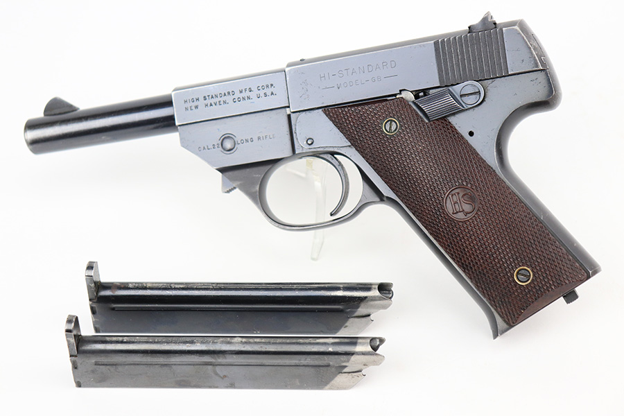 5/24/22 – This is a nice example of a Hi Standard Model GB pistol manufactured in 1949-50. The gun is all matching and has retained about 91-92% of its original finish. There is minor thinning on the grips straps, muzzle wear, minor wear along the left side of the barrel, and some light scratchy wear on the tang. Comes with minty reddish bakelite grips and two proper magazines. Mint bore.