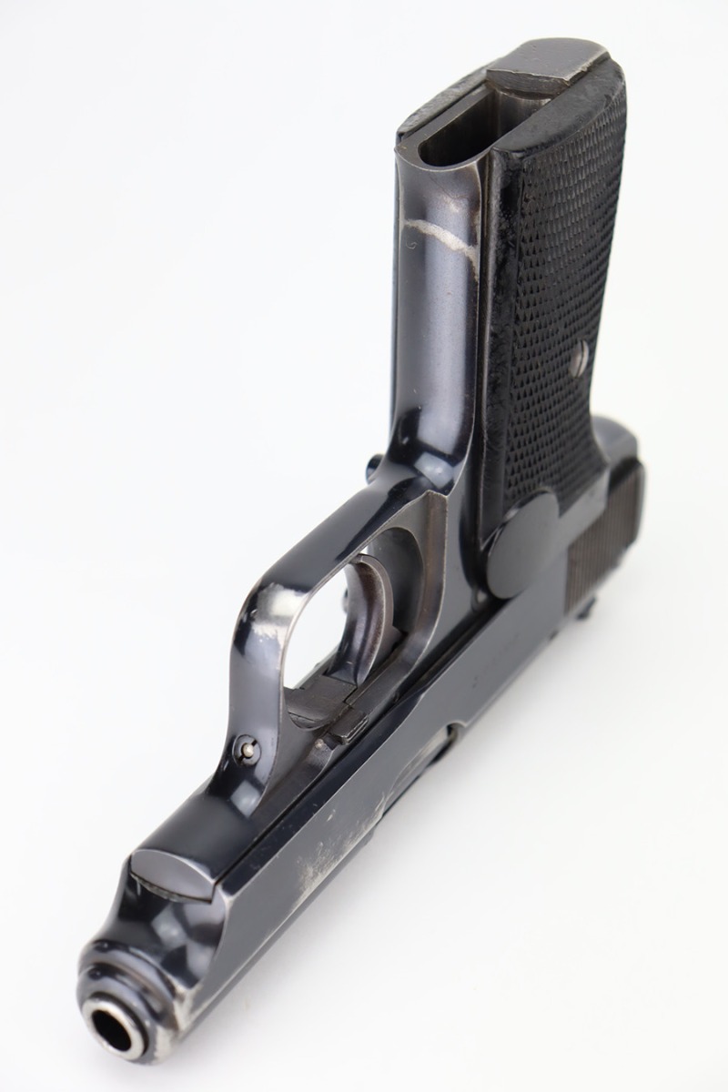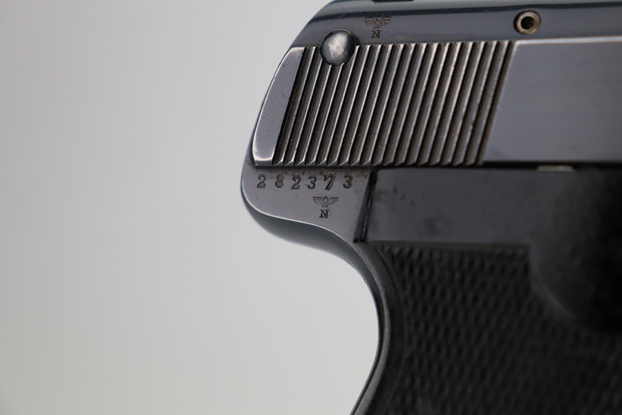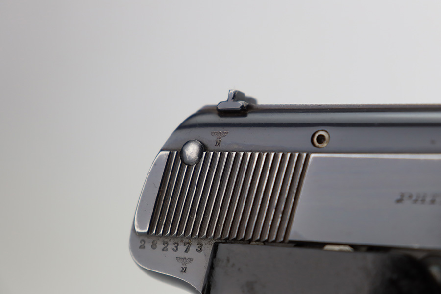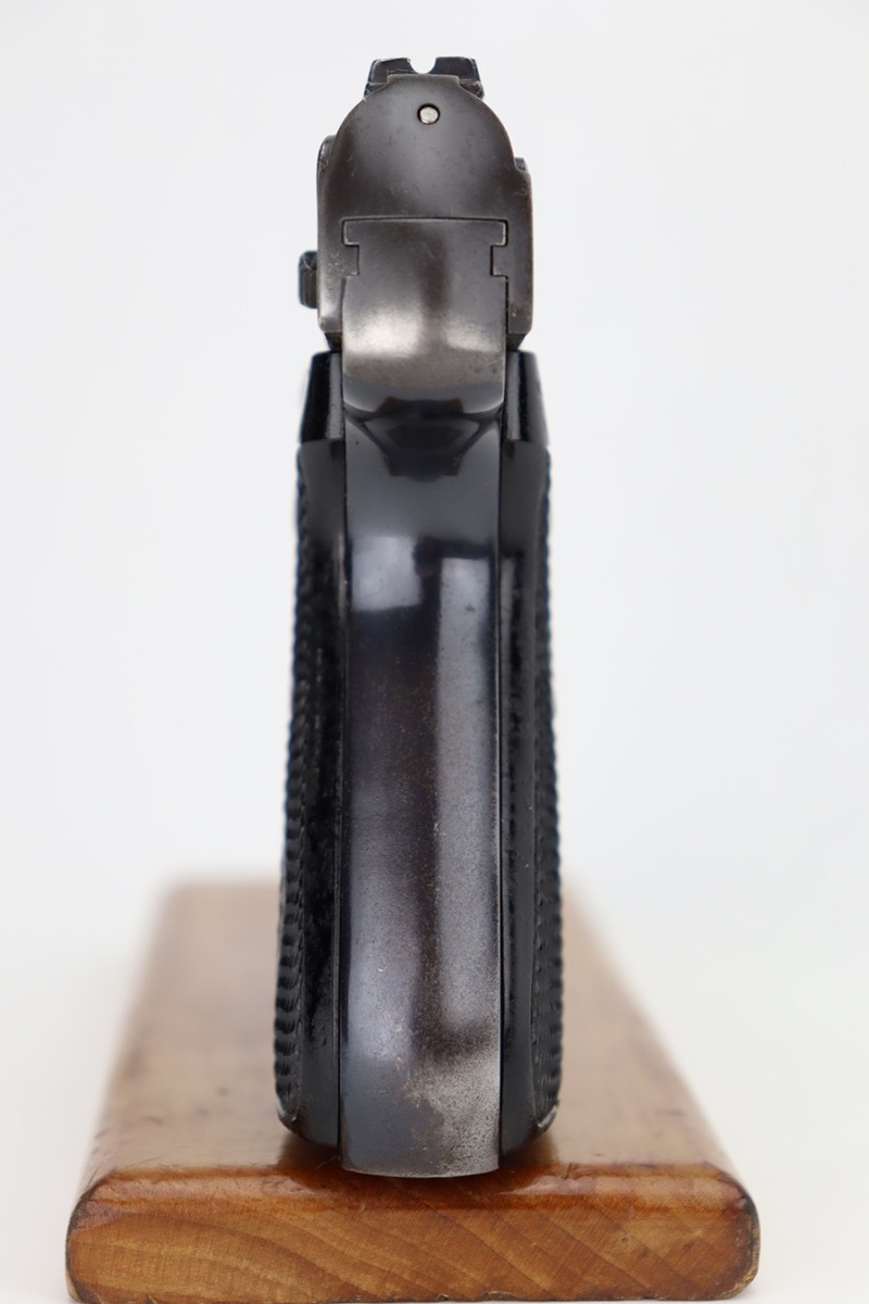 12/5/23 – This is a nice Sauer 38h issued to the German Army during WW2. All matching with a high polish finish and the proper “Eagle 37” military acceptance proof on the trigger guard. The original finish rates about 90%. There is wear around the muzzle, a couple of spots of wear on both sides of the slide, on the front strap, and on the underside of the trigger guard. There is some light pin-pricking on the back strap and some tiny pits around the muzzle and on the left side of the slide. Fitted with period-correct black bakelite grips and comes with one proper magazine. Mint bore.