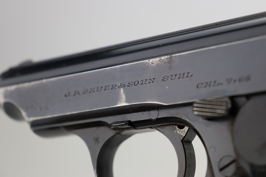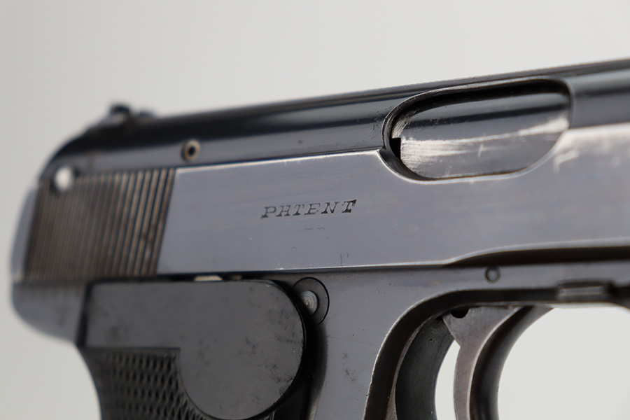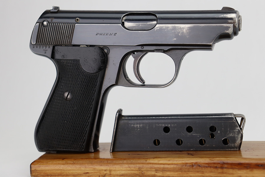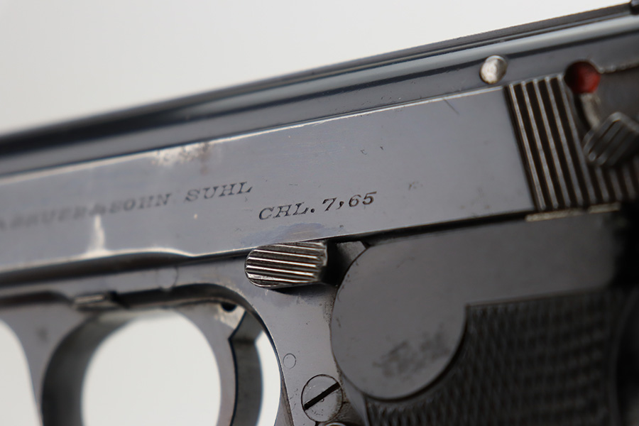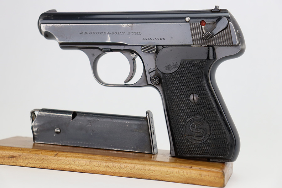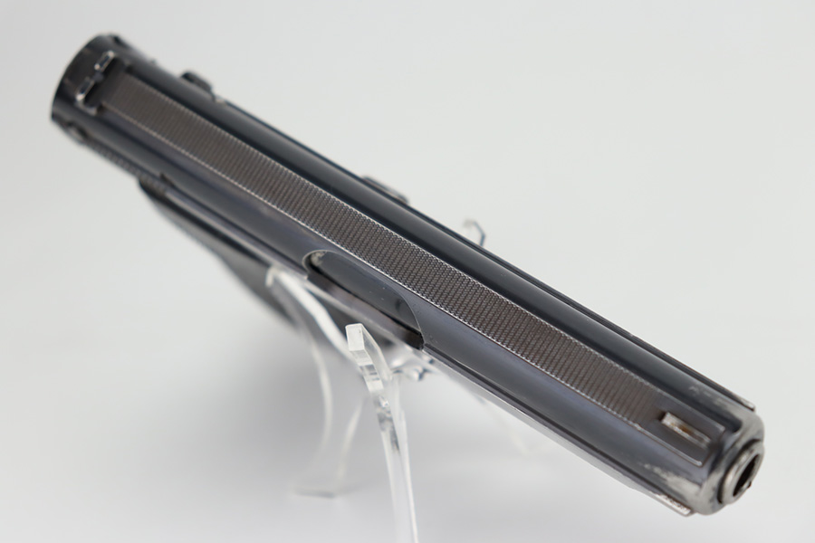 12/5/23 – This is a nice Sauer 38h issued to the German Army during WW2. All matching with a high polish finish and the proper “Eagle 37” military acceptance proof on the trigger guard. The original finish rates about 90%. There is wear around the muzzle, a couple of spots of wear on both sides of the slide, on the front strap, and on the underside of the trigger guard. There is some light pin-pricking on the back strap and some tiny pits around the muzzle and on the left side of the slide. Fitted with period-correct black bakelite grips and comes with one proper magazine. Mint bore.