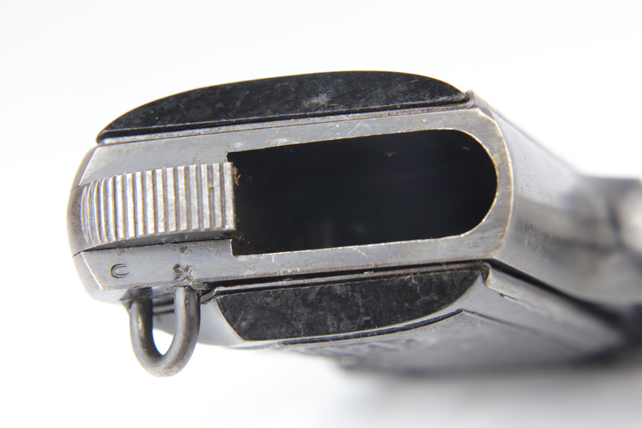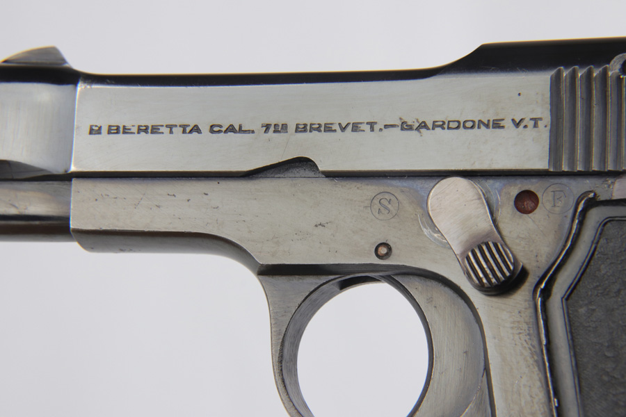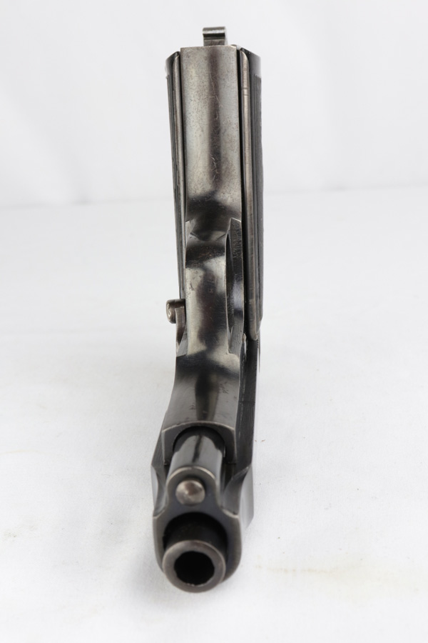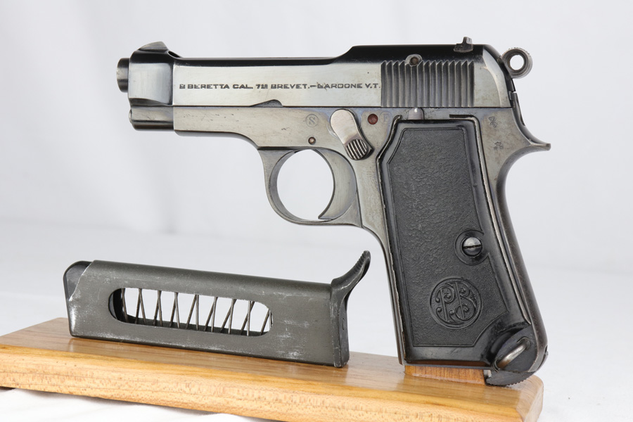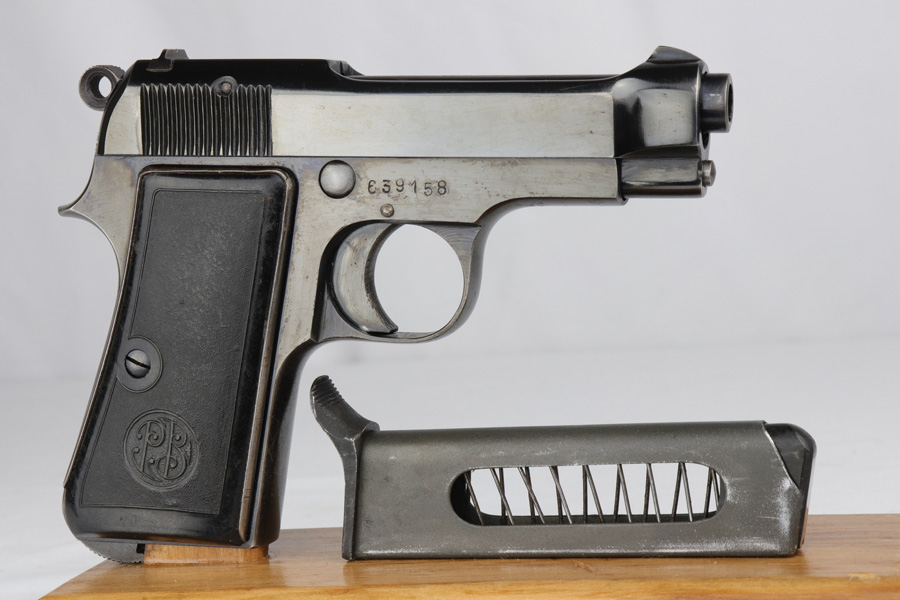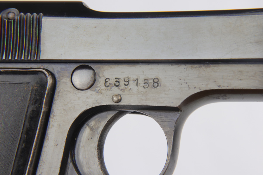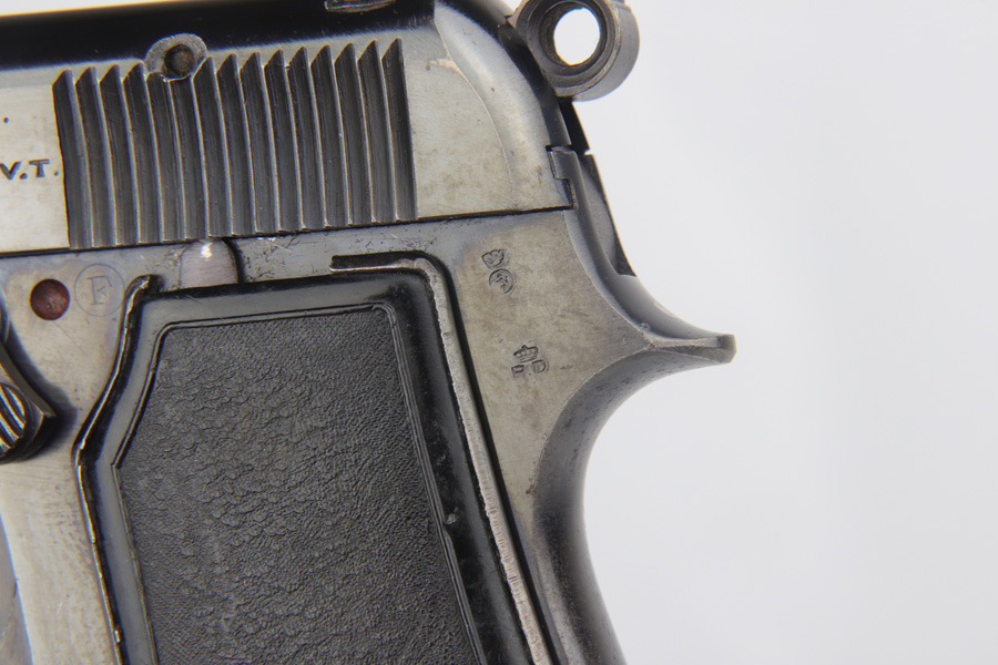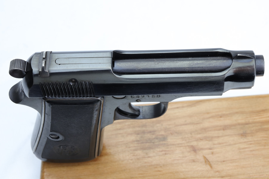 12/6/18 – This is an original high polish Italian M1935 Beretta in 7.65mm. The serial numbers this pistol was made just as WW2 was winding down. The pistol was most likely used by by Italian Police at the time. There’s a small crown “P.D.” below another Italian crown proof stamp. The pistol is in excellent condition with an excellent bore and overall finish grading of 94-96%. Almost all of the wear is on the front and back straps, which show a fair amount of normal patina. The high polish finish on the slide is excellent with only some very minor machine markings. Guaranteed original and fully functional.