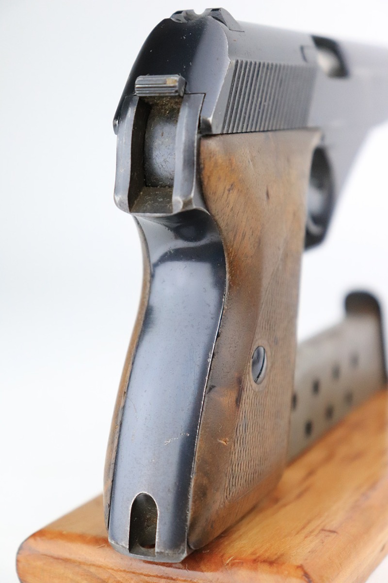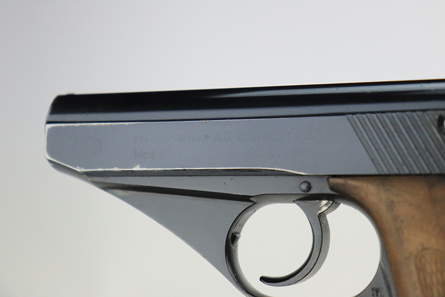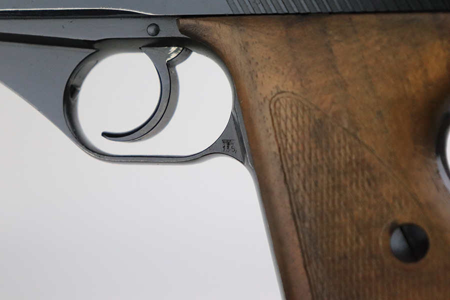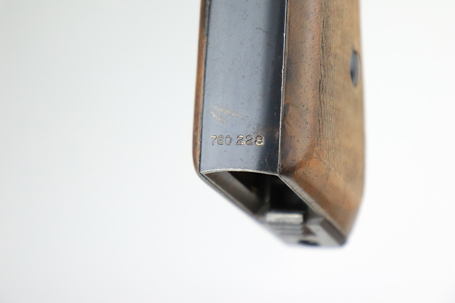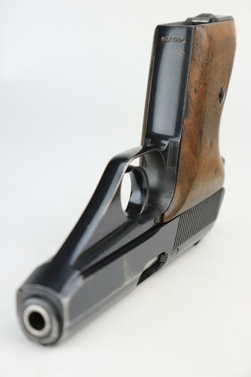 7/26/22 – This is a very nice example of an early high polish Mauser HSC issued to the Nazi military in 1942. It is all matching and has the proper early “Eagle 135” military acceptance proof. It also has the early lanyard ring on the back of the frame. It has retained about 93-94% of its original high polish finish. There is minor muzzle wear and a light streak of wear on the front strap, but most of the wear is on the right side of the slide. It comes with slightly worn wood grips and one proper magazine. The bore is excellent with strong rifling.