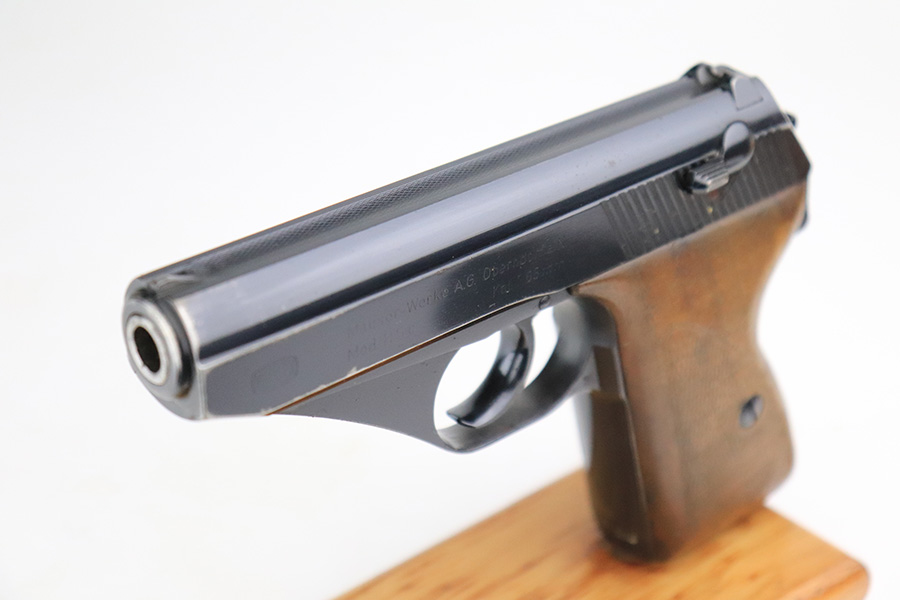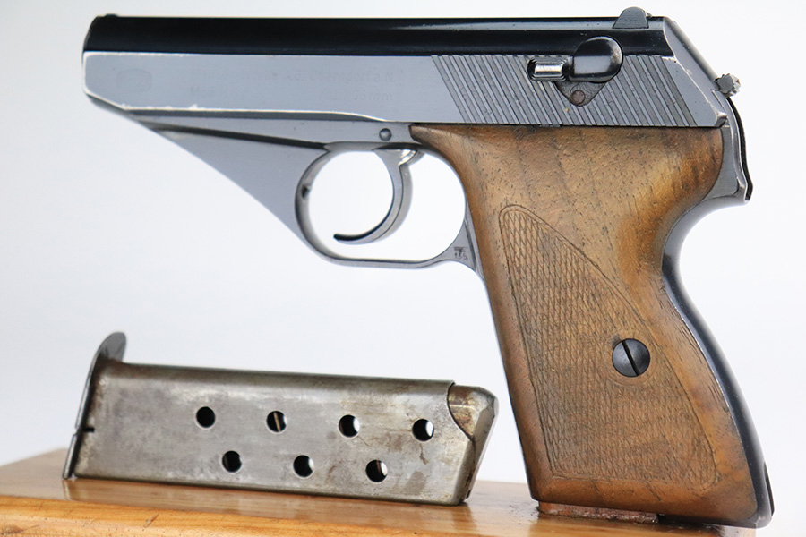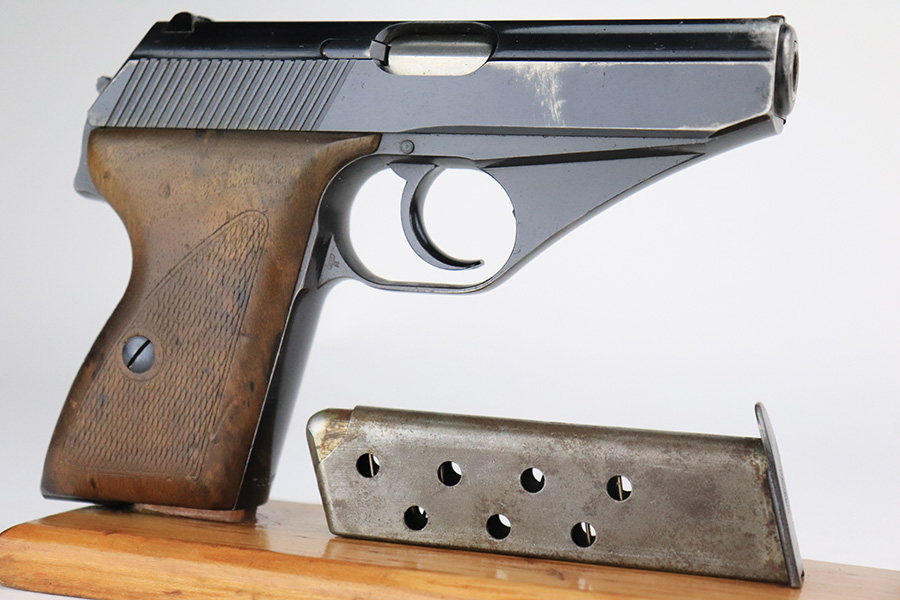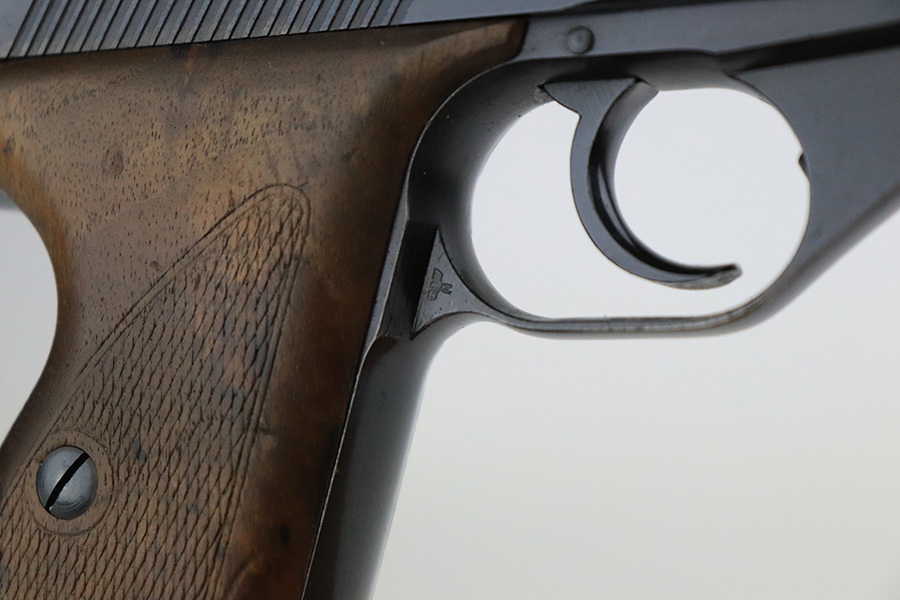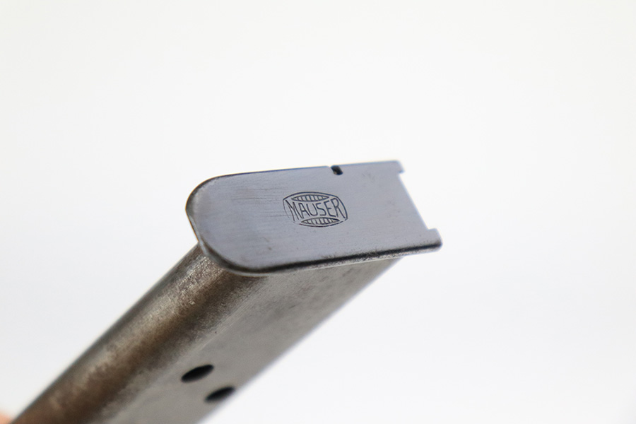7/26/22 – This is a very nice example of an early high polish Mauser HSC issued to the Nazi military in 1942. It is all matching and has the proper early “Eagle 135” military acceptance proof. It also has the early lanyard ring on the back of the frame. It has retained about 93-94% of its original high polish finish. There is minor muzzle wear and a light streak of wear on the front strap, but most of the wear is on the right side of the slide. It comes with slightly worn wood grips and one proper magazine. The bore is excellent with strong rifling.