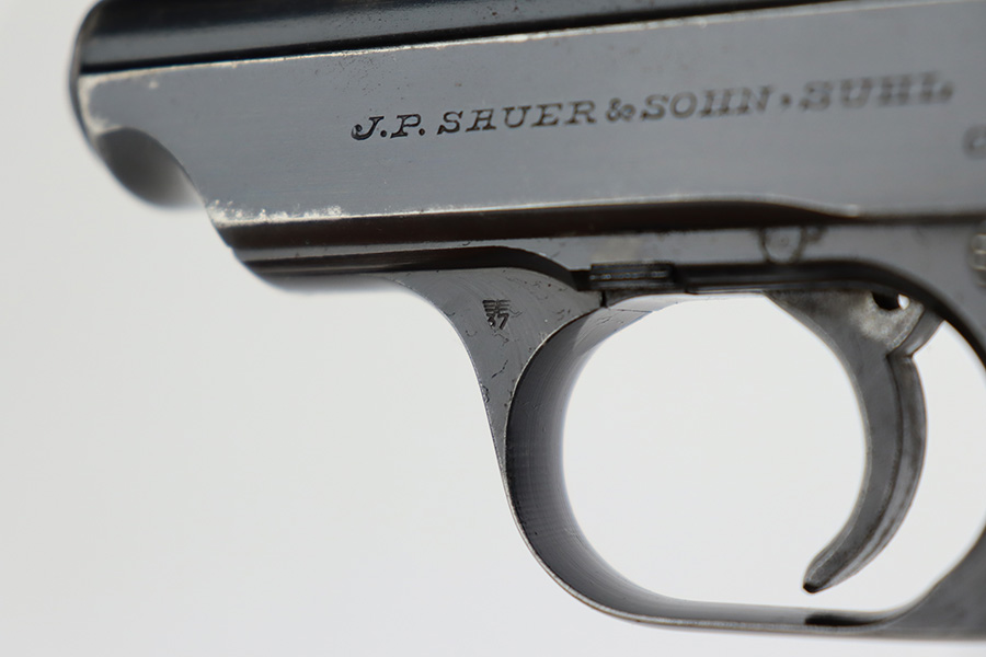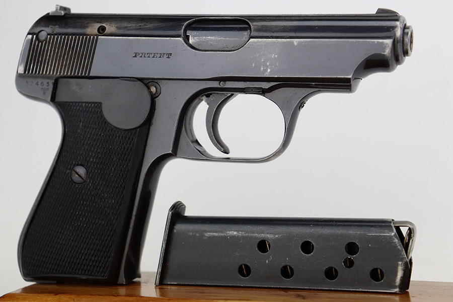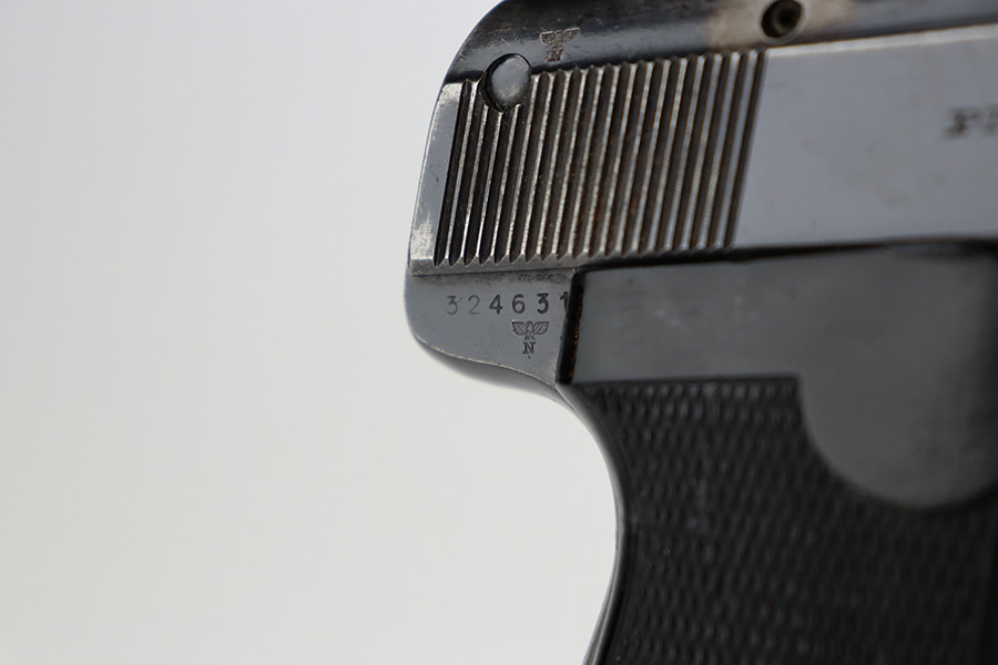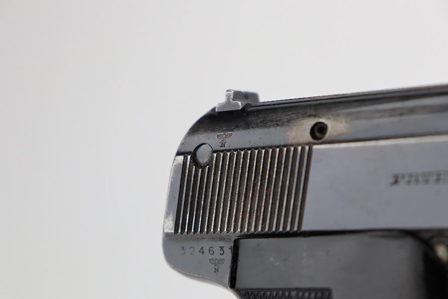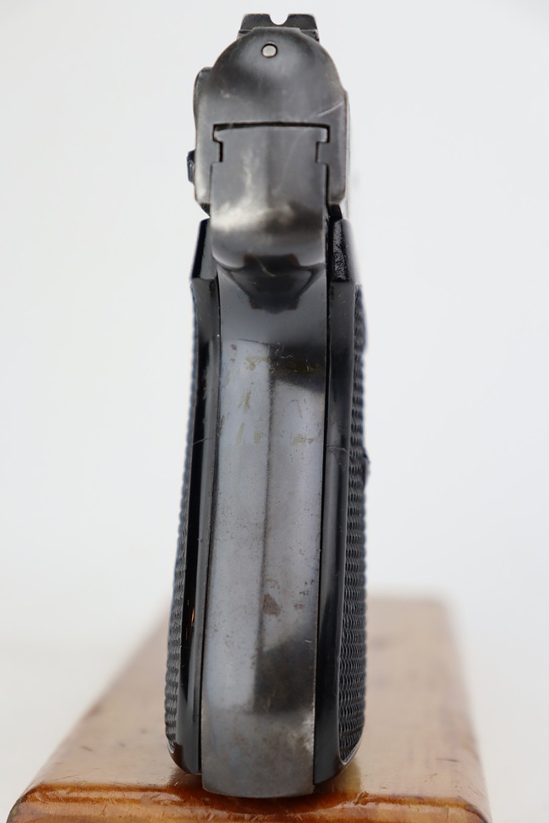 8/18/23 – This is a very nice example of an earlier Sauer 38h issued to the Nazi military during WW2. It is all matching, has an early high-polish finish and has an “Eagle 37” military acceptance proof on the left side of the trigger guard. It has retained somewhere between 85-90% of its original finish. There is minor muzzle wear and an area of wear on the trigger guard, but most of the finish loss comes in the form of spotty wear along both sides of the slide, concentrated mostly around the high edges. Some minor dulling and hints of pin-pricking on the grip straps. Fitted with very nice black bakelite grips – tiny hairline crack around the right screw hole. Mint bore.