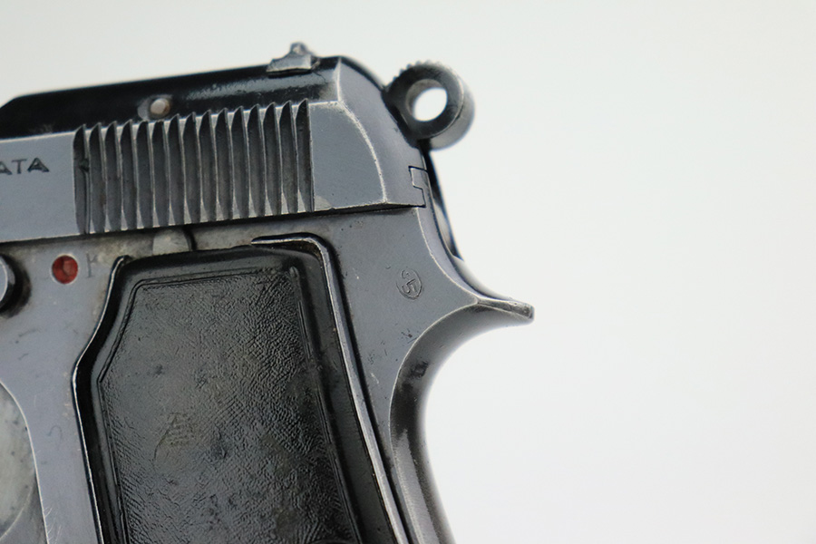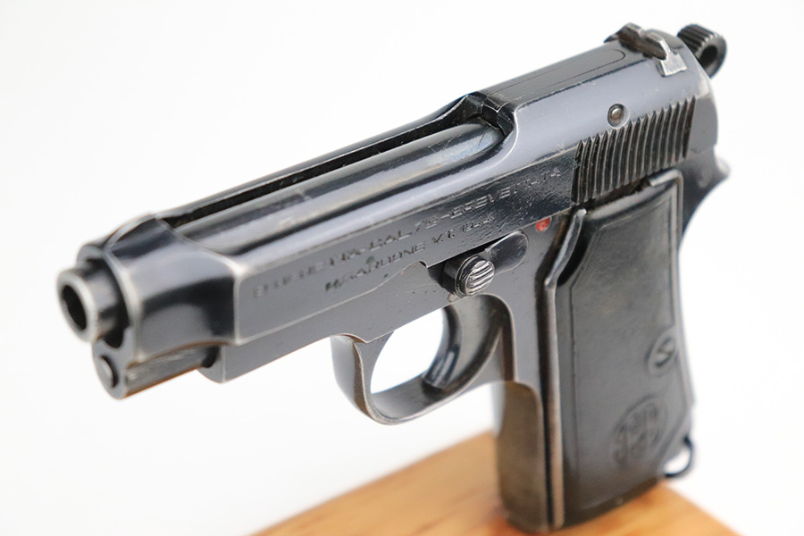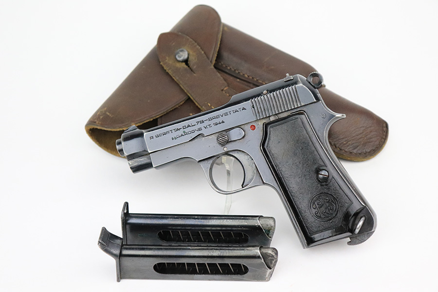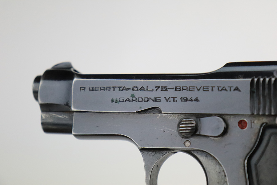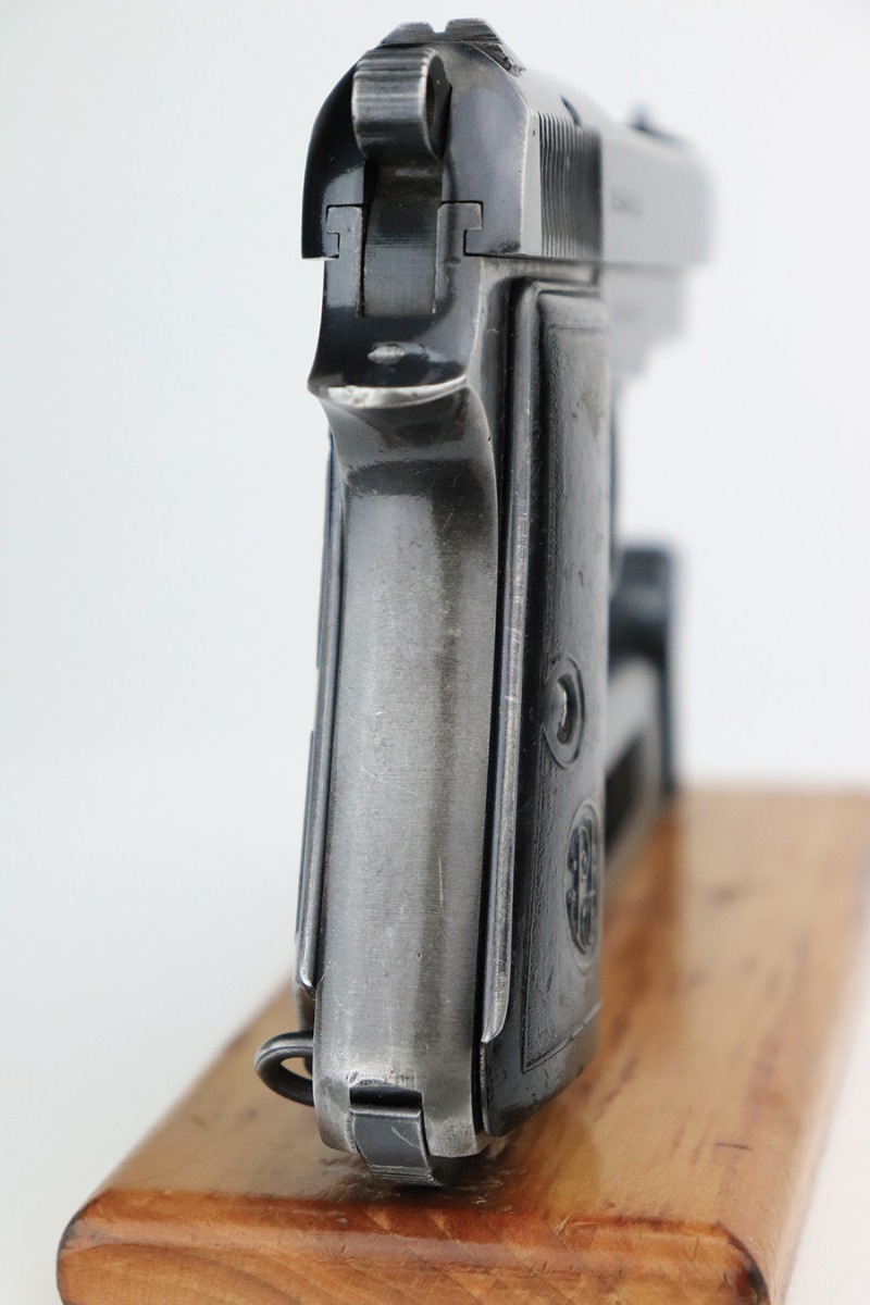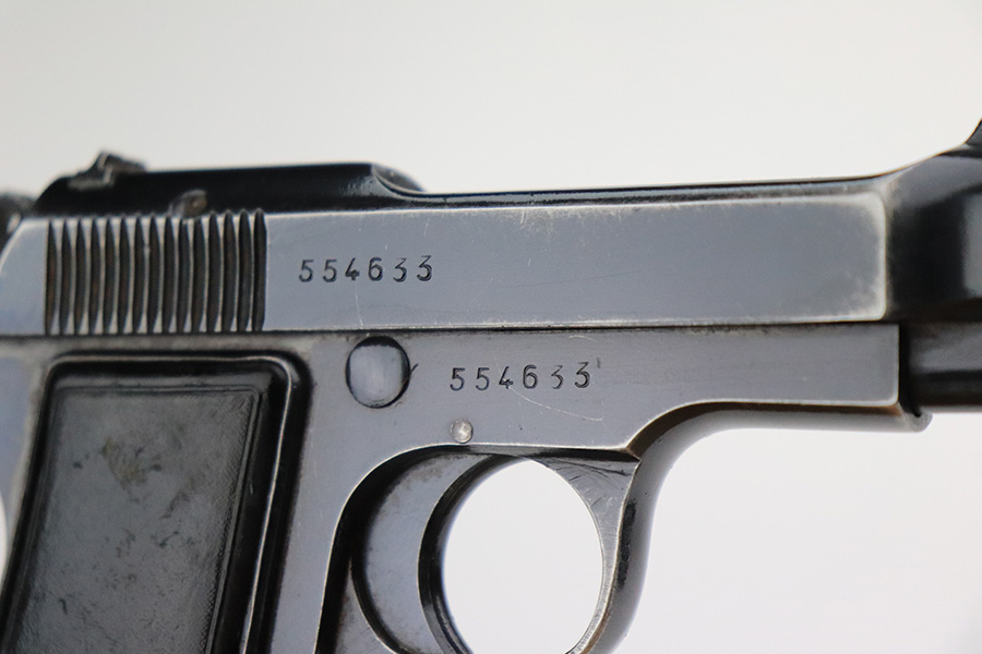7/14/22 – This is a very nice example of a high-polish Beretta Model 1935 manufactured in 1944. It is all matching and has a “4UT” marking on the left side of the tang, indicating it was issued to the Nazi military. It comes as a rig with a generic holster, one flat-bottom magazine, and one finger extension magazine. The holster has no markings, and it appears a small metal reinforcement was added to the back side of the closure knob. The gun itself has retained roughly 80% of its original high polish finish. Most of the bluing loss is on the grip straps, but there is also light wear concentrated around the muzzle and high edges of the slide. Some small dots of discoloration on the left side of the frame where it meets the slide. Comes with excellent period-correct black bakelite grips. Excellent bore with strong rifling.