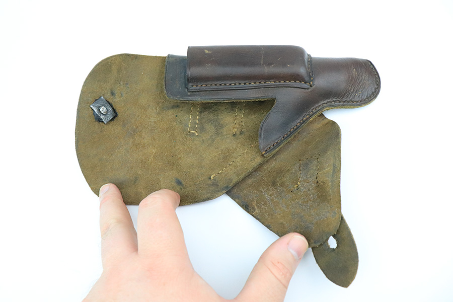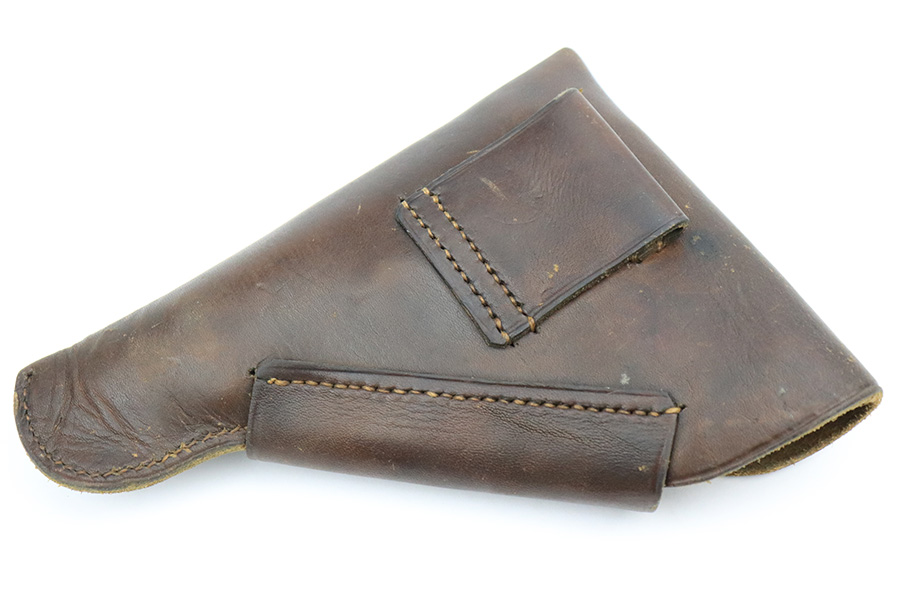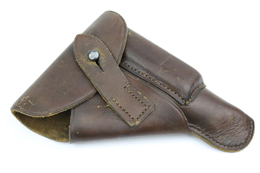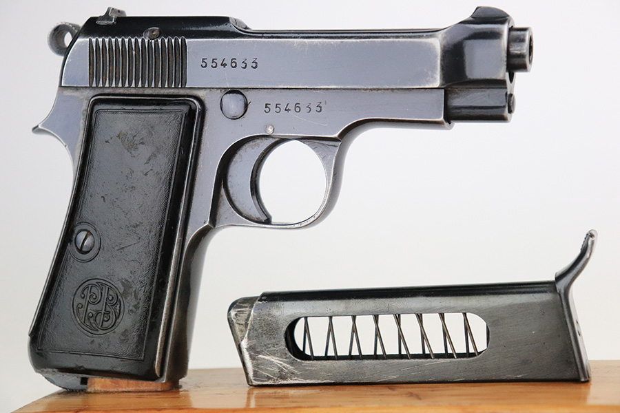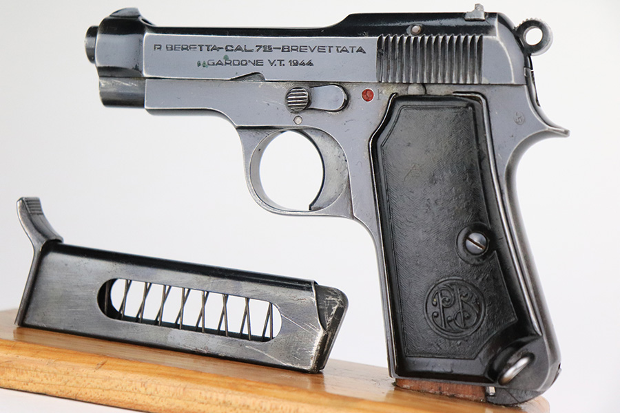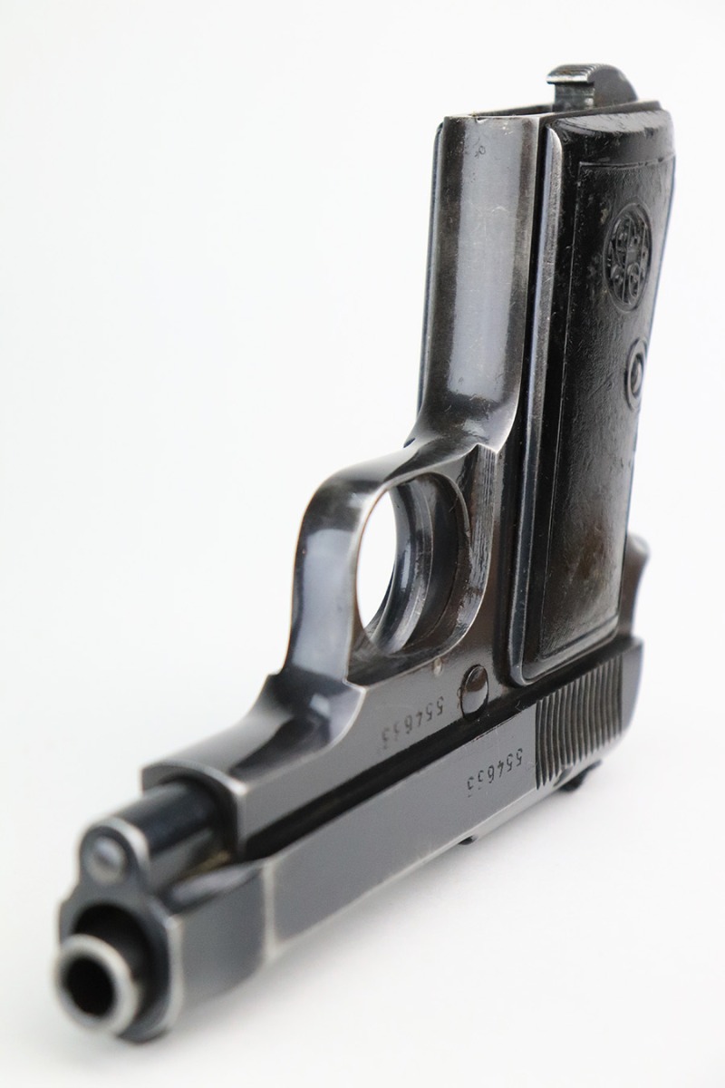 7/14/22 – This is a very nice example of a high-polish Beretta Model 1935 manufactured in 1944. It is all matching and has a “4UT” marking on the left side of the tang, indicating it was issued to the Nazi military. It comes as a rig with a generic holster, one flat-bottom magazine, and one finger extension magazine. The holster has no markings, and it appears a small metal reinforcement was added to the back side of the closure knob. The gun itself has retained roughly 80% of its original high polish finish. Most of the bluing loss is on the grip straps, but there is also light wear concentrated around the muzzle and high edges of the slide. Some small dots of discoloration on the left side of the frame where it meets the slide. Comes with excellent period-correct black bakelite grips. Excellent bore with strong rifling.