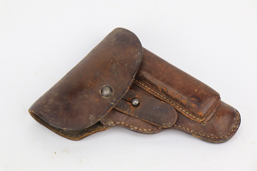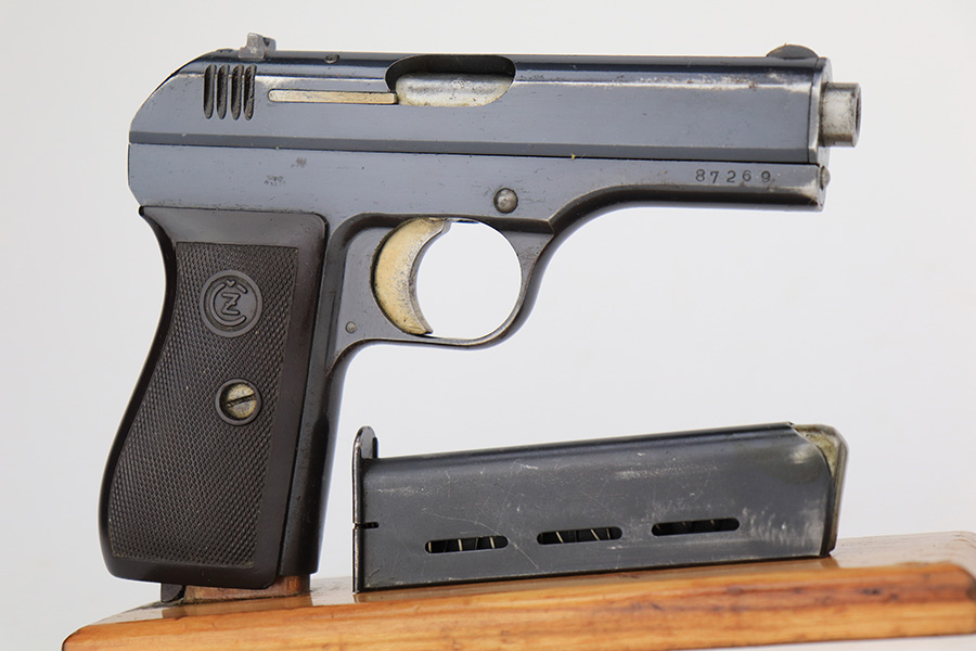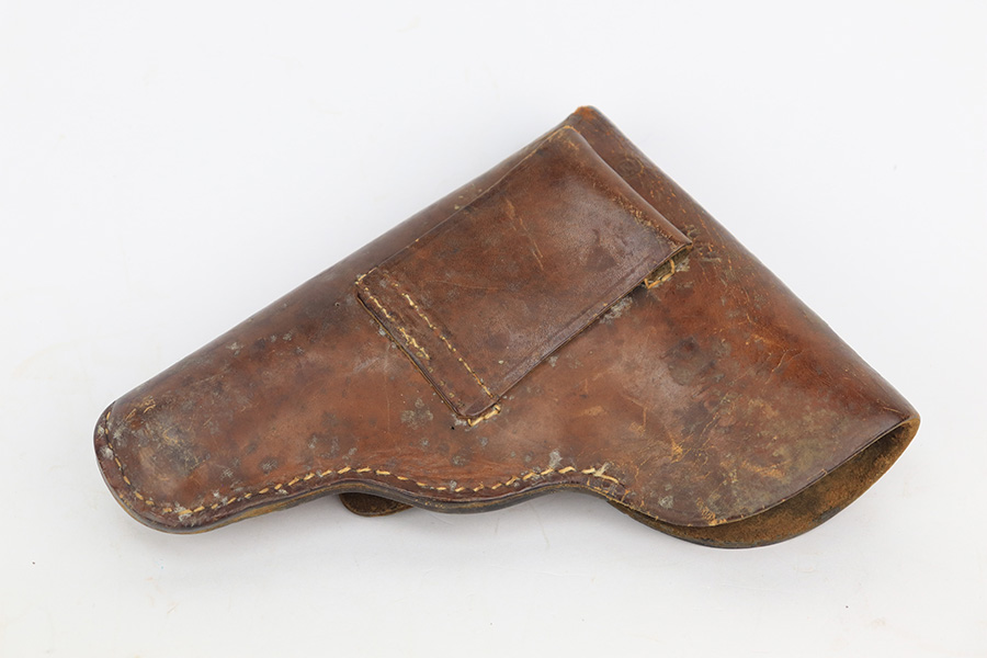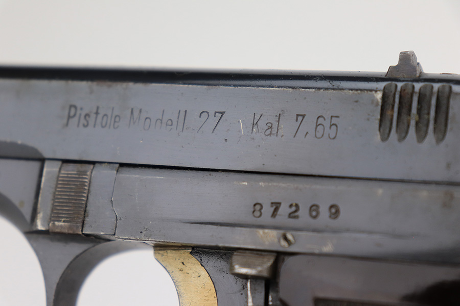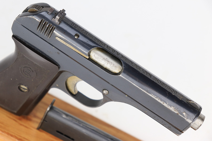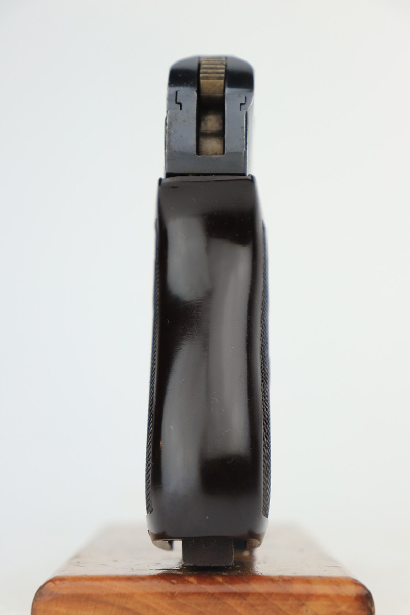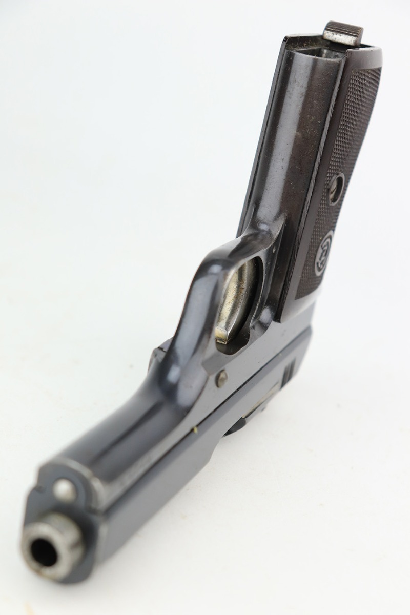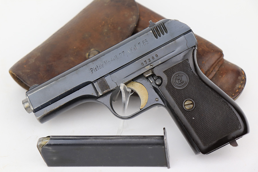 4/5/23 – This is an excellent example of a CZ 27 issued to the Nazi military during WW2. All matching with the proper “Waffen 76” military acceptance proof. Comes as a rig with a 1942-dated tan leather holster and one proper magazine. The holster leather is fairly dry with surface cracking throughout. The gun itself has retained about 96% of its original high polish finish. There is minor wear around the muzzle and on the high edges of the slide. Some freckling on the front strap and here and there along the slide. Excellent period-correct bakelite grip – no cracks or chips. Minty bore.