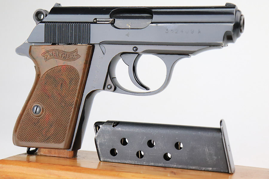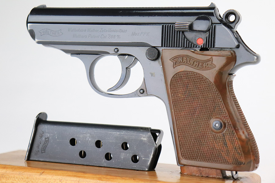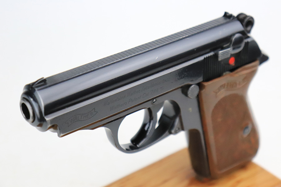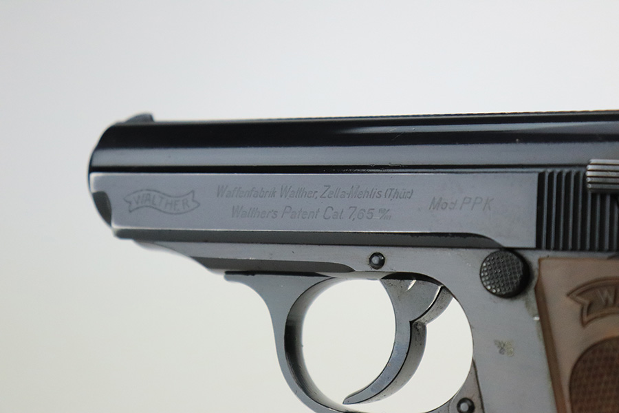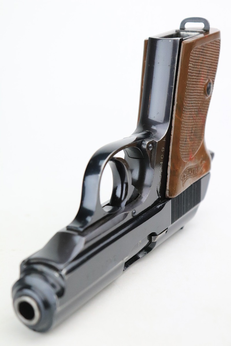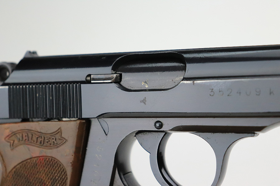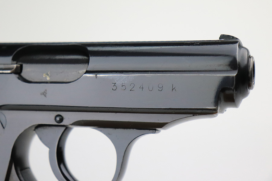 7/19/22 – This is a beautiful excellent example of a rare high-polish Walther PPK issued to the Nazi police force in 1941-42. It is all matching and has an “Eagle C” police proof on the left side of the frame. The gun itself has retained nearly all of its original high polish finish. There is just a hint of muzzle wear and hints of wear on some of the high edges. A few very light handling marks on the front strap. Comes with an excellent chocolately-brown Walther grip and a period-correct wartime magazine. Mint bore.
