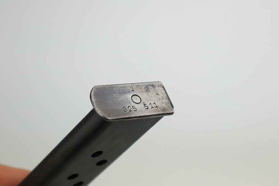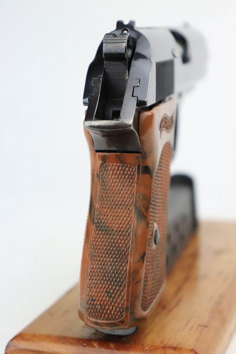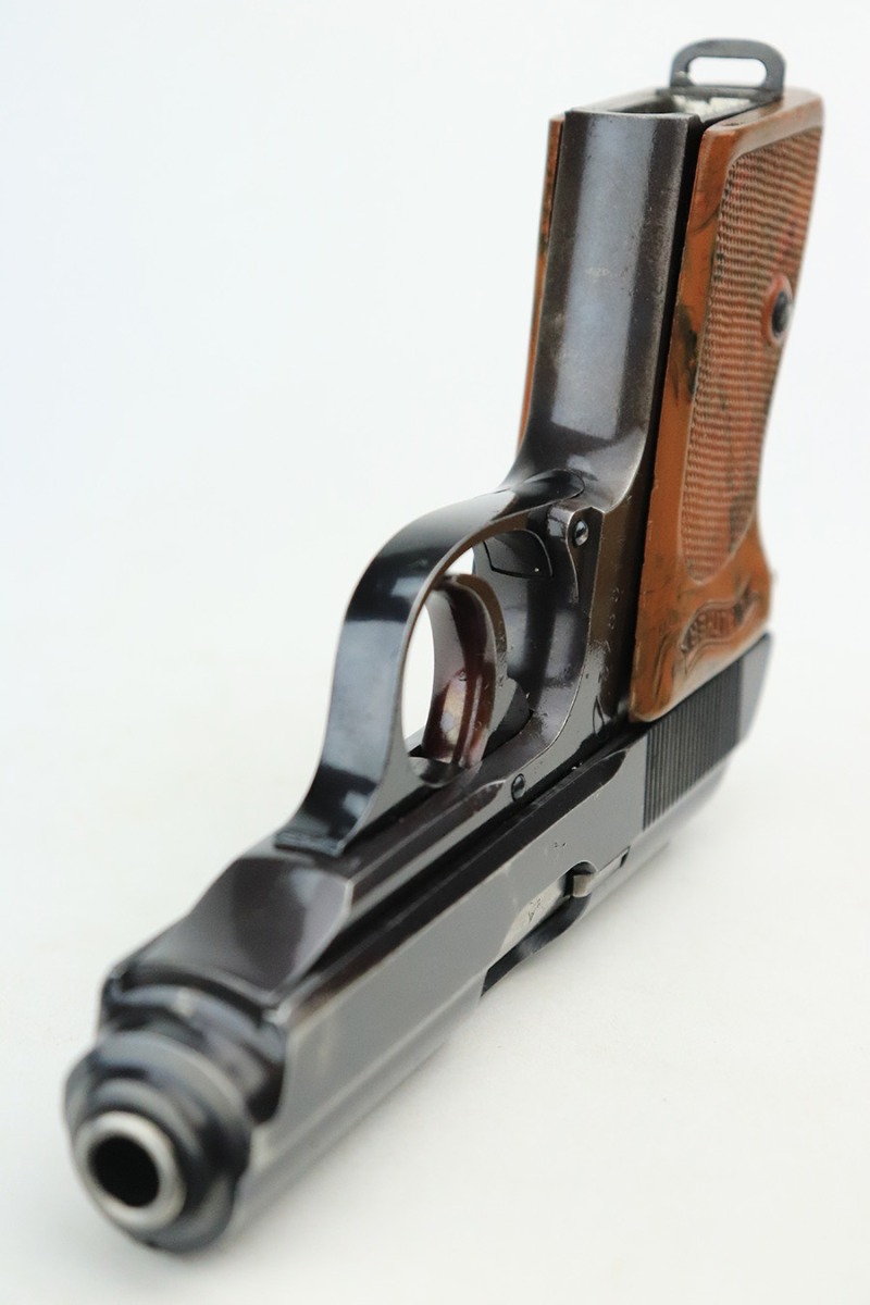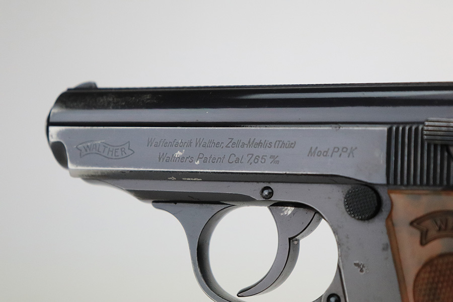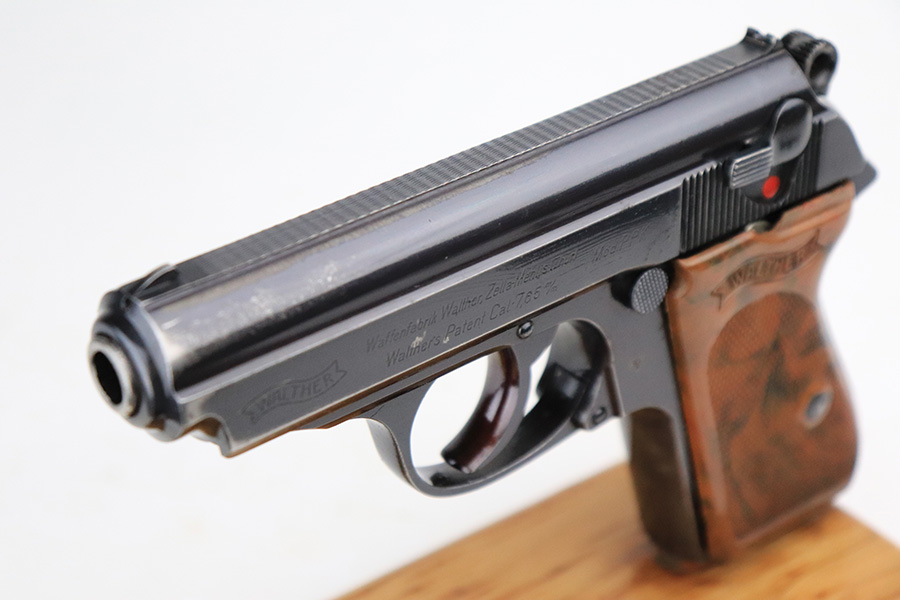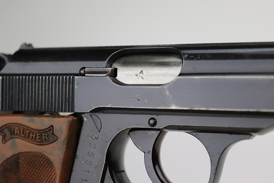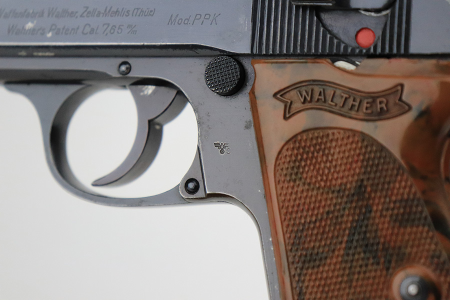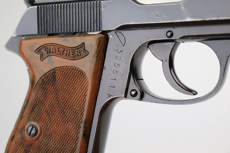 7/19/22 – This is a very nice excellent example of a rare high-polish Walther PPK issued to the Nazi police force in 1941. It is all matching and has an “Eagle C” police proof on the left side of the frame. The gun itself has retained about 92-93% of its original high polish finish. There is wear around the muzzle and light spotty wear along both sides of the slide. Minor thinning and pin-pricking on the front strap. Comes with a very nice brown Walther grip – small chip on the left side. It also comes with one matching police arsenal-numbered magazine. Mint bore.