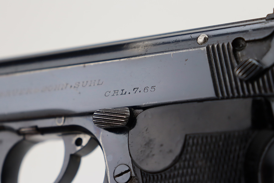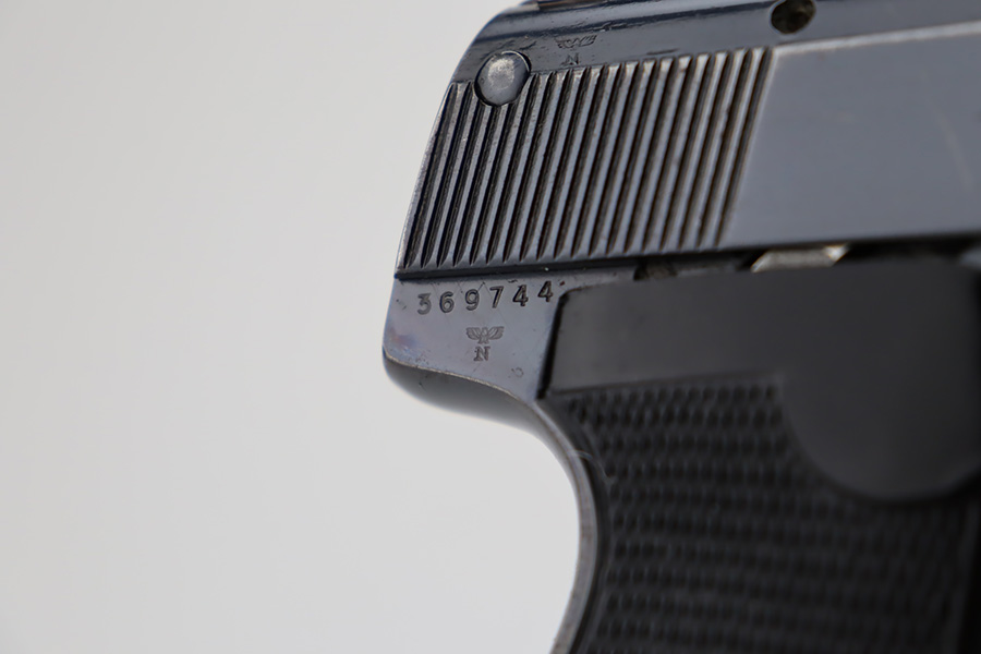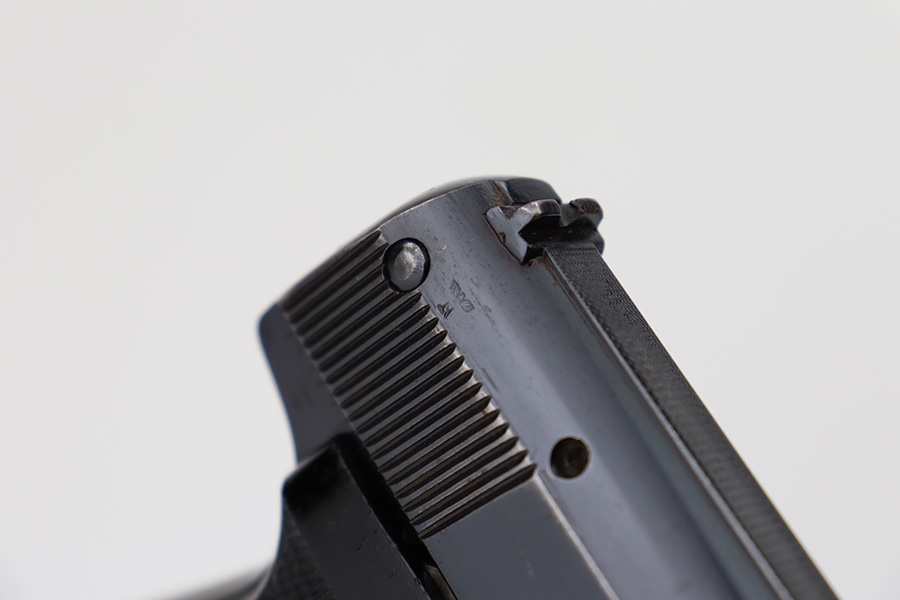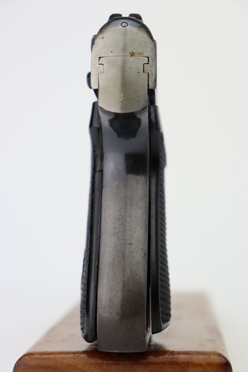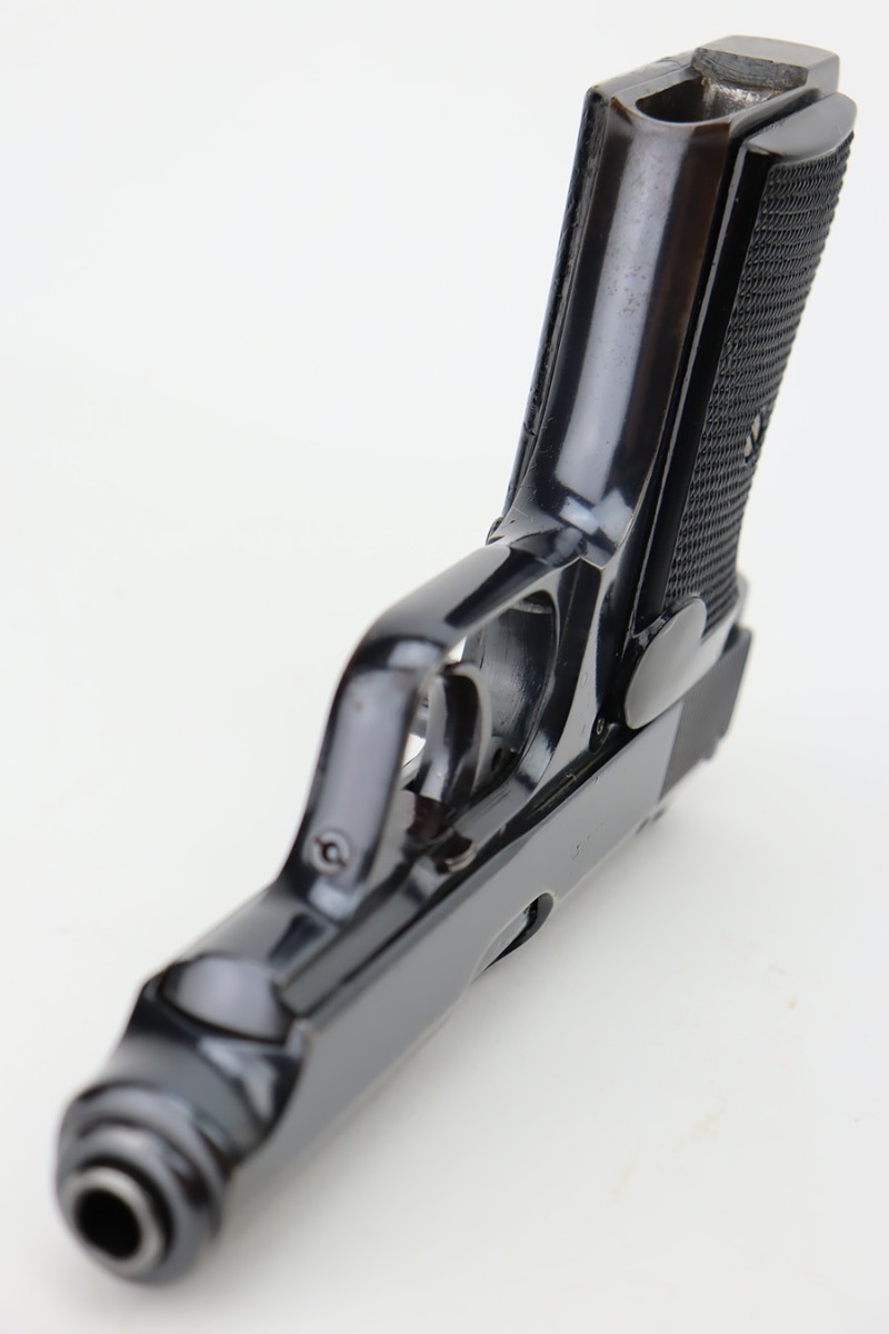 10/11/23 – This is an early, high polish Sauer 38h issued to the Nazi military during WW2. All matching with the proper “Eagle 37” military acceptance proof. The bluing rates roughly 80% with the majority of wear on the back strap and on the tang. There is also general minor high edge wear, some pin-pricking around the muzzle, and a scratch on the left side of the slide. Fitted with period-correct black bakelite grips – crack on the left side. Comes with a reproduction magazine. Mint bore. The gun seems to be fully functional, but there is a small circular part missing from the right side of the frame.