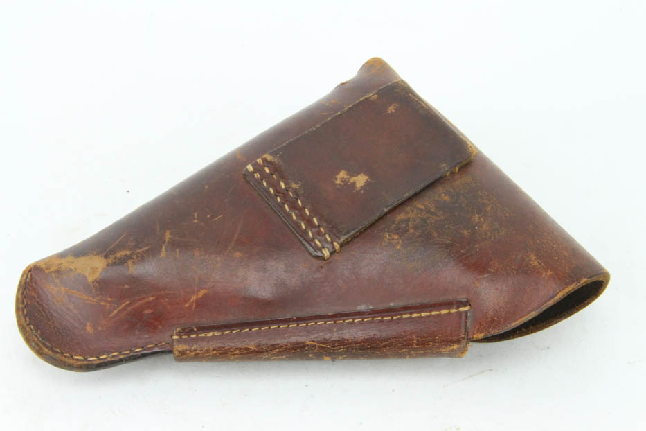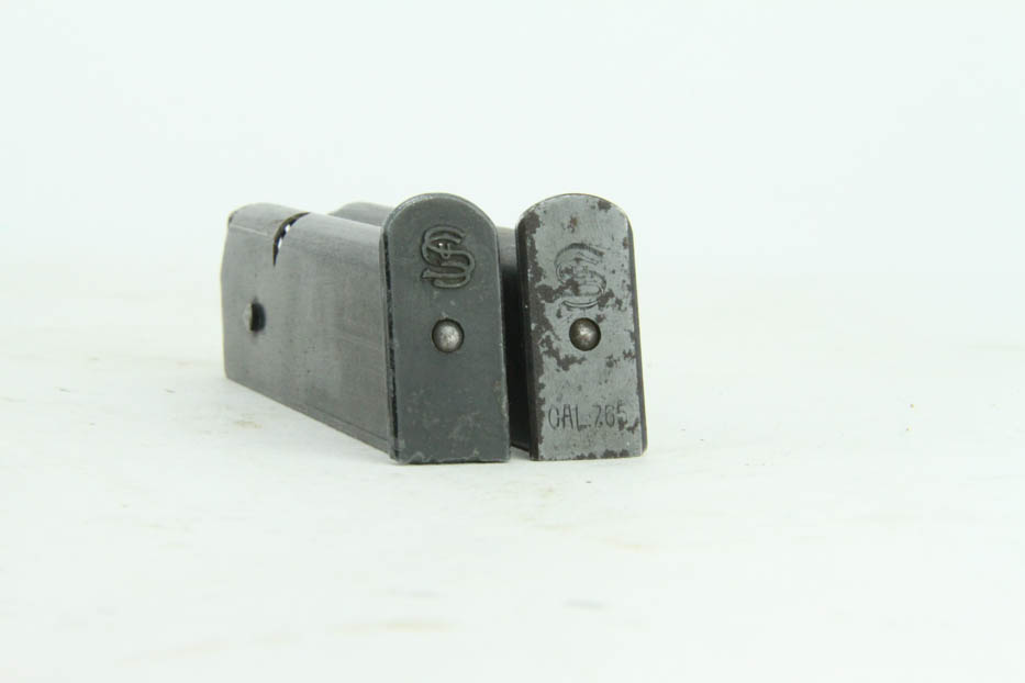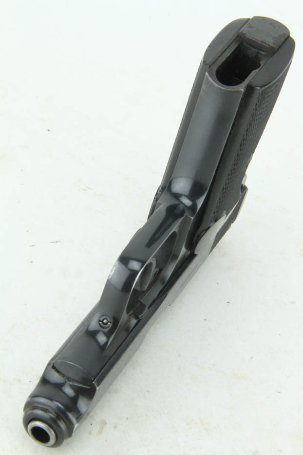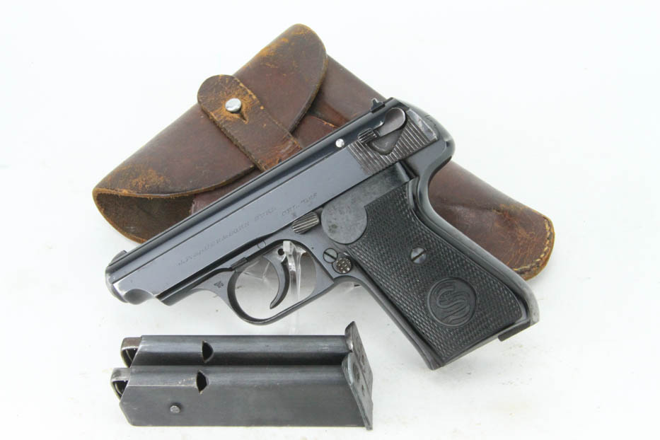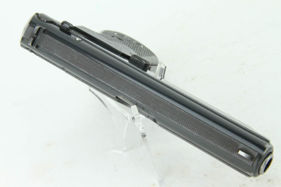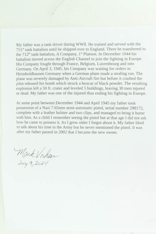 7/29/24 – This is an excellent example of a Sauer 38h issued to the Nazi police force during WW2. All matching with the proper police “Eagle C” marking on the left side of the trigger guard. This is an early variation with a high polish finish and a checkered magazine release. Its original finish rates about 96-97% with just minor muzzle and high edge wear and some spotty oxidation on the back strap. Fitted with period-correct black bakelite grips. Mint bore. It comes as a rig with two period-correct magazines and a generic tan leather holster. We acquired this rig directly from the son of the man who captured it at the end of WW2. He wrote and signed a letter detailing his fathers’ military service during WW2, how he was injured in battle, and how he came to own this piece of history.