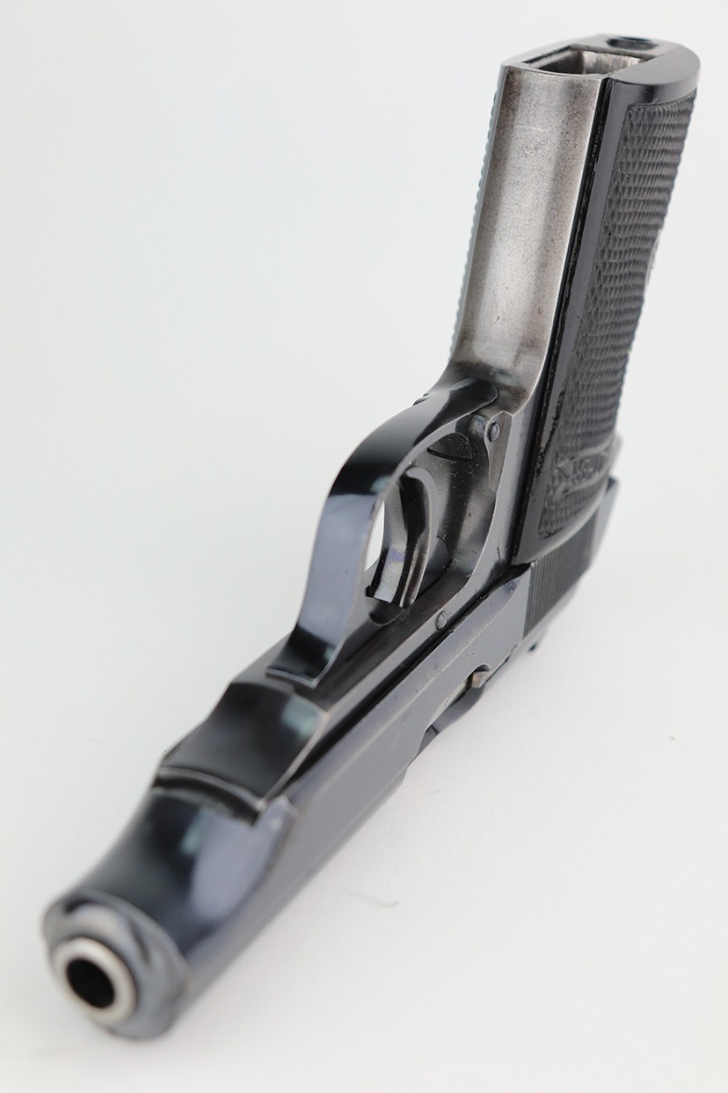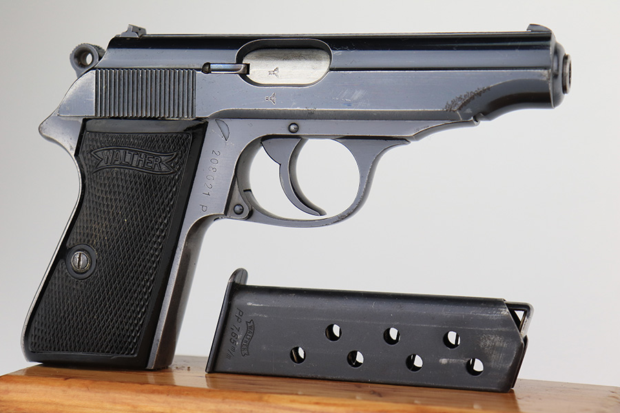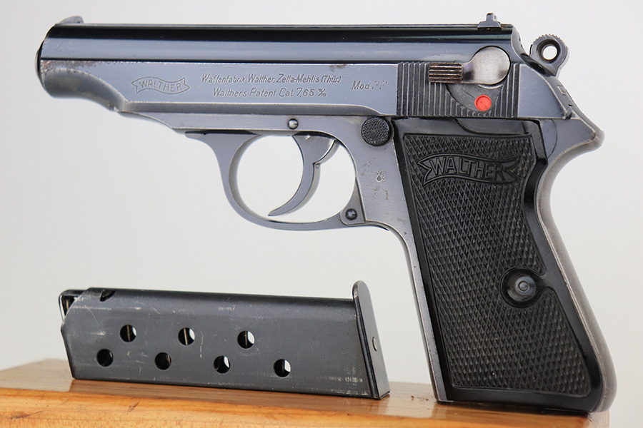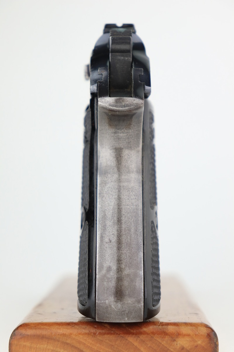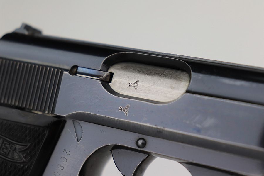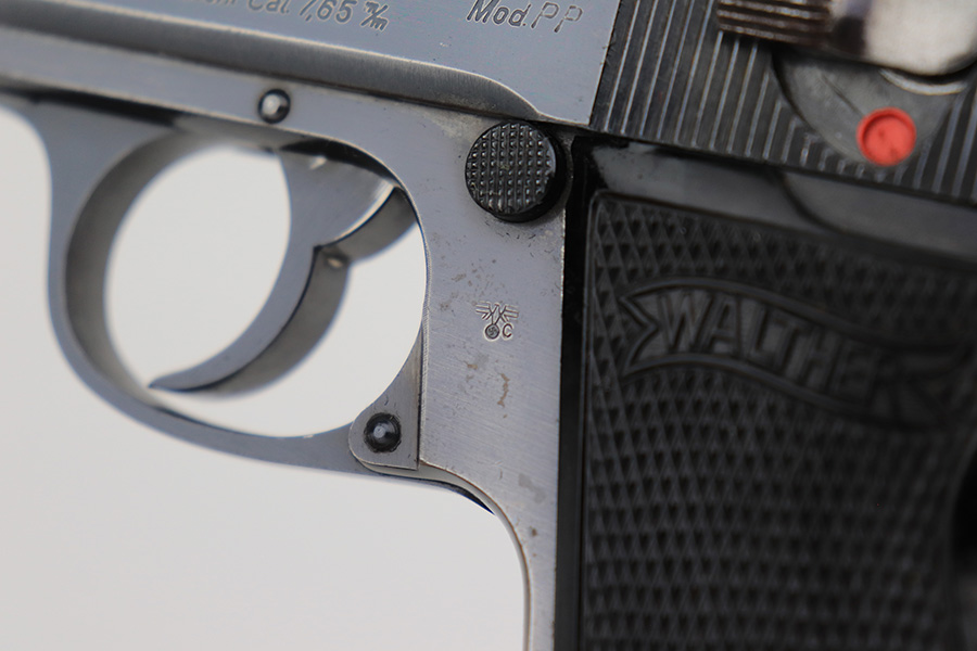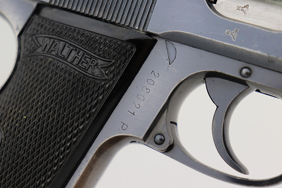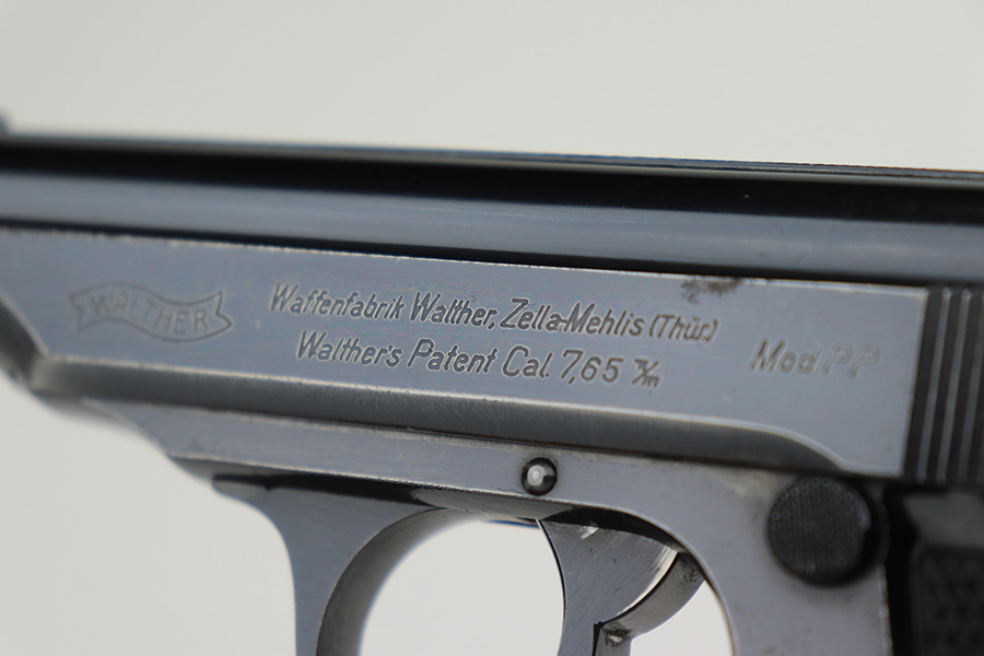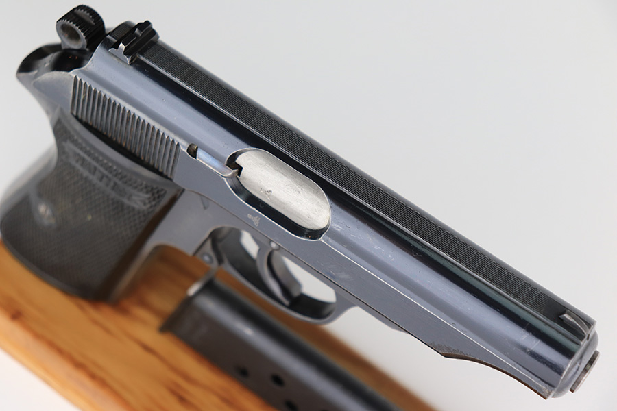 3/16/23 – This is a nice example of a rare Walther PP issued to the Nazi police force in 1940. This one is all matching and has a police “Eagle C” marking on the left side of the frame. Only about 2,000 of this variation were made, as opposed to the more common “Eagle F” variant (about 5,000 made). It has retained roughly 80% of its original finish. The majority of the bluing loss is on the grip straps, so the profile views are actually pretty nice. There is some light oxidation on both sides of the slide around the muzzle. Excellent period-correct black bakelite grips. Comes with a wartime magazine. Mint bore.