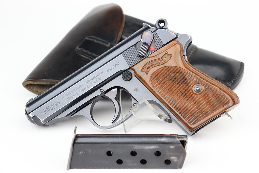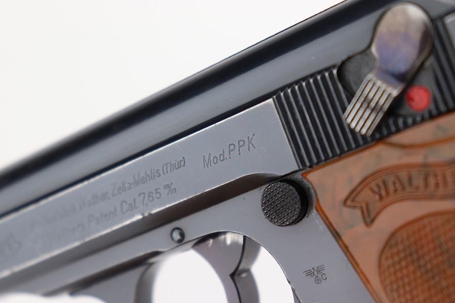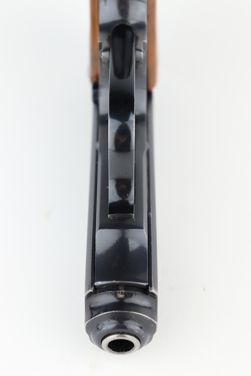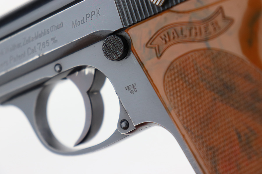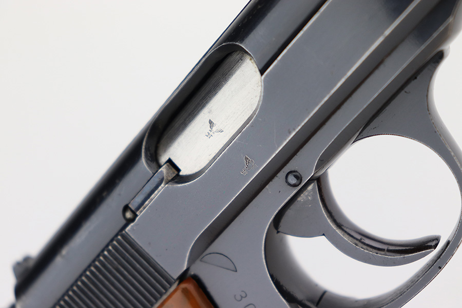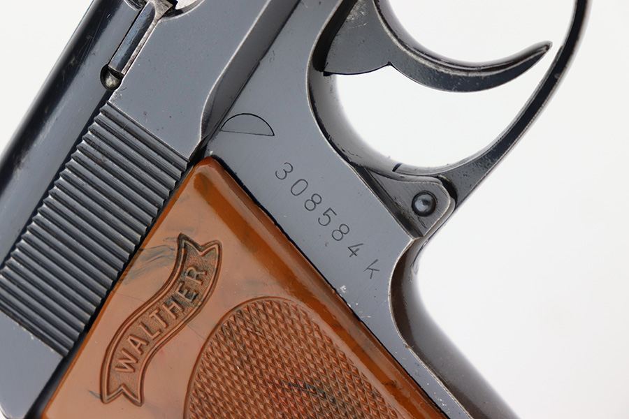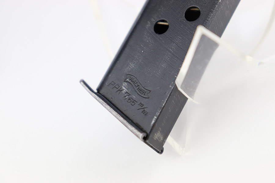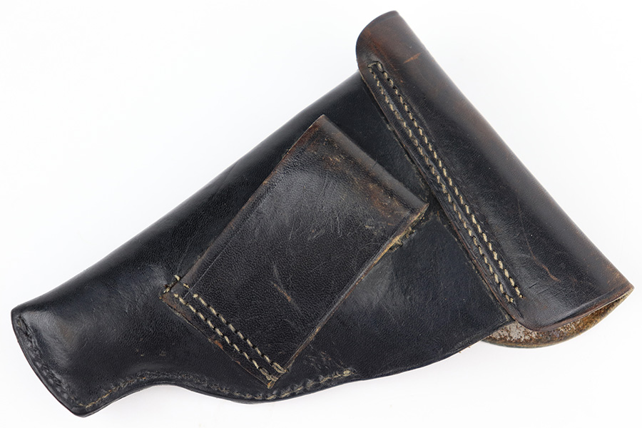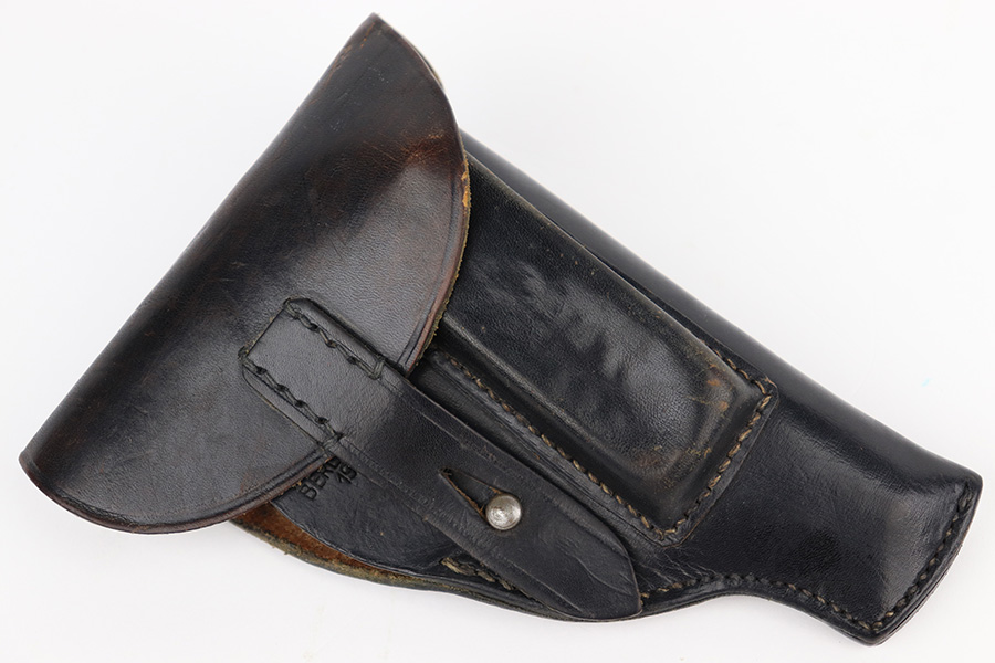 1/30/23 – This is an excellent example of a high polish Walther PPK issued to the Nazi police force in 1941. It is all matching and has a police “Eagle C” marking on the left side of the trigger guard. It comes as a rig with an excellent 1940-dated black leather police holster and one proper wartime magazine. The gun has retained about 96% of its original high polish finish. There is minor muzzle wear, some very minor thinning on the front strap, and some very light spotty wear along the round edges of the slide. Fitted with an excellent brown bakelite grip – no cracks or chips. Mint bore.