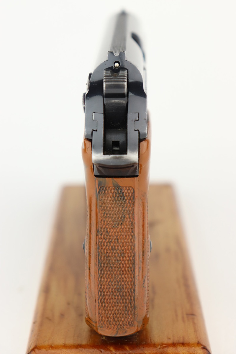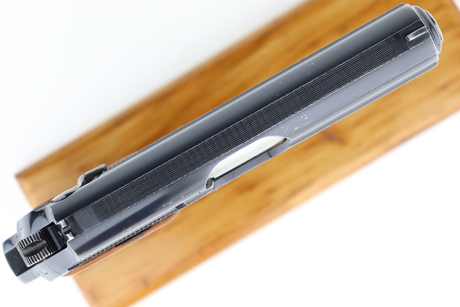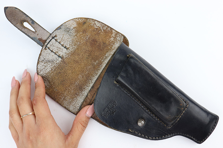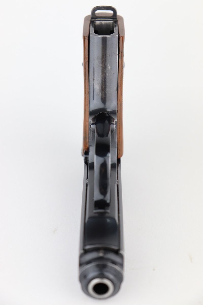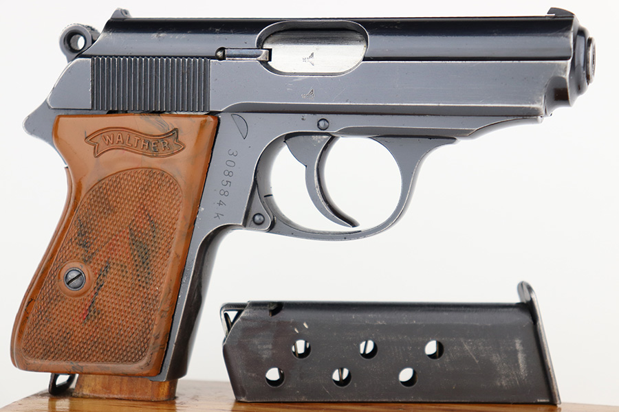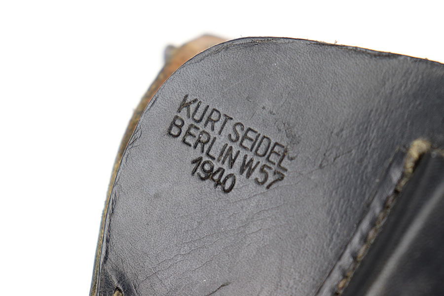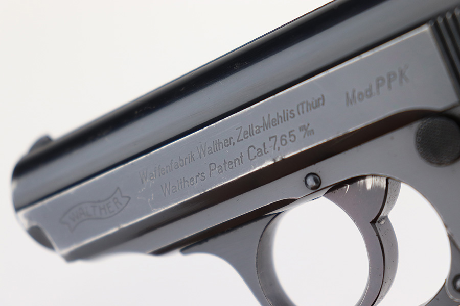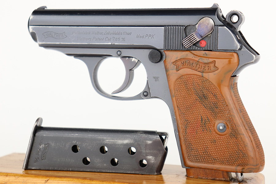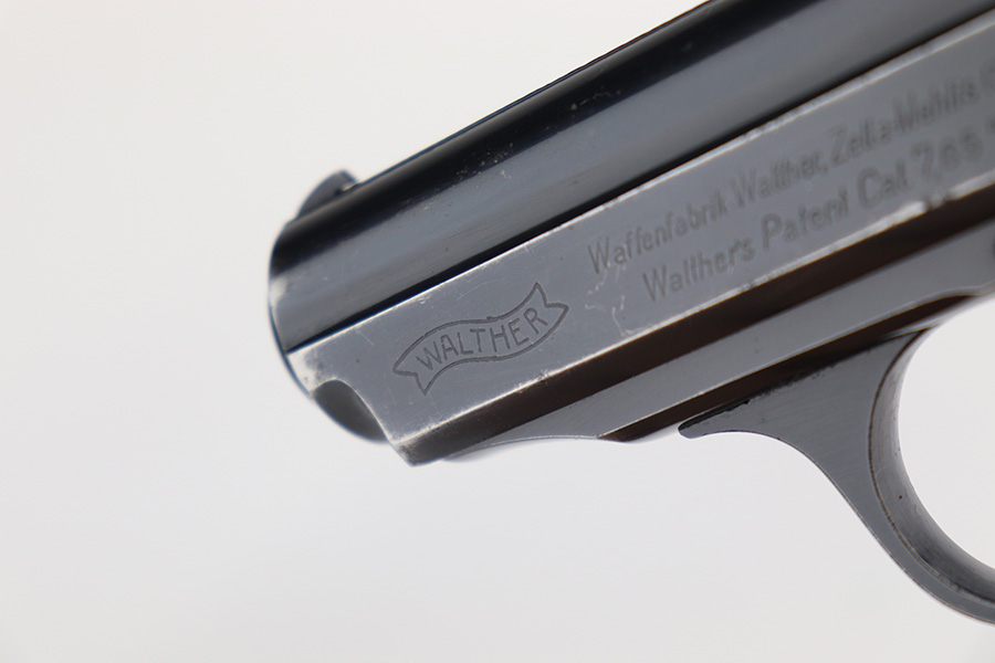 1/30/23 – This is an excellent example of a high polish Walther PPK issued to the Nazi police force in 1941. It is all matching and has a police “Eagle C” marking on the left side of the trigger guard. It comes as a rig with an excellent 1940-dated black leather police holster and one proper wartime magazine. The gun has retained about 96% of its original high polish finish. There is minor muzzle wear, some very minor thinning on the front strap, and some very light spotty wear along the round edges of the slide. Fitted with an excellent brown bakelite grip – no cracks or chips. Mint bore.