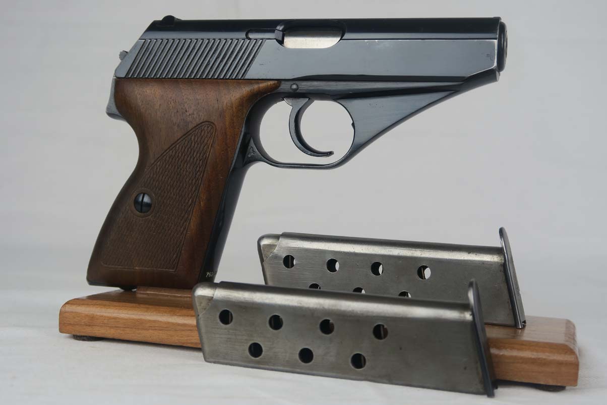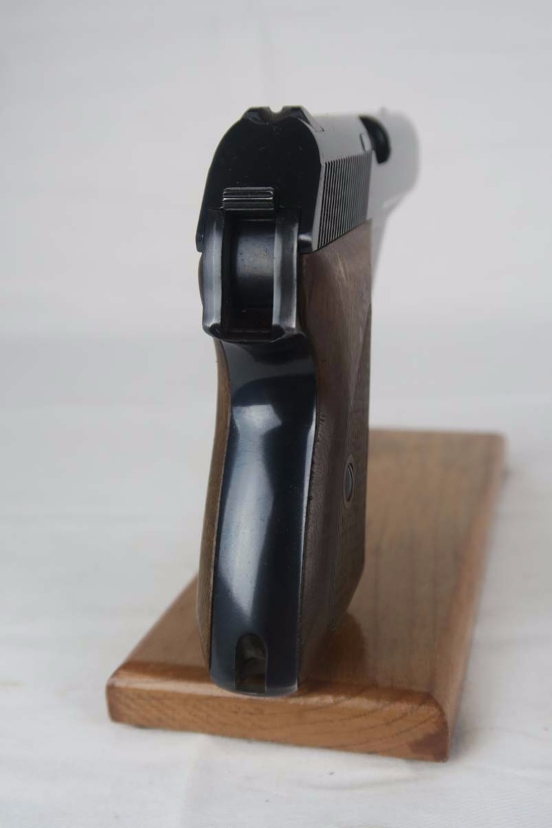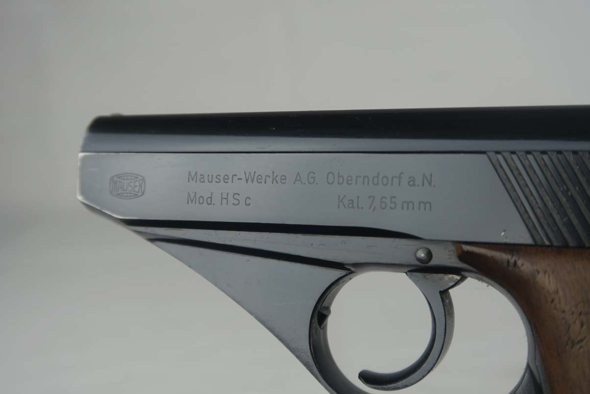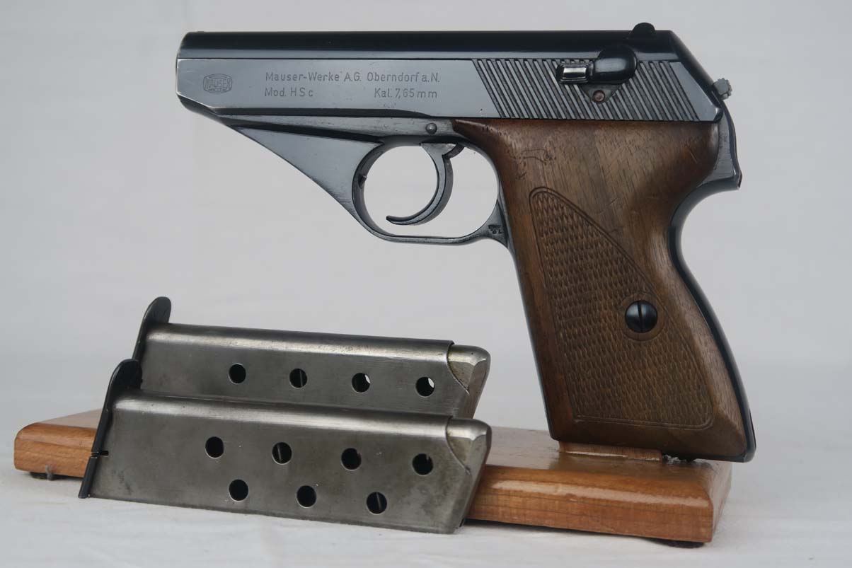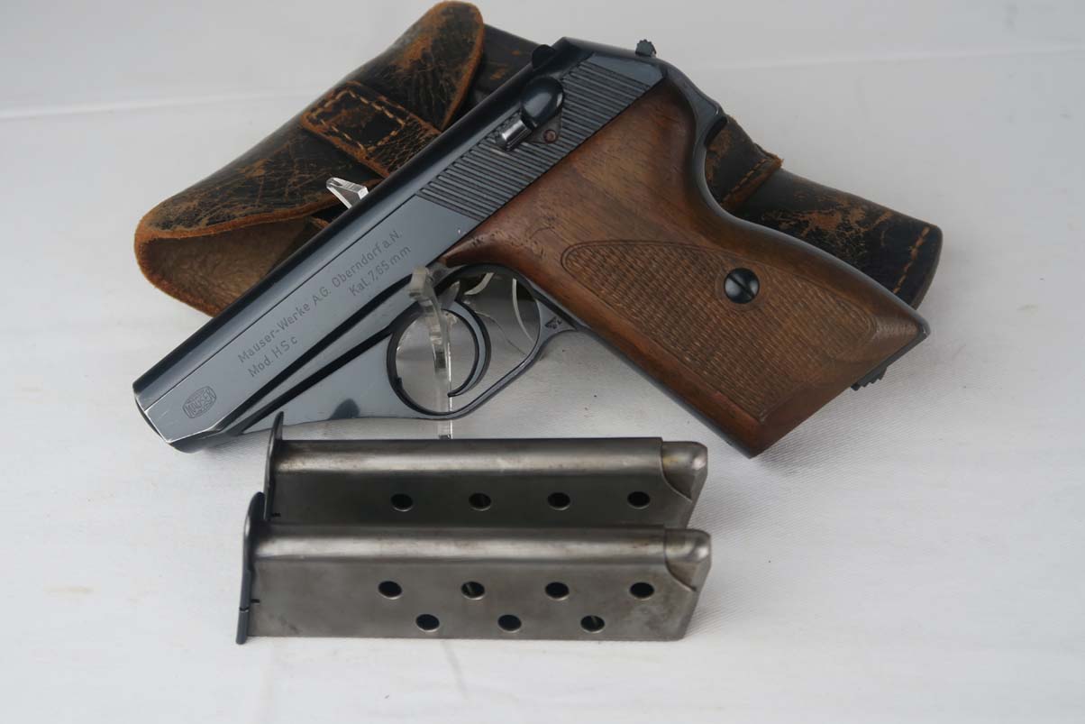 4/26/17 – This is a near-mint Mauser HSc that is marked for police issue.  It comes with a spare magazine and worn police-style holster.  The original high-polish finish is over 98%, with just minor edge and muzzle wear, and beautiful straps.  Grips show no major cracks or chips.  Both magazines are Mauser banner proofed on the base plate.  Holster proofs are shown in photos, and the belt loop is missing a few stitches.  Bore is minty.