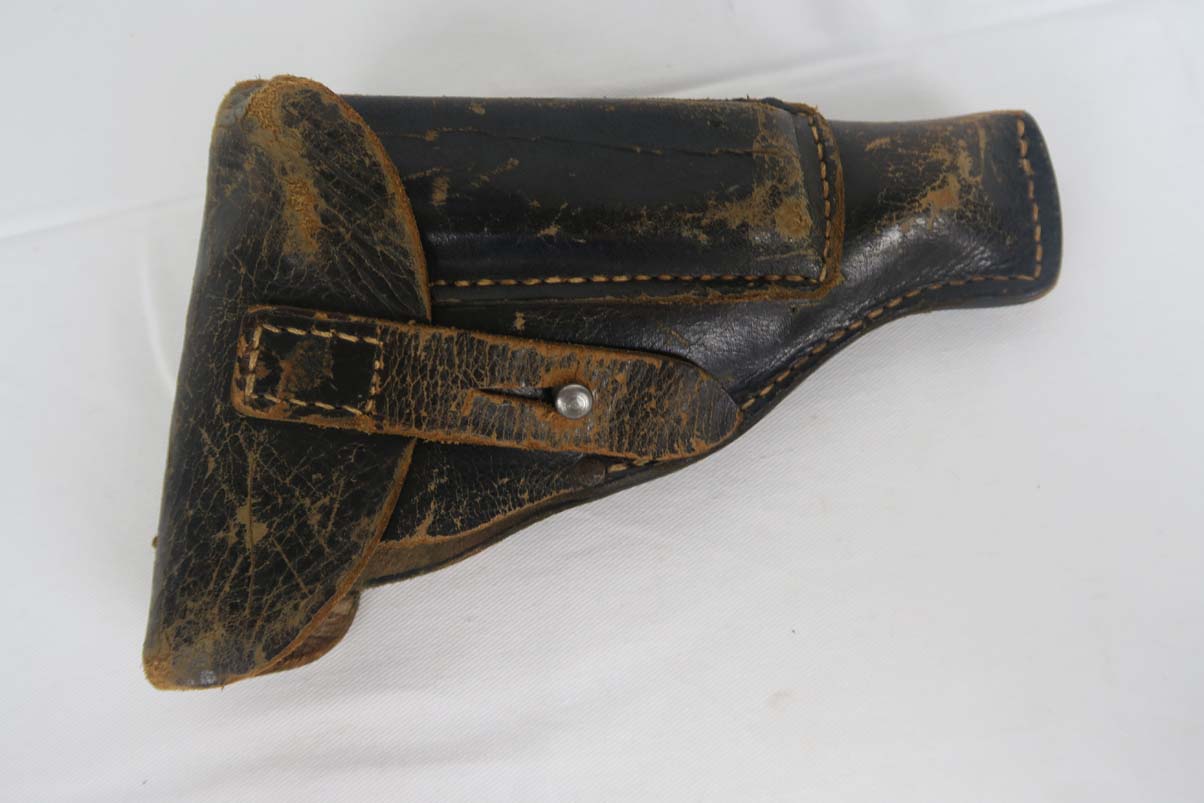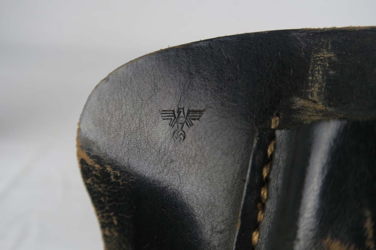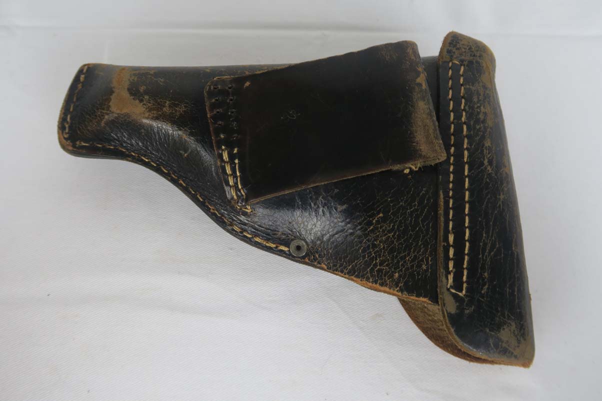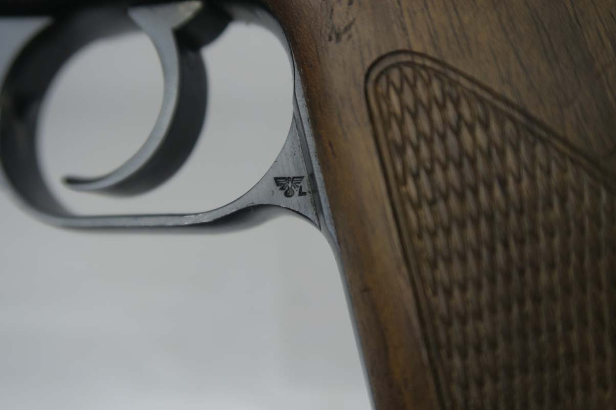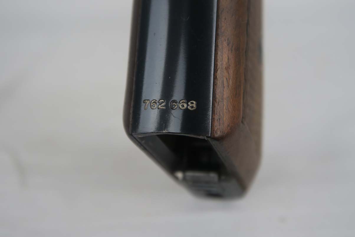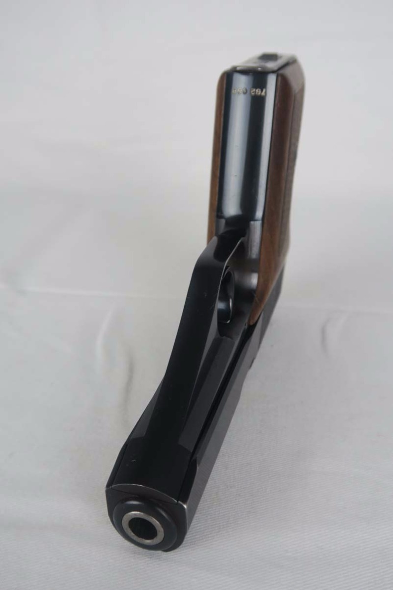 4/26/17 – This is a near-mint Mauser HSc that is marked for police issue.  It comes with a spare magazine and worn police-style holster.  The original high-polish finish is over 98%, with just minor edge and muzzle wear, and beautiful straps.  Grips show no major cracks or chips.  Both magazines are Mauser banner proofed on the base plate.  Holster proofs are shown in photos, and the belt loop is missing a few stitches.  Bore is minty.
