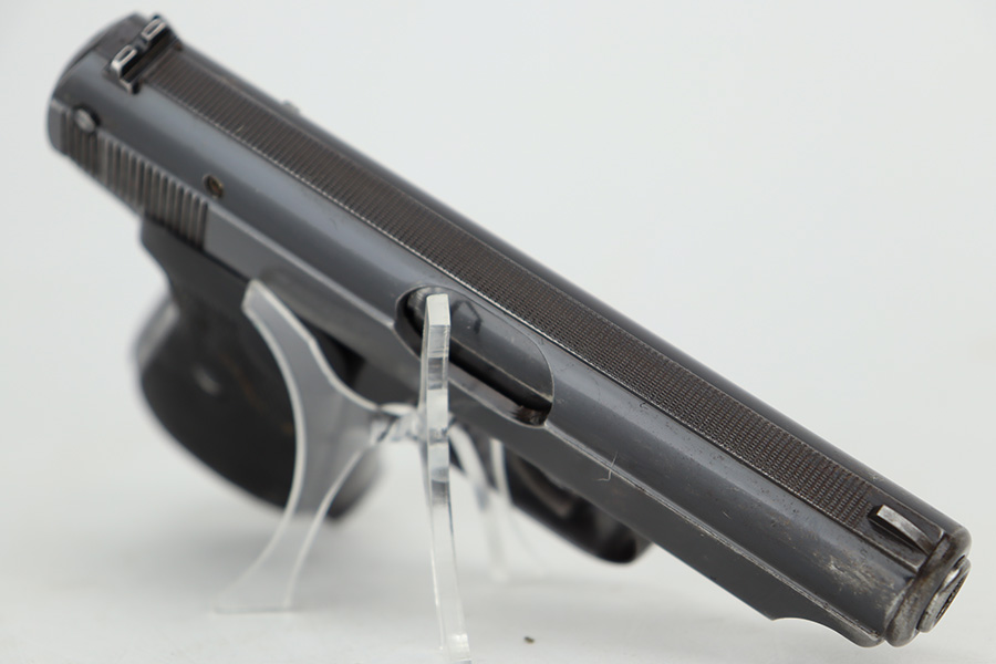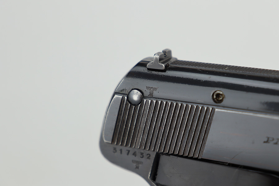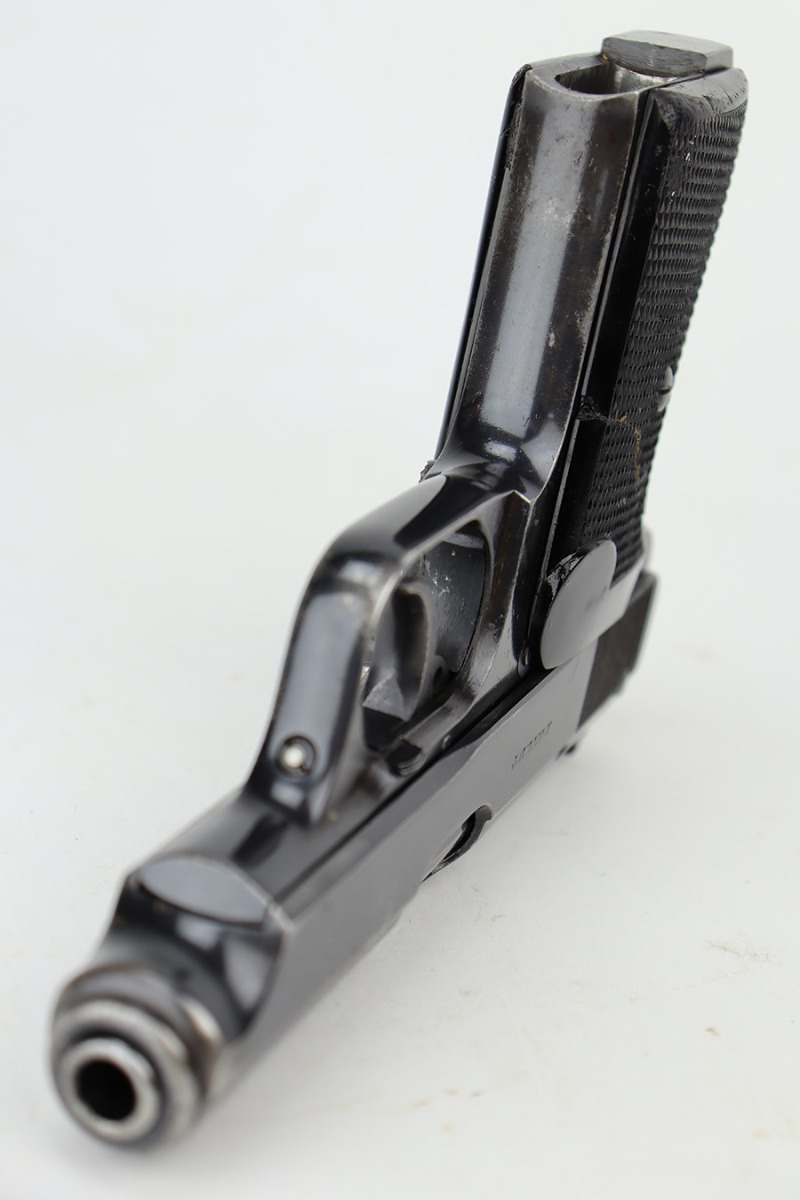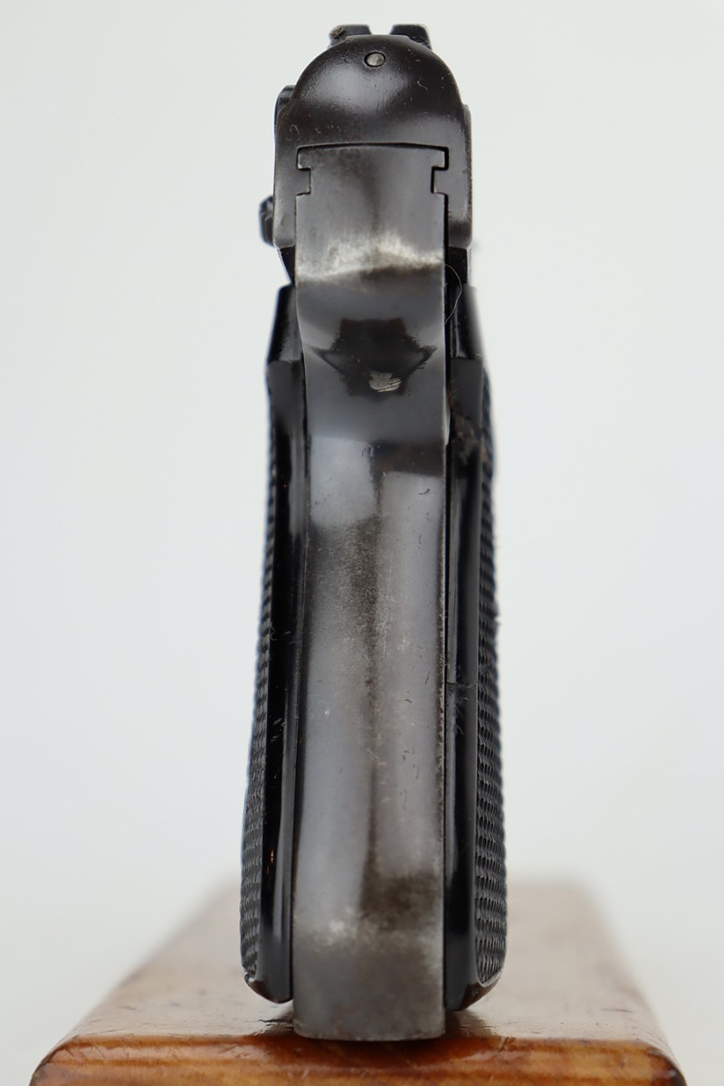 6/26/23 – This is a nice example of a Sauer 38h issued to the Nazi police force during WW2. This one is all matching and has a police “Eagle C” marking on the left side of the trigger guard. It has early features, such as a nice high polish finish and a checkered mag release button. It has retained roughly 85% of its original bluing. There is thinning on the grip straps and some light wear along the right side of the slide. But the most obvious sign of wear is the spotty discoloration along the left side of the slide. Fitted with period-correct black bakelite grips – noticeable cracks on the right side (repaired). Comes with one period-correct magazine. Mint bore.
